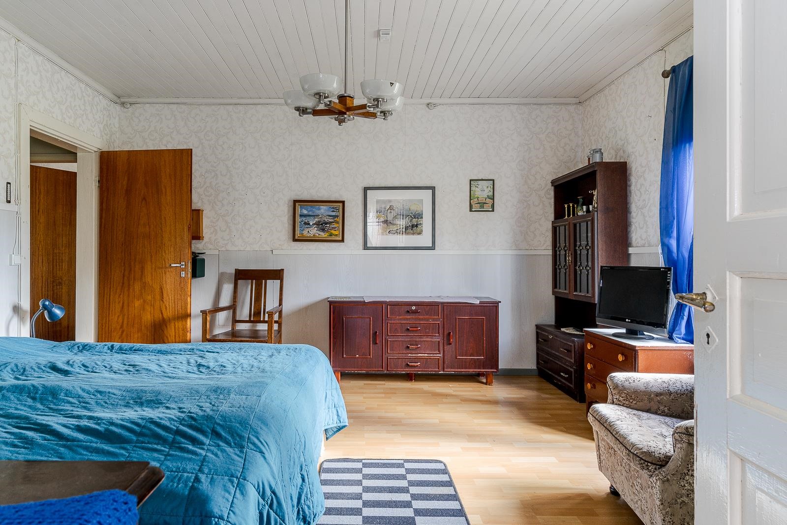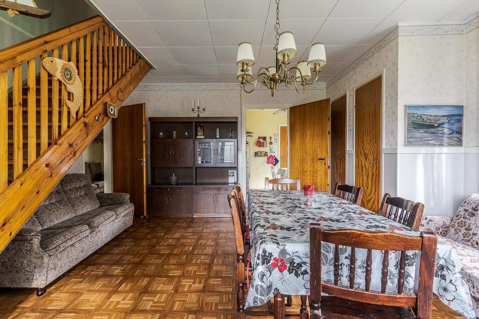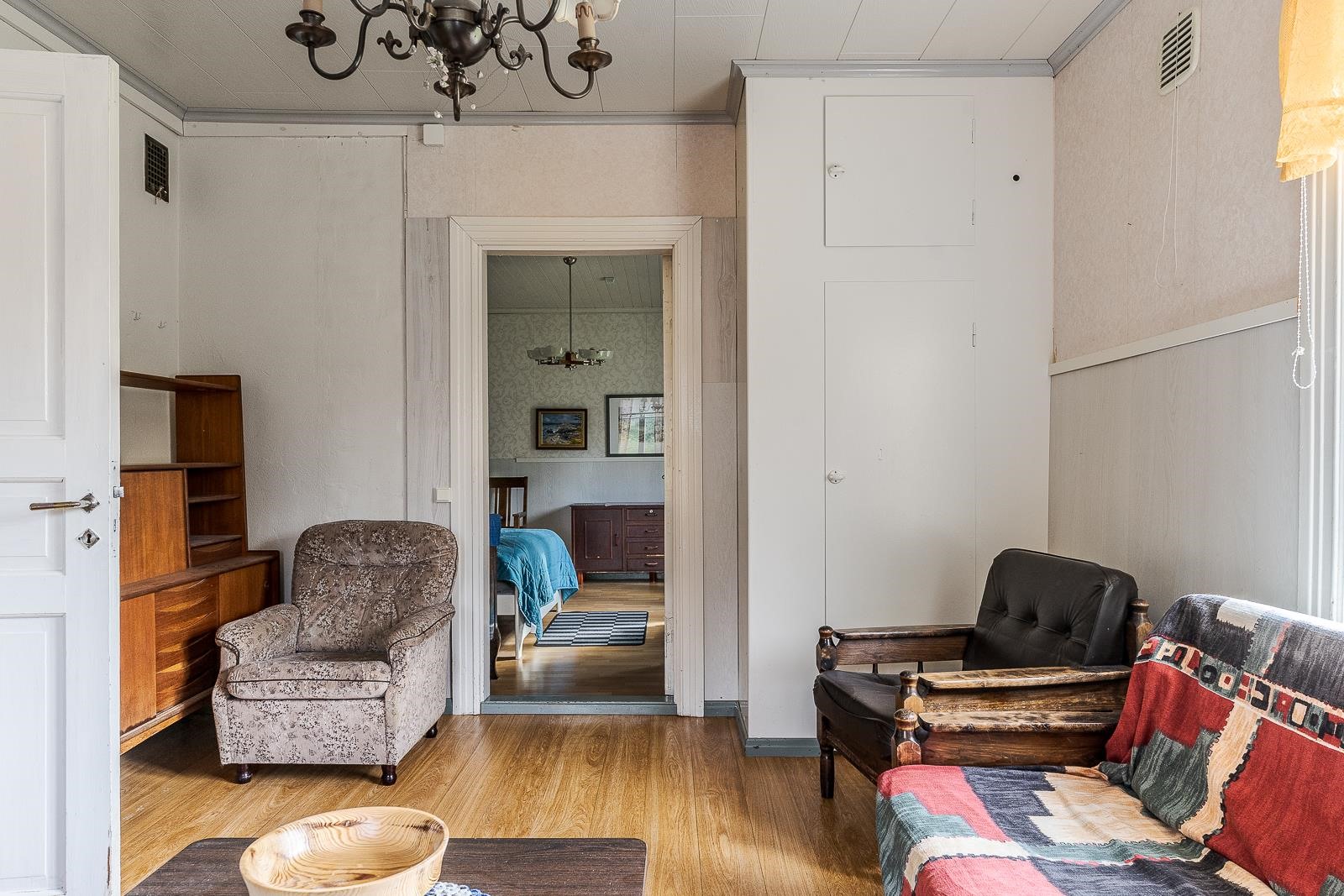 Keittiö: Muovimatto, maalatut seinät. Olohuone: Muovimatto, tapetti. Makuuhuone 1: Muovimatto, puolipaneeli/tapetti. Makuuhuone 2: Muovimatto, puolipaneeli/tapetti. Makuuhuone 3: Lautalattia, maalatut seinät. Kylpyhuone: Muovimatto. Eteinen: Muovimatto, maalatut seinät.
