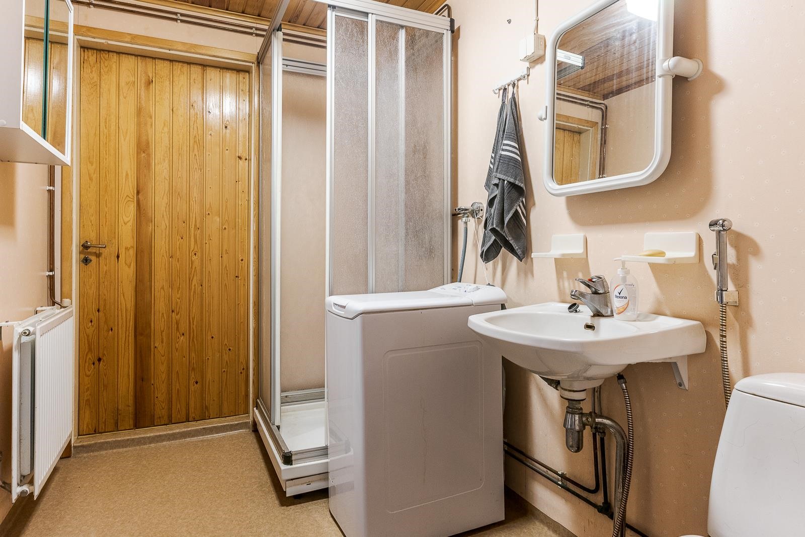 - Kylpyhuone, suihkukaappi, peilit, peilikaappi, pesukoneliitäntä.