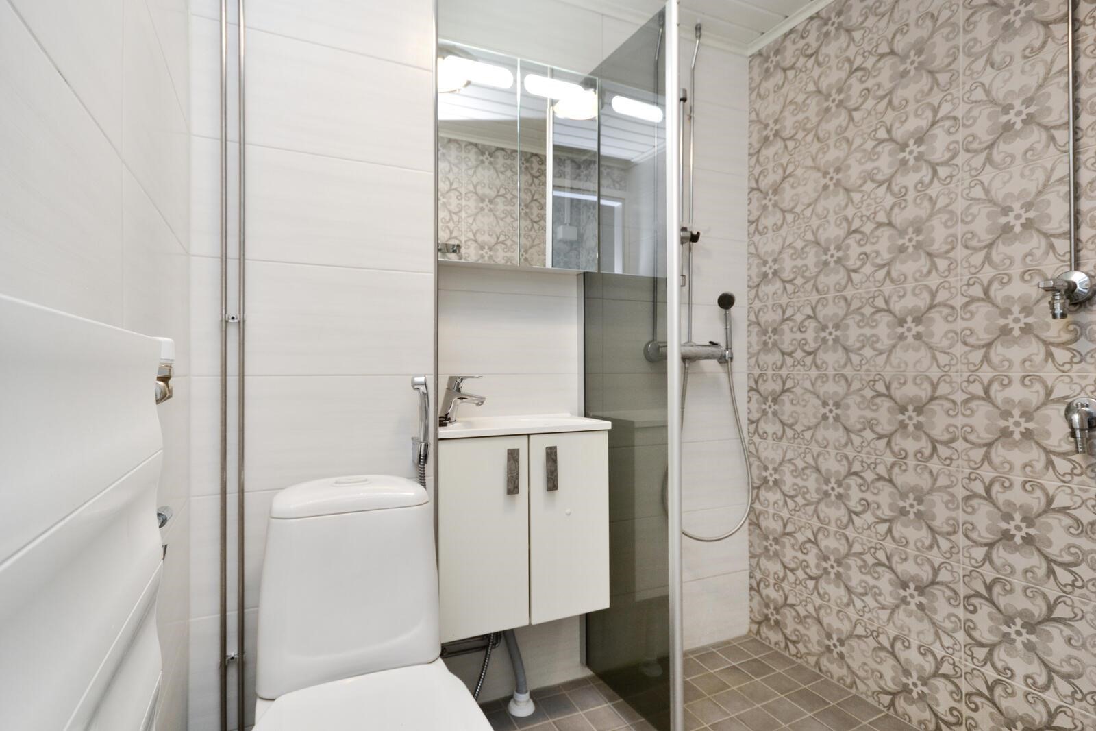 - Suihku, allaskaappi, pesukoneliitäntä, kiinteät valaisimet.