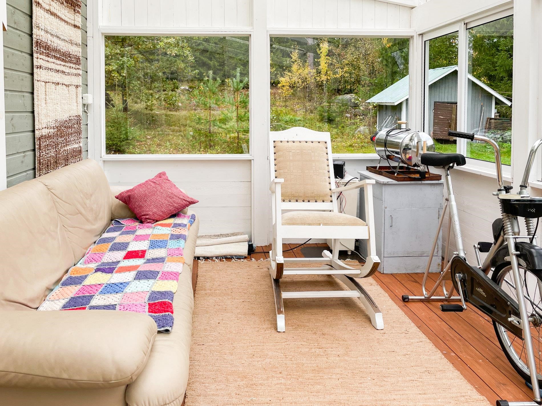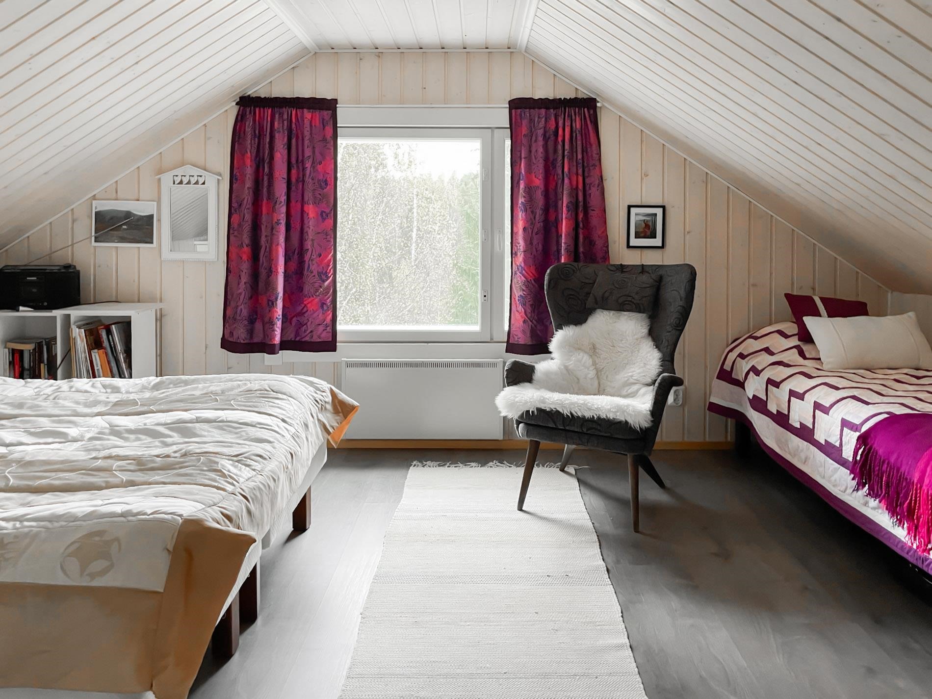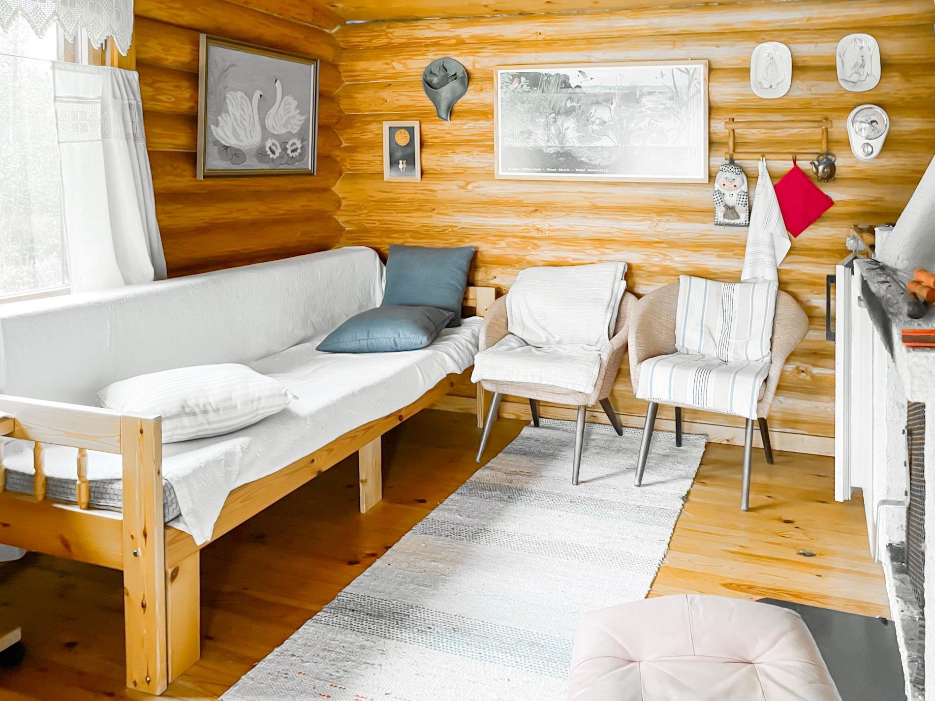 Keittiö: Lautalattia, hirsi / paneeli seinät. Olohuone: Lautalattia / hirsiseinät. Makuuhuone 1: Laminaatti lattiassa ja paneelia seinissä. Makuuhuone 2: Laminaatti lattiassa ja paneelia seinissä. Kylpyhuone: laattaa lattiassa.
