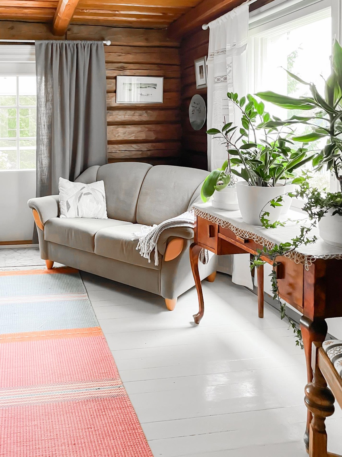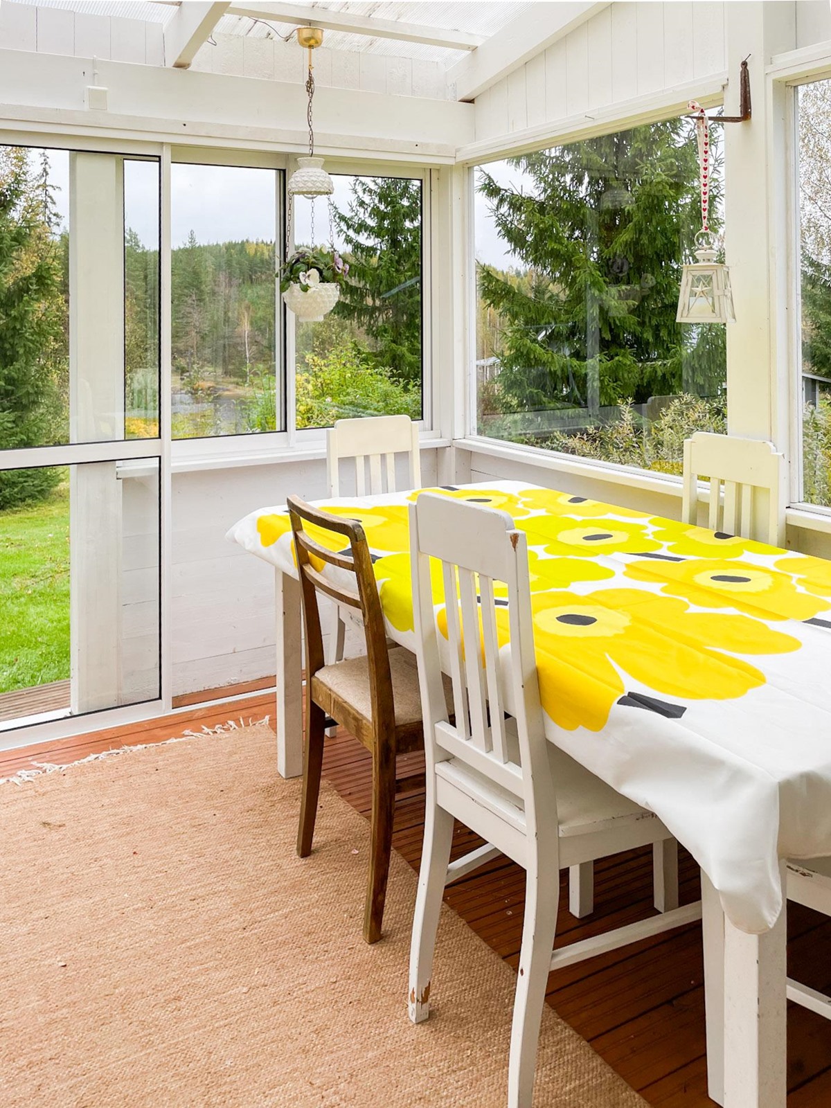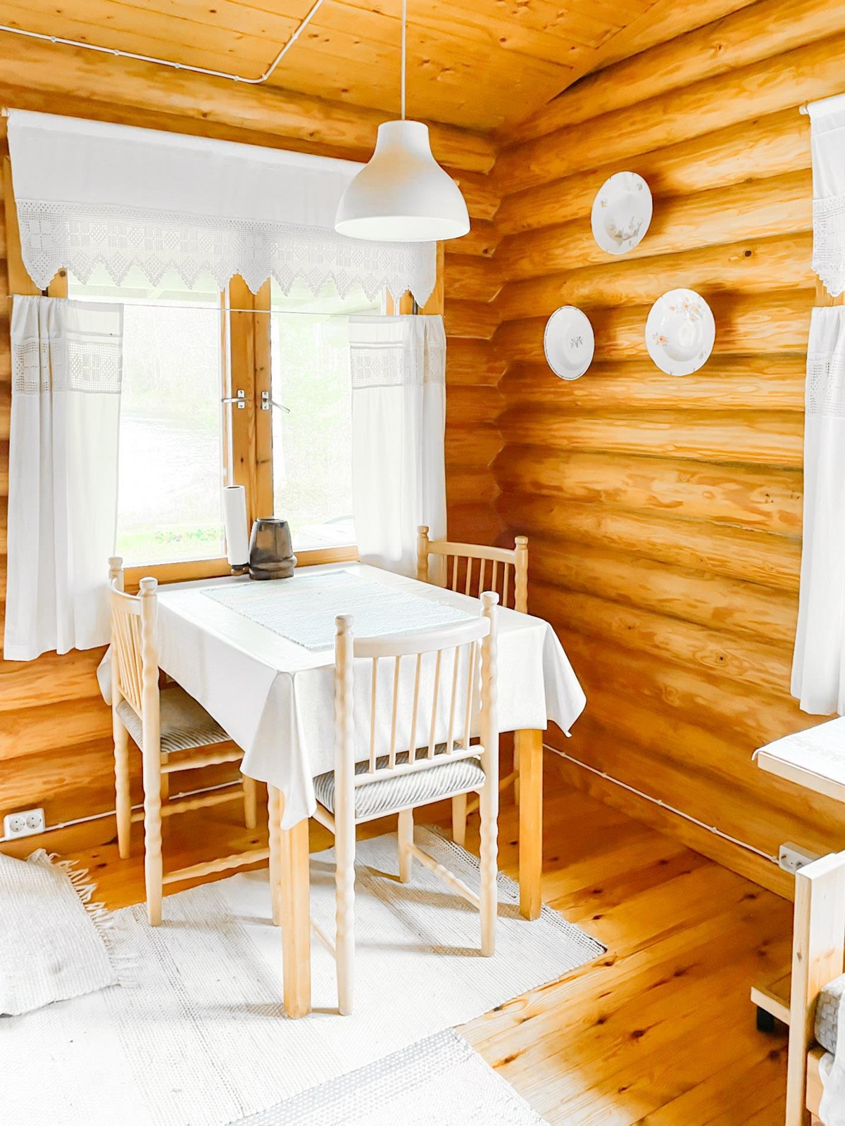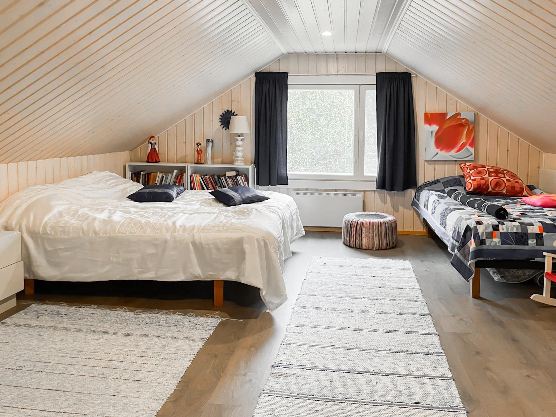 Keittiö: Lautalattia, hirsi / paneeli seinät. Olohuone: Lautalattia / hirsiseinät. Makuuhuone 1: Laminaatti lattiassa ja paneelia seinissä. Makuuhuone 2: Laminaatti lattiassa ja paneelia seinissä. Kylpyhuone: laattaa lattiassa.