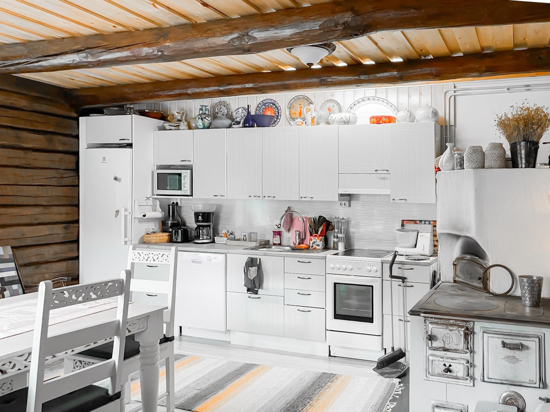 - Jääkaappi, keraaminen liesi, liesituuletin, astianpesukone, kaapistot vaaleat, kiinteät valaisimet.