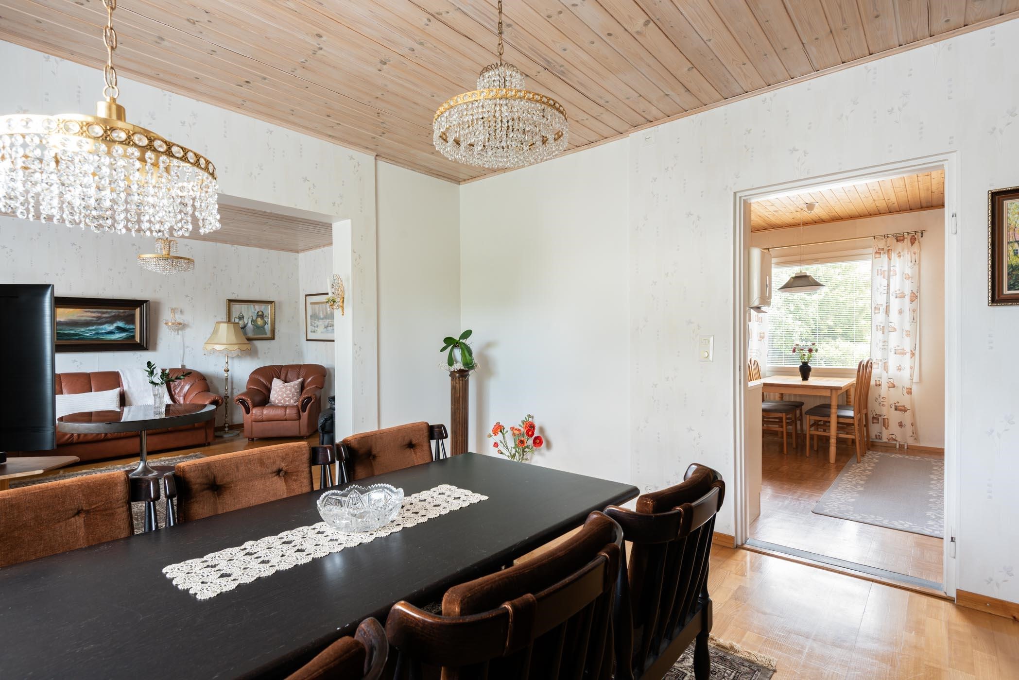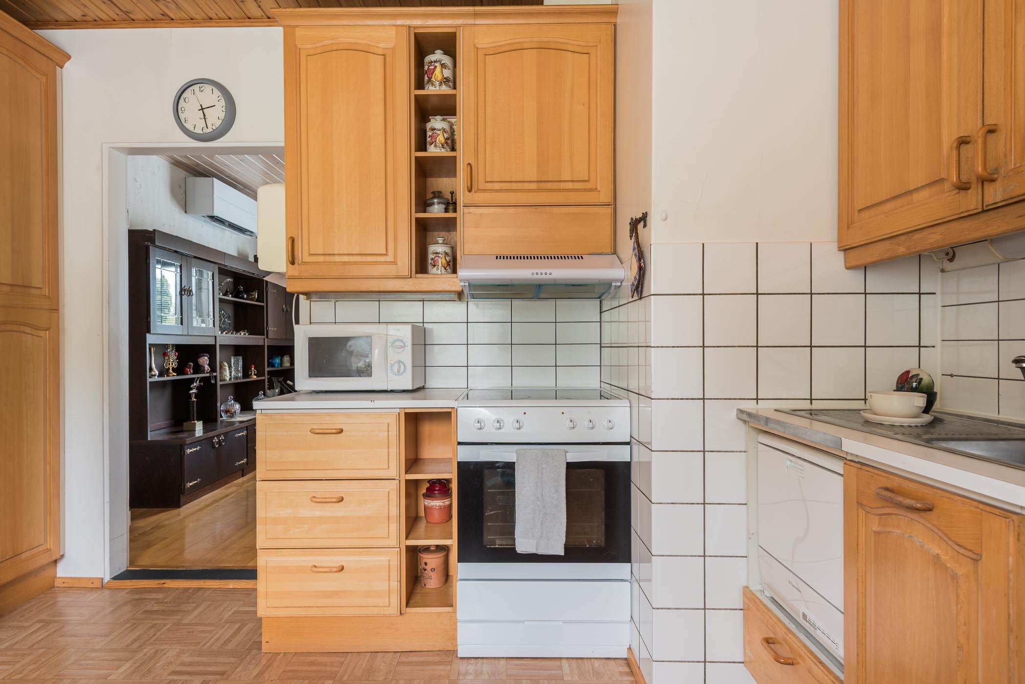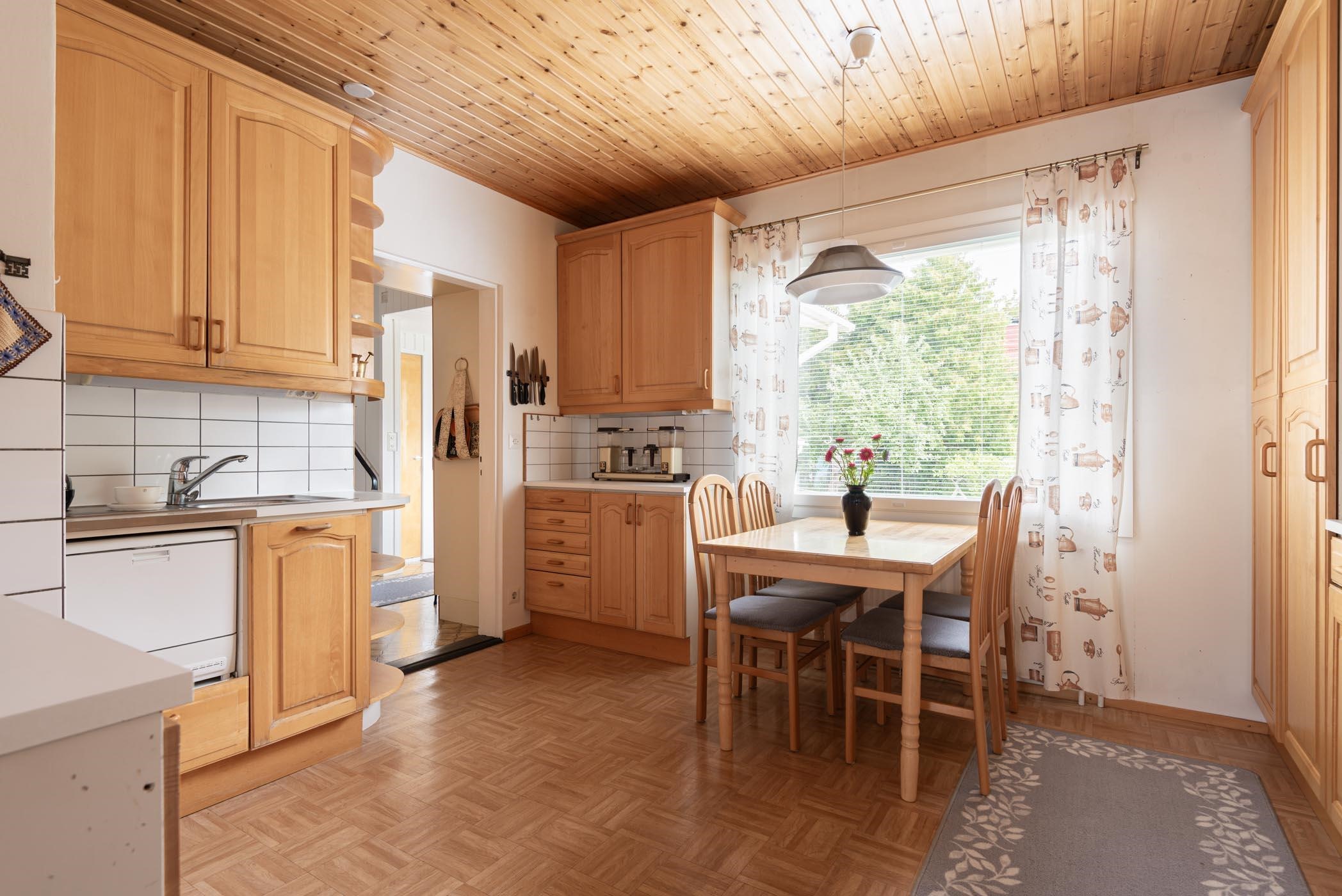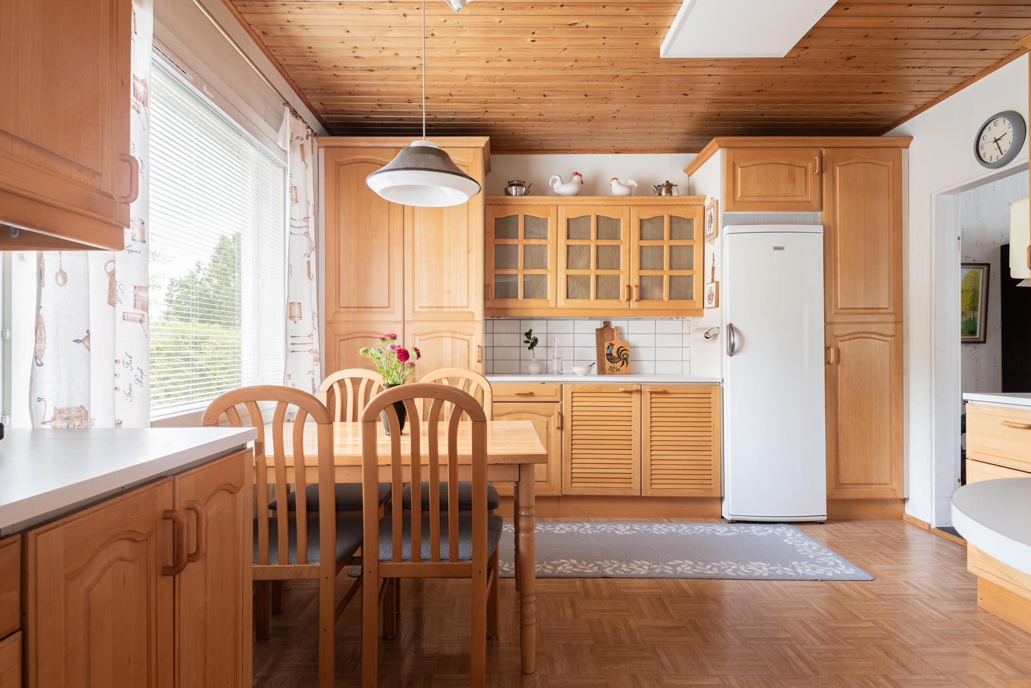 - Jääkaappi (n. 2014), pakastekaappi (pakastearkku, kellarissa), keraaminen liesi (n. 2018), liesituuletin (hormiin, 2023), astianpesukone, kaapistot, kiinteät valaisimet. Keittiö on remontoitu 1987.