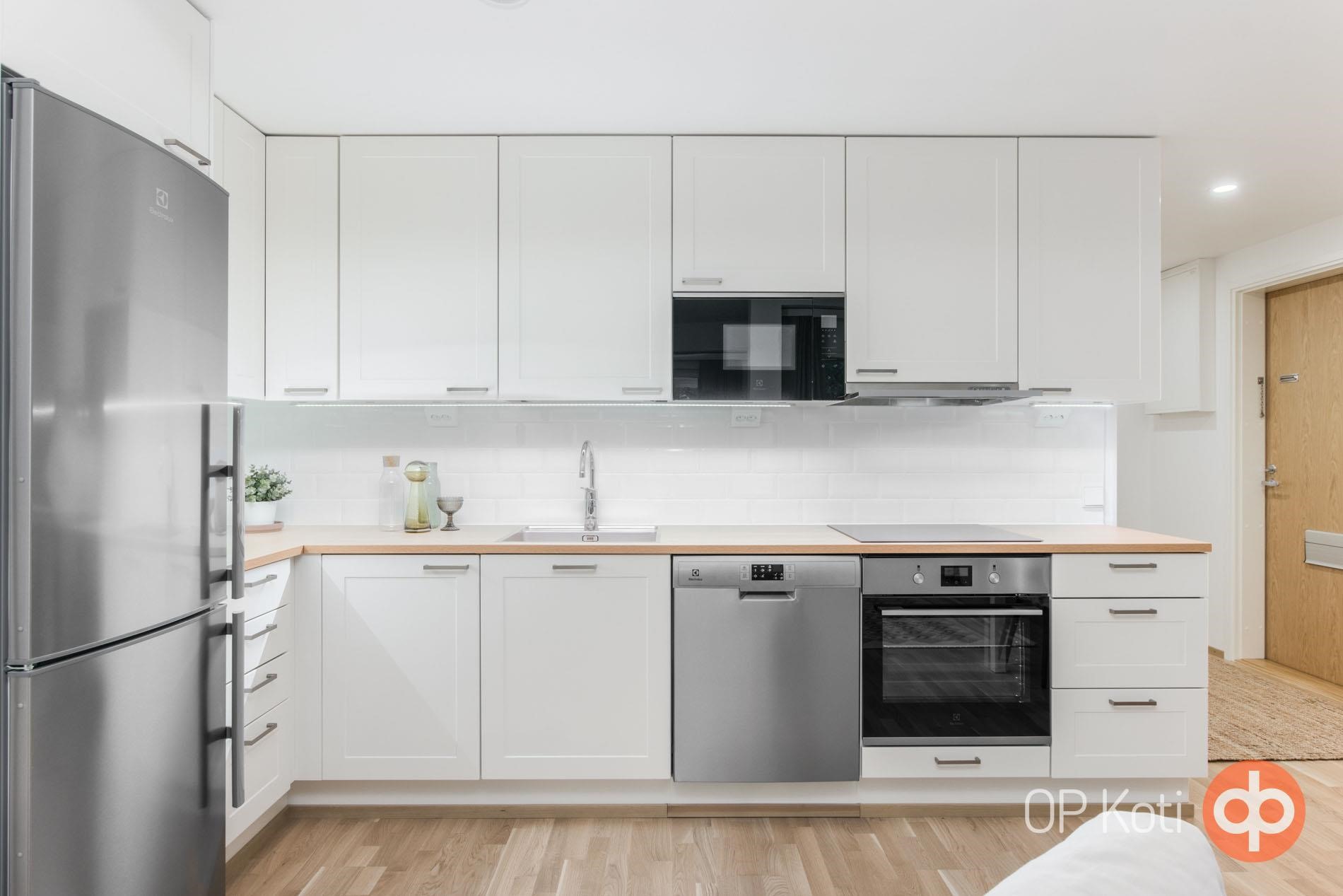 - Jääkaappi, liesitaso keraaminen taso, liesituuletin, mikroaaltouuni, astianpesukone, kaapistot, kiinteät valaisimet.