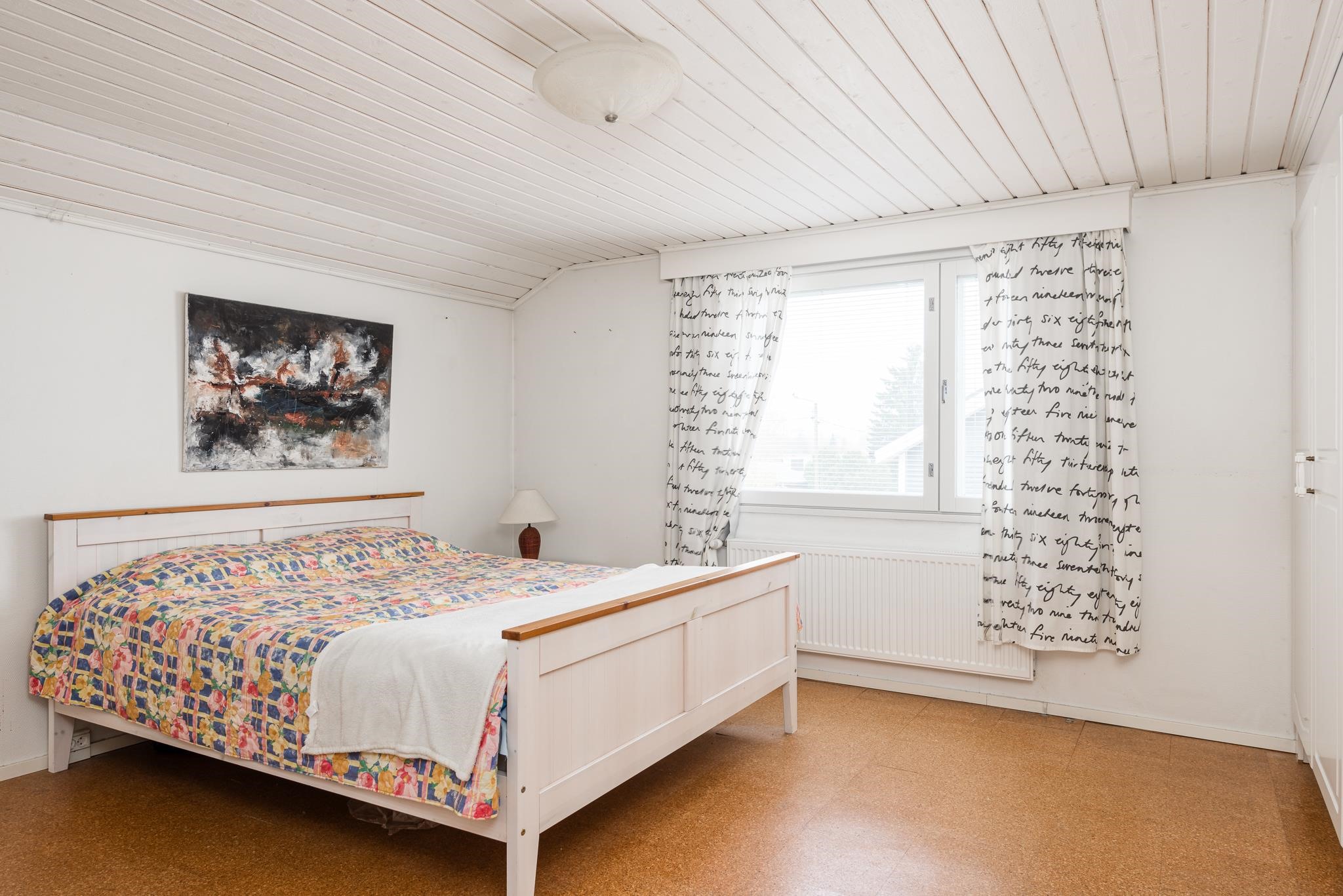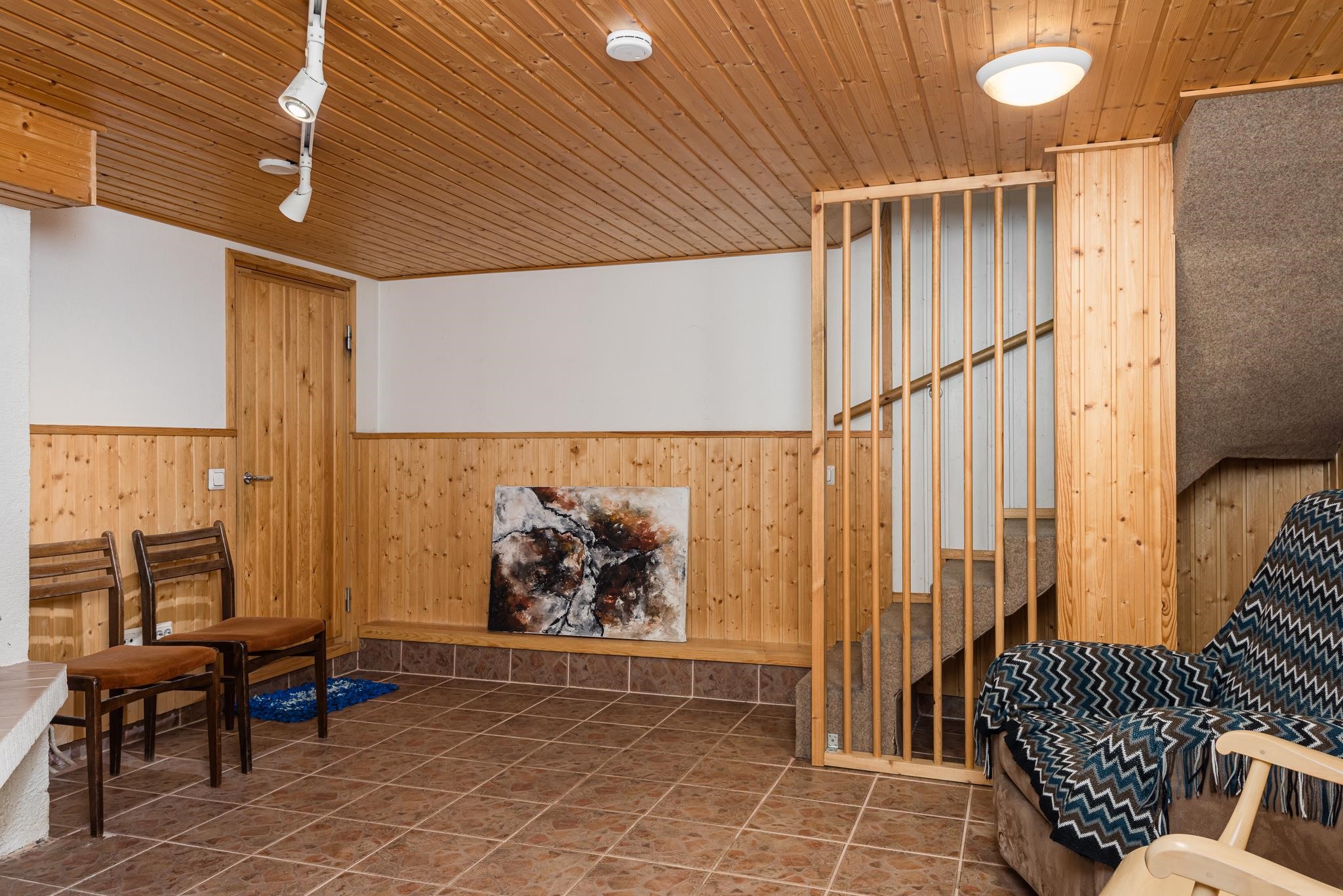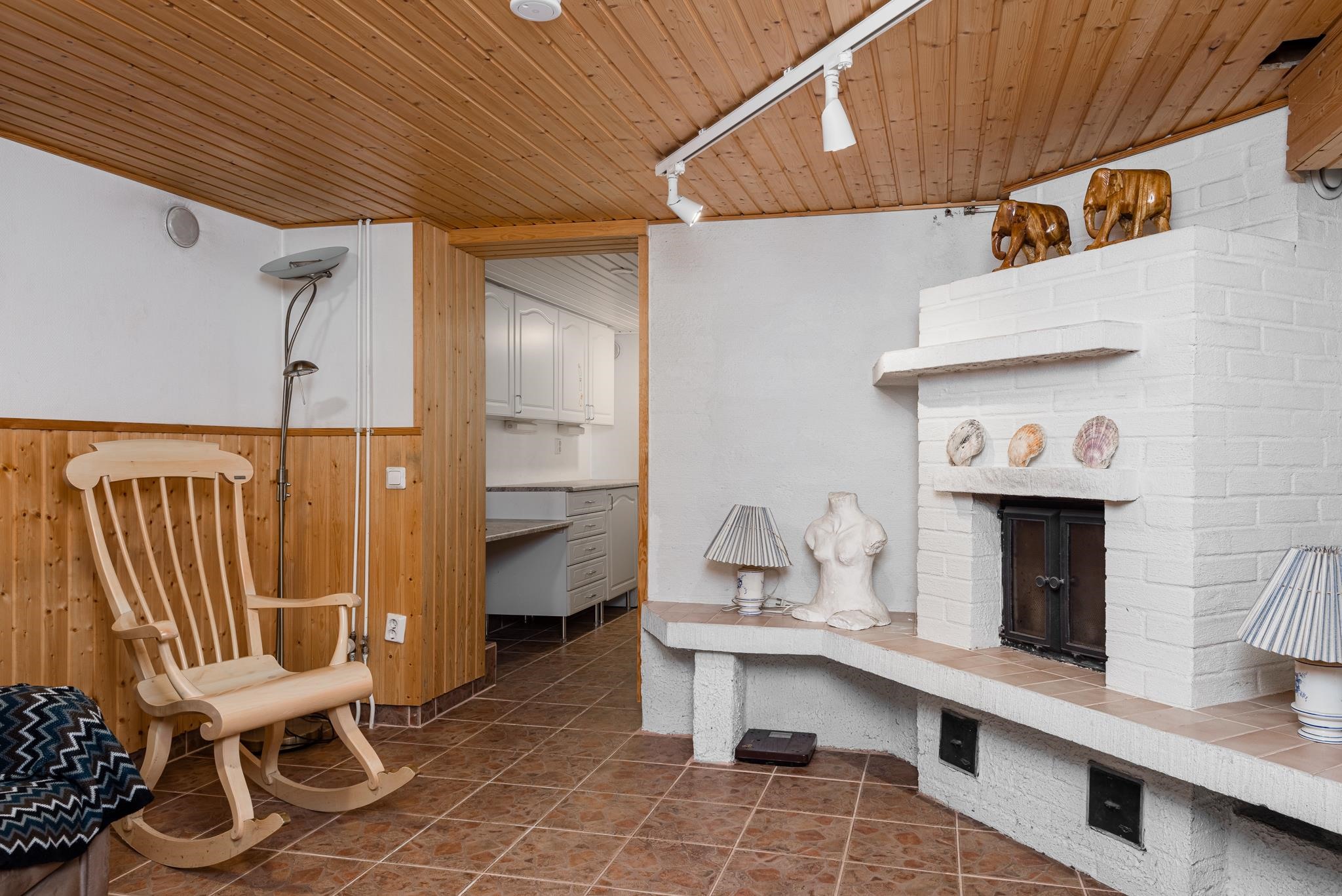 Keittiö: Muovimatto, maalattu tapetti. Olohuone: Lauta, tapetti. Makuuhuone 1: Muovimatto, tapetti. Makuuhuone 2: Korkki, tapetti. Makuuhuone 3: Laatta, tapetti. Sauna: Laatta, paneeli. Kylpyhuone: Laatta. Eteinen: Muovimatto. Wc: Laatta.