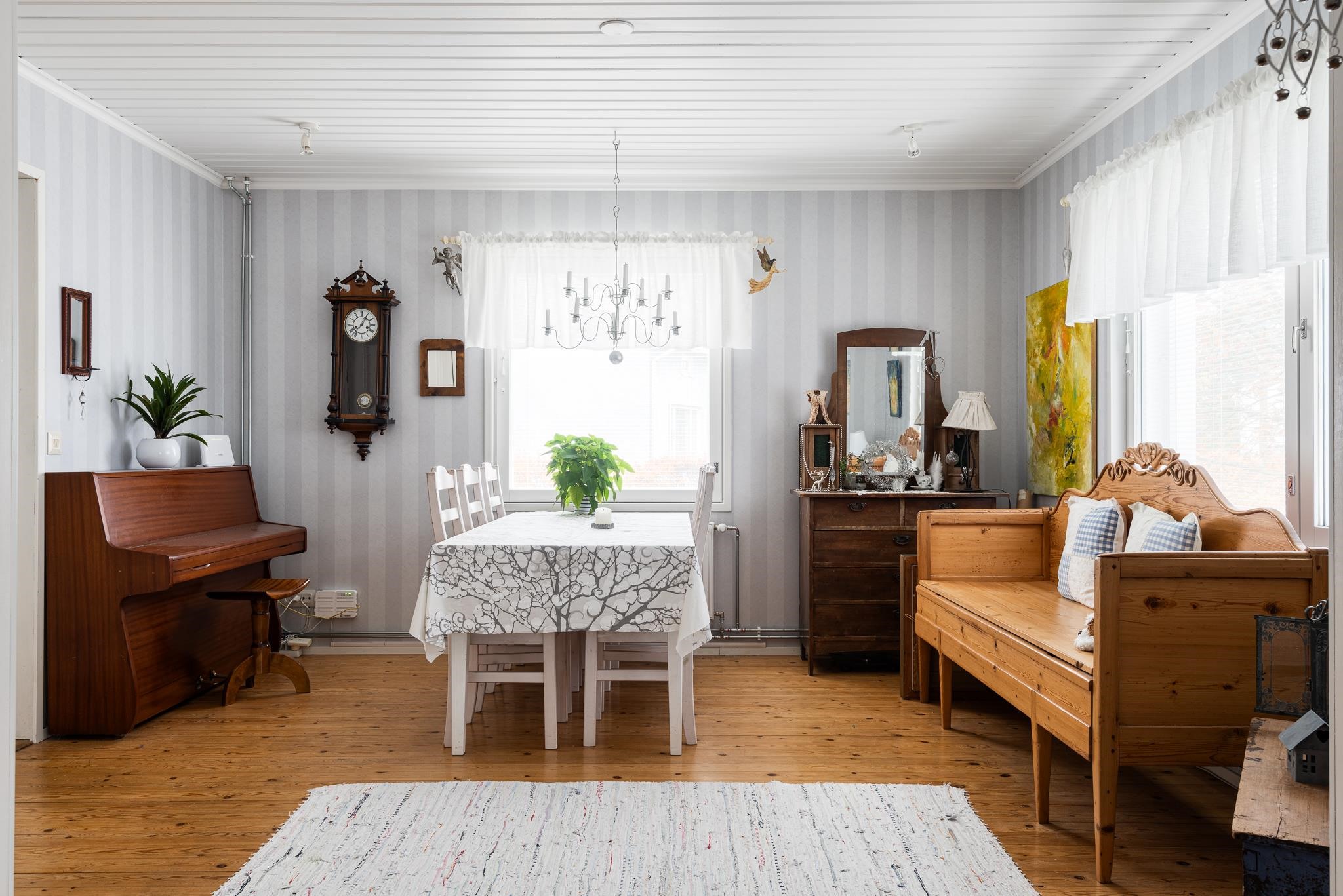 Ruokailuhuoneen, olohuoneen, eteisen ja keittiön katot ja eteisen seinät maalattu valkoisiksi 2010-2011, ruokailuhuone ja olohuone tapetoitu 2010