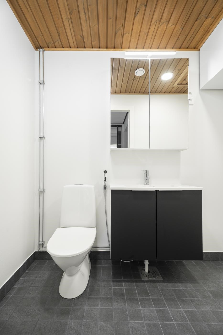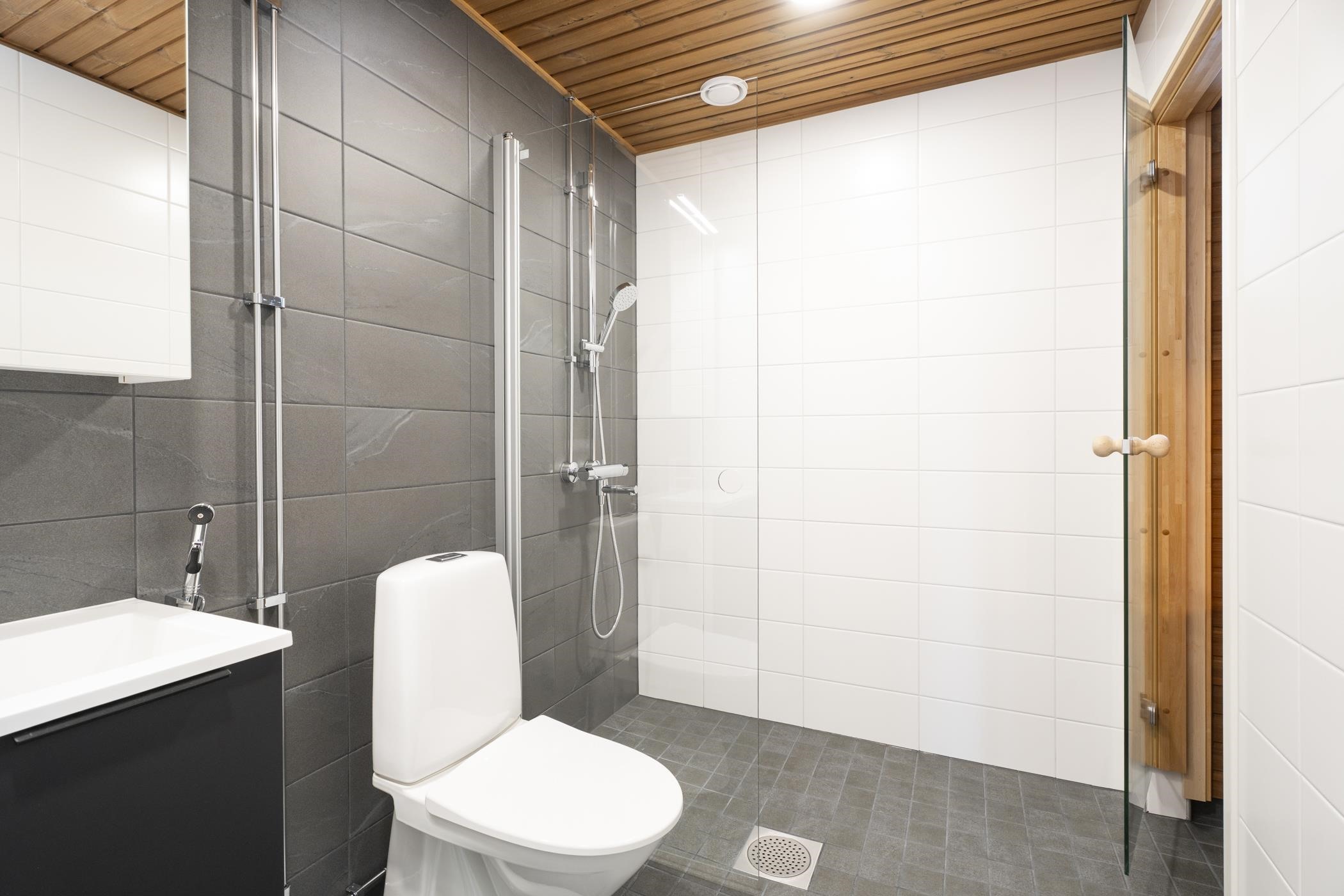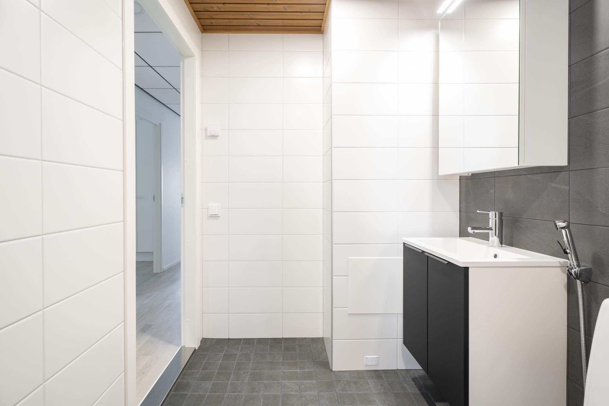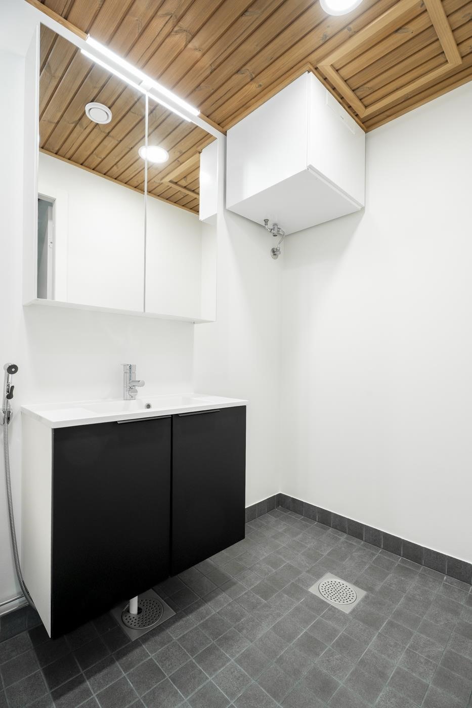 - Kylpyhuoneen lattiat ja seinät ovat laatoitettuja, katto paneloitu. Kylpyhuoneessa on tasoallas ja pesuallaskaappi sekä sen yläpuolella peilikaappi. Erillis-wc:ssä on tasoallas ja pesuallaskaappi. Erillis-wc:n ja kodinhoitohuoneen lattiat ovat laatoitettuja, seinät ovat maalattuja. Saunan lattia on laatoitettu, seinät ja katto paneloituja. Saunan ovi on kokolasinen.