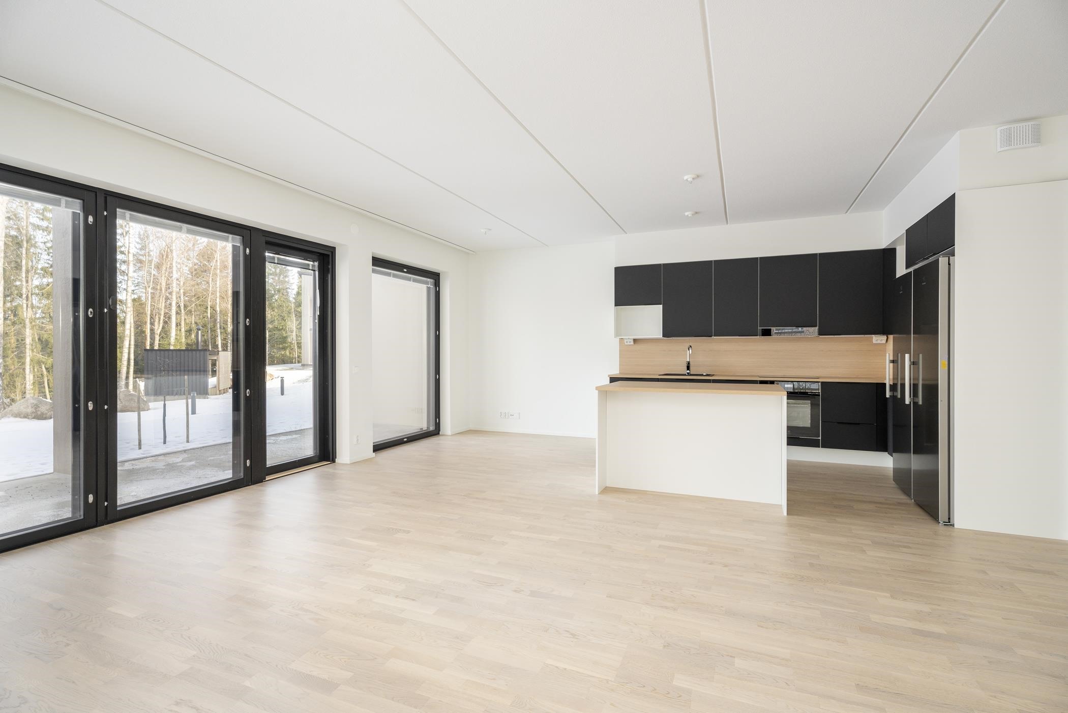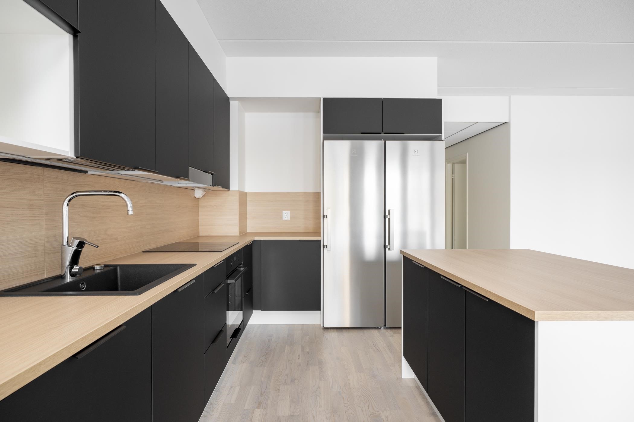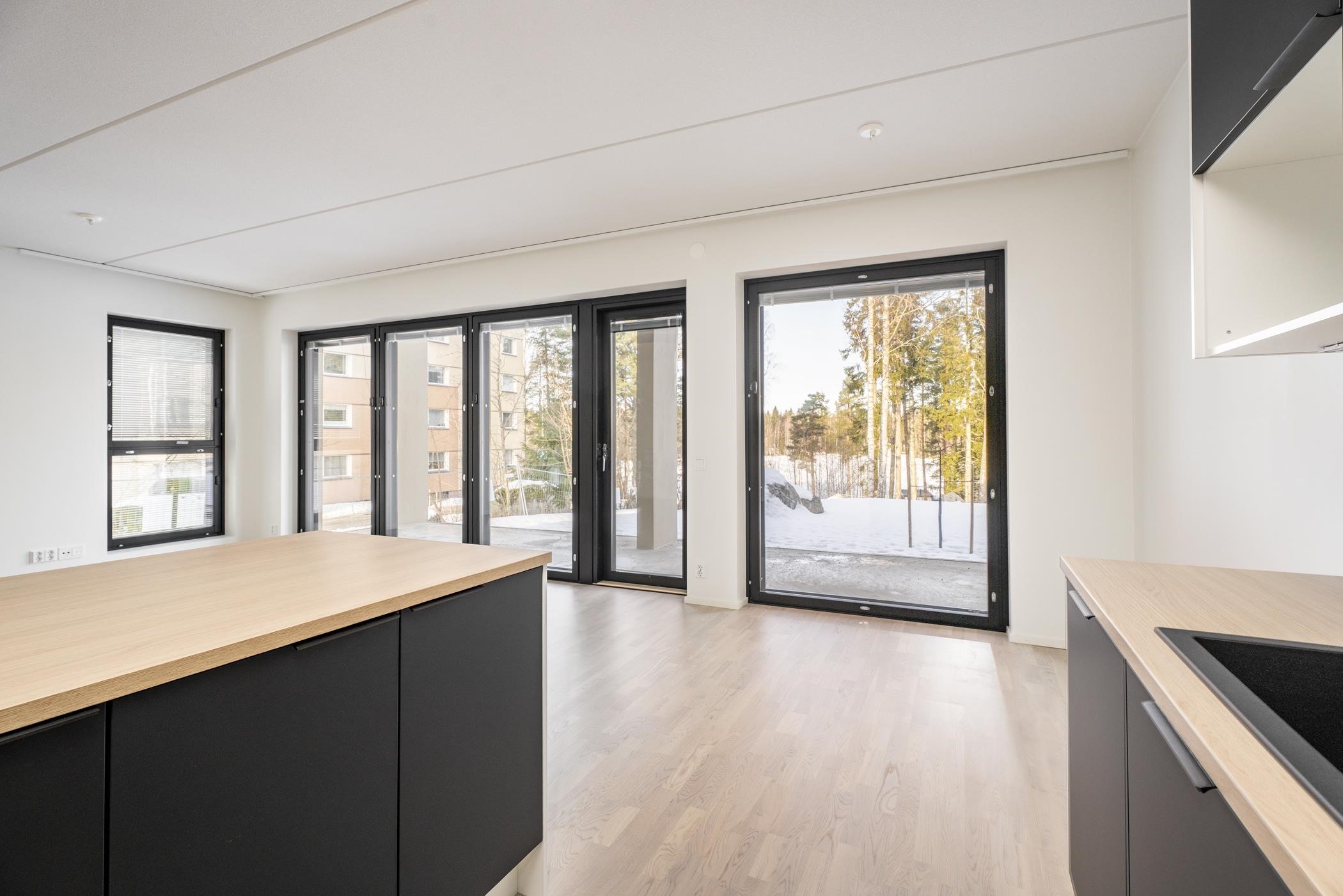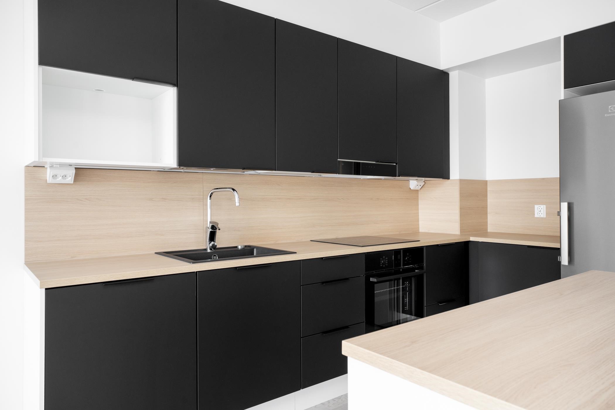 - Keittiöissä on erillisuuni, induktioliesitaso ja astianpesukone. 2h+kt asunnoissa on jää-pakastinkaappi. 3h+kt asunnoissa on erilliset jääkaappi ja pakastinkaappi. Keittiön pöytätaso on laminaattitaso, johon on kiinnitetty valutasollinen 1-altainen rst-allas tai komposiittiallas. Keittiössä on tilavaraus mikroaaltouunille.