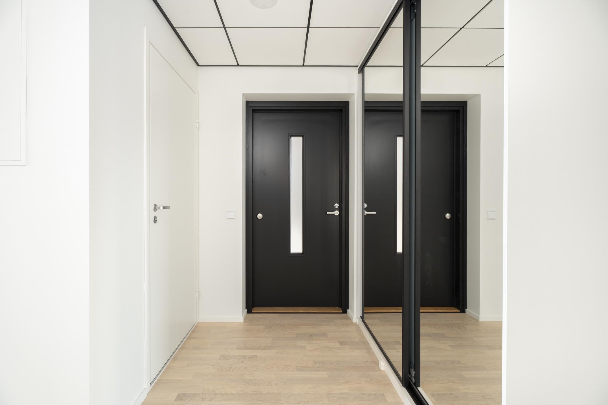 Olohuoneessa, makuuhuoneissa, keittiössä, eteisessä ja vaatehuoneessa on parkettilattiat, seinät ovat maalattuja.