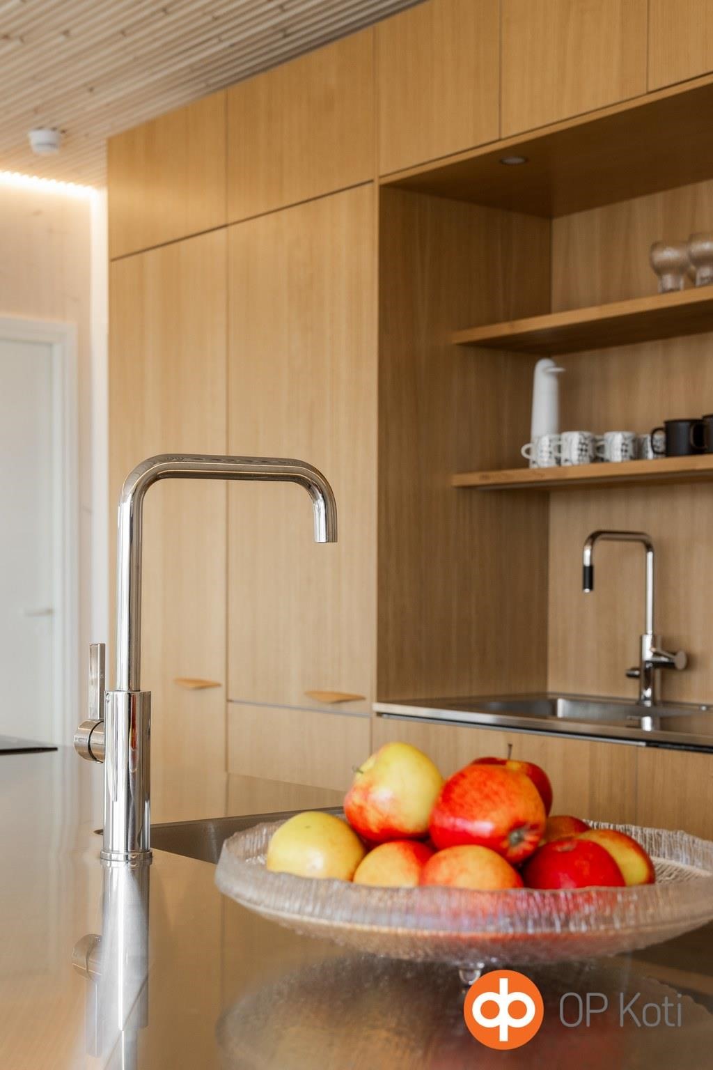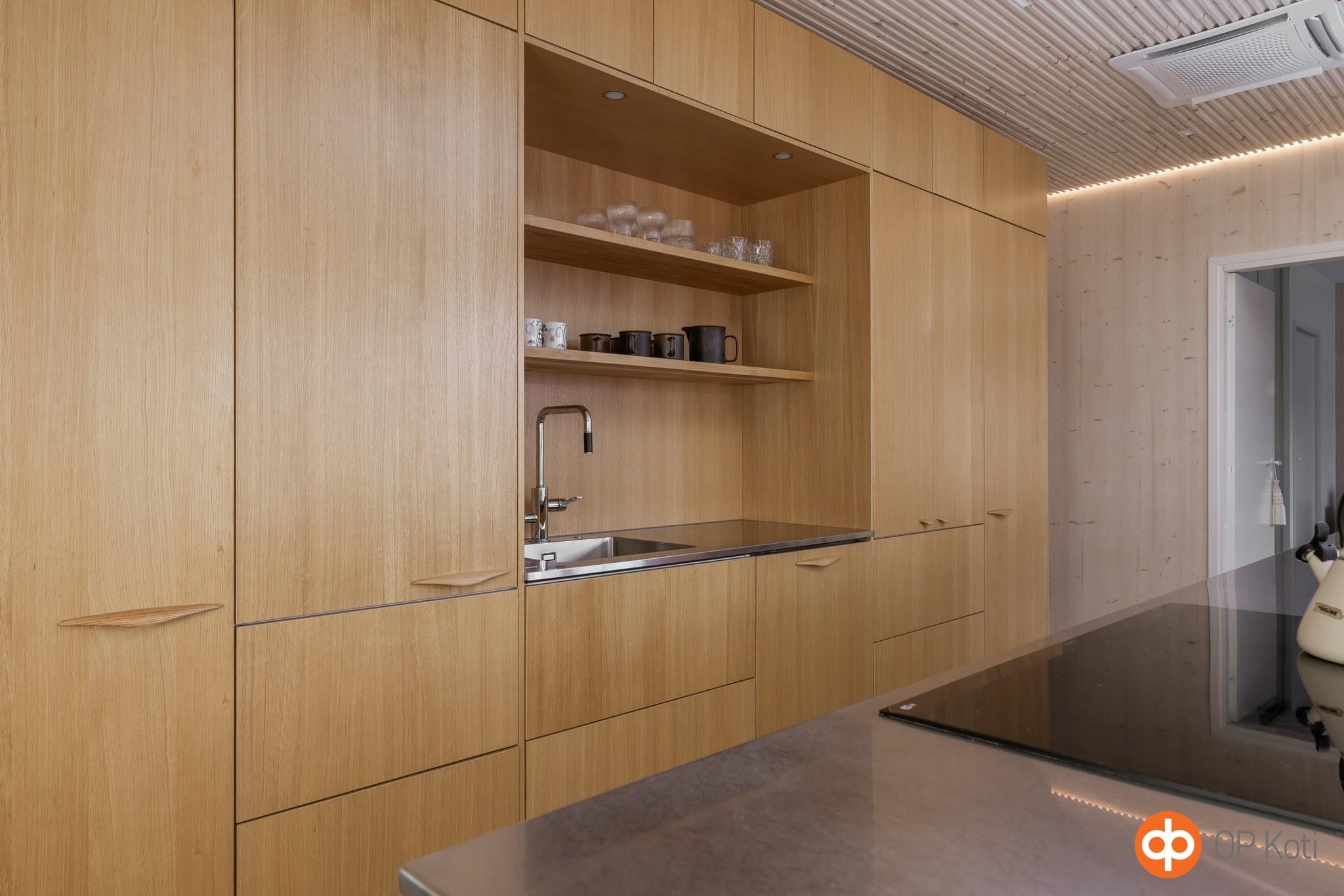 - Jääkaappi (integroitu), pakastekaappi (integroitu), erillisuuni, liesitaso, induktioliesi, liesituuletin (kattoon integroitu), mikroaaltouuni uunin toiminto, astianpesukone, kaapistot, kiinteät valaisimet, pöytätasojen materiaali ruostumaton teräs.