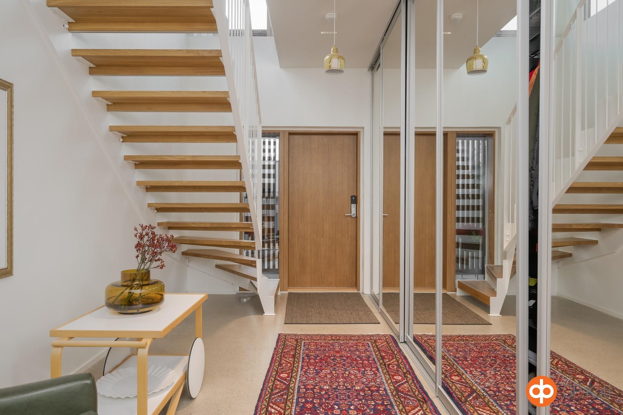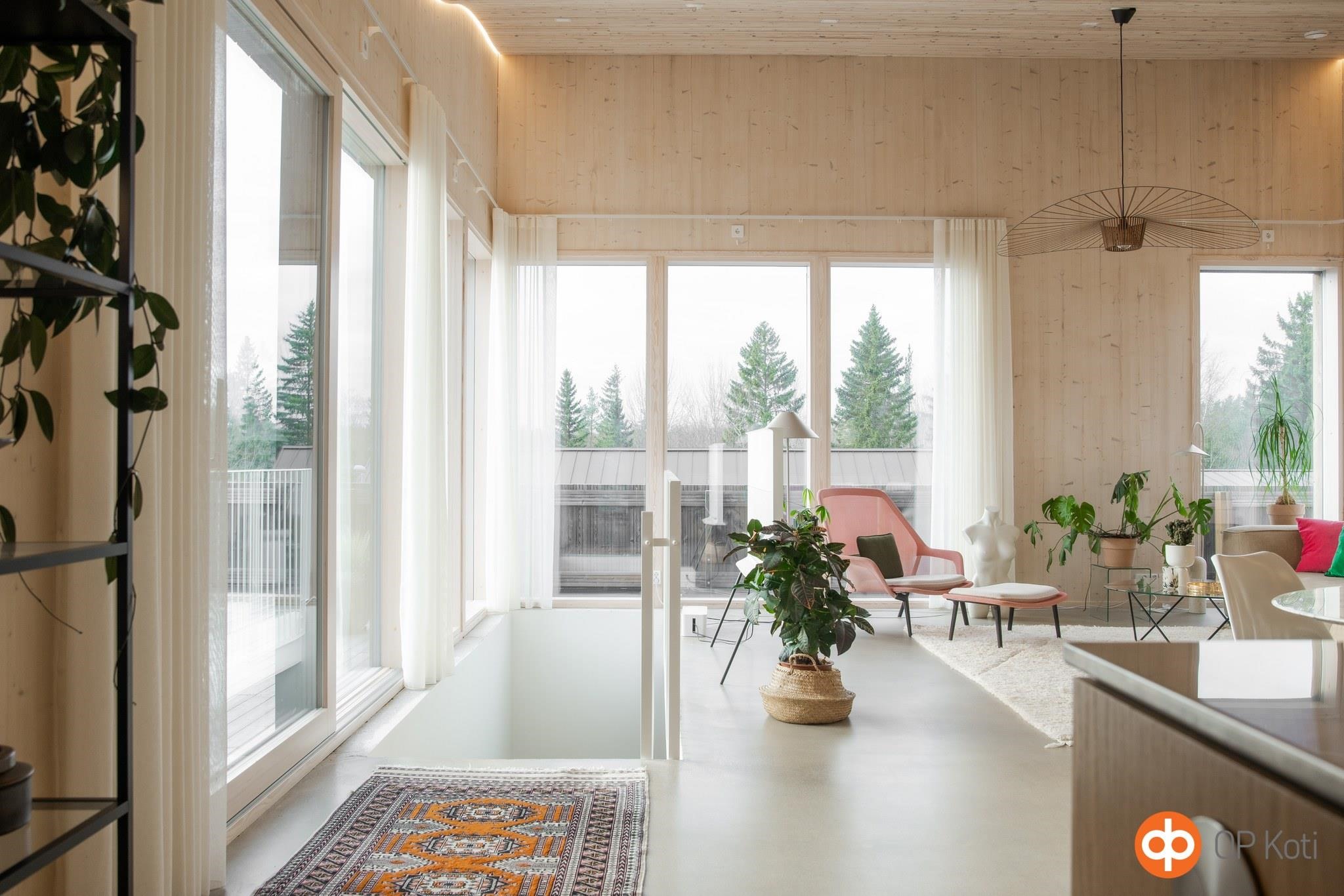 Tekniset ratkaisut ovat olleet tärkeässä roolissa suunnittelussa. Rakennuksen runko koostuu CLT-elementeistä ja maanalaiset osat on toteutettu valuharkoista. Energiatehokkuutta on huomioitu maalämmön ja maaviilennyksen avulla, ja isot ikkunat on mitoitettu tarkasti auringon liikkeiden ja parhaiden näkymien mukaan. Tämä koti on loistava valinta niille, jotka arvostavat laadukasta ja ainutlaatuista asumista. Talo sopii erinomaisesti esimerkiksi taiteilijoille, suunnittelijoille ja muille luovan alan ammattilaisille, jotka haluavat asua inspiroivassa ympäristössä. Se sopii myös perheille, jotka arvostavat yksityisyyttä ja rauhaa, mutta samalla haluavat asua modernissa, kodikkaassa ja tyylikkäässä kodissa. Myös kodin pintamateriaalit, laitteet ja muut ratkaisut on valittu huolella.