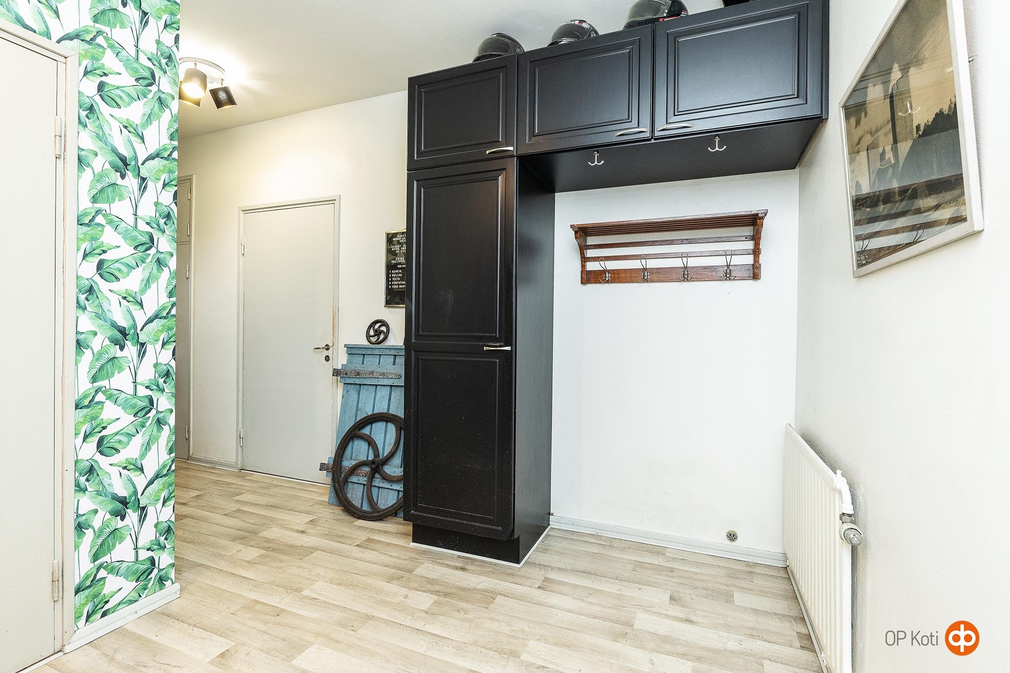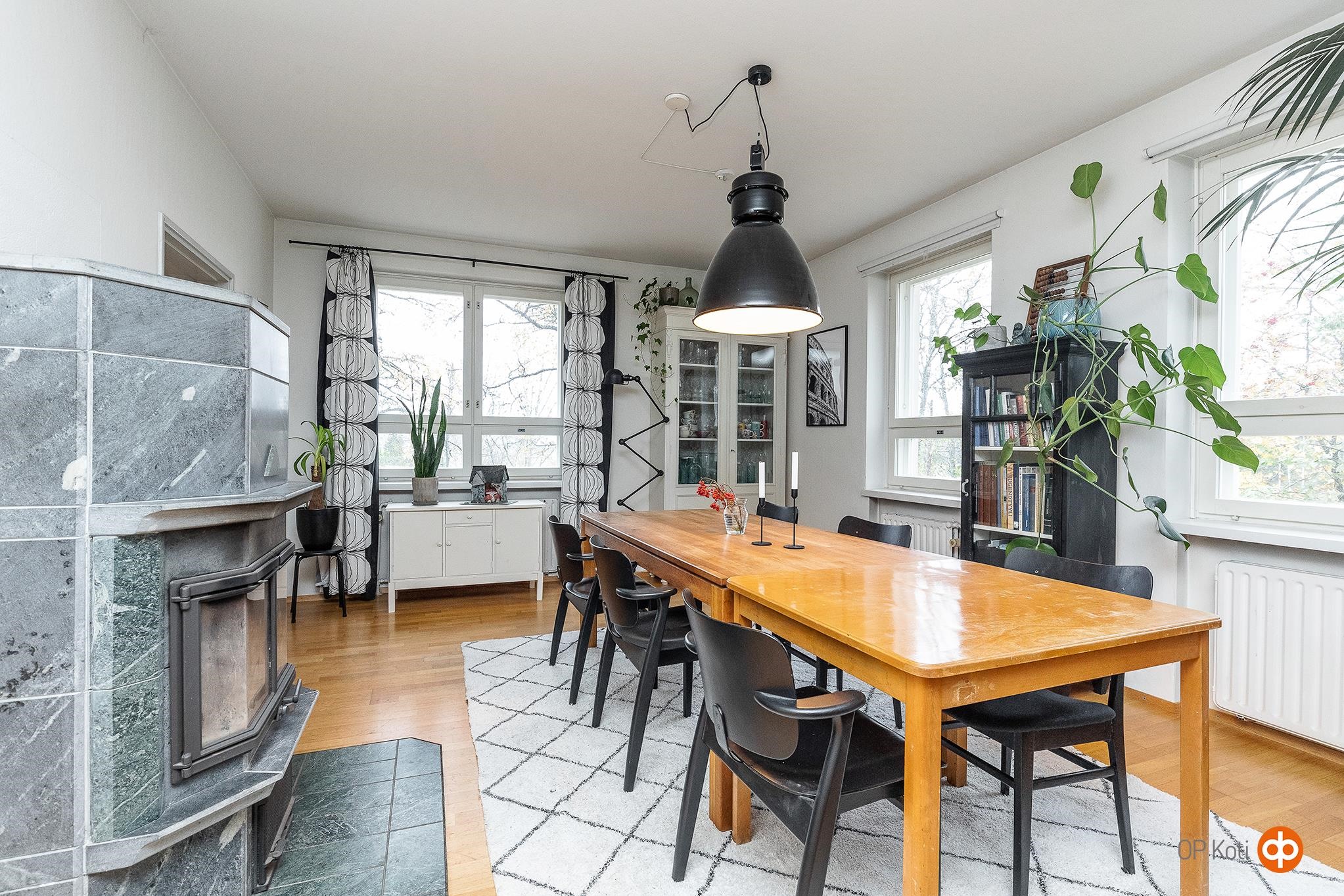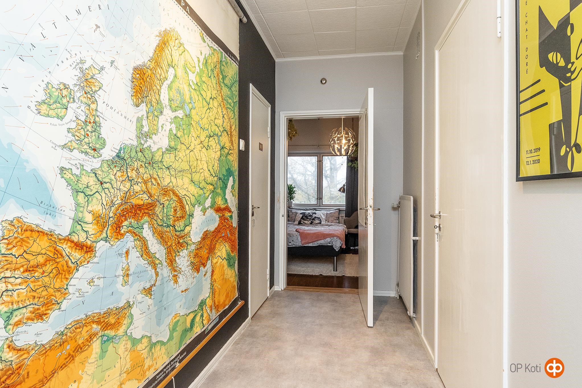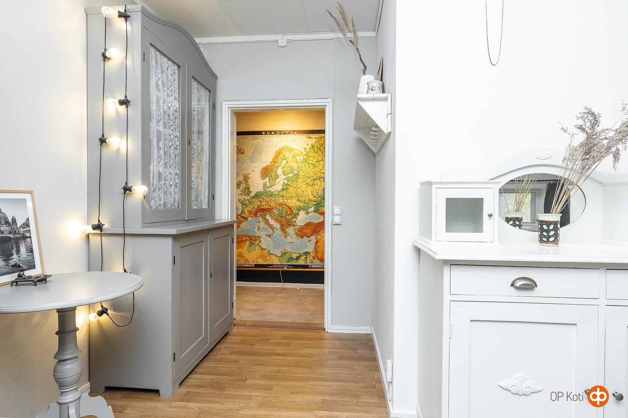 Reilunkokoinen kolmen makuuhuoneen asunto sijaitsee kahdessa kerroksessa. Alakerrassa on tilava ja valoisa olohuone varaavalla takalla ja persoonallinen keittiö. Yläkerrassa kolme makuuhuonetta ja molemmissa kerroksissa omat wc:t. Kellari on auki koko rakennuksen mitalta ja siellä on pesutilojen ja saunan lisäksi monenlaisia varastotiloja ja huoltotiloja. Pesukonevaraus on kellarissa pesutuvassa. Yläkerrassa on runsaasti ullakkotilaa. Öljylämmityksen vaihtamiseen ekologisempaan energiamuotoon saa korotettua kotitalousvähennystä vielä vuoteen 2027 saakka.