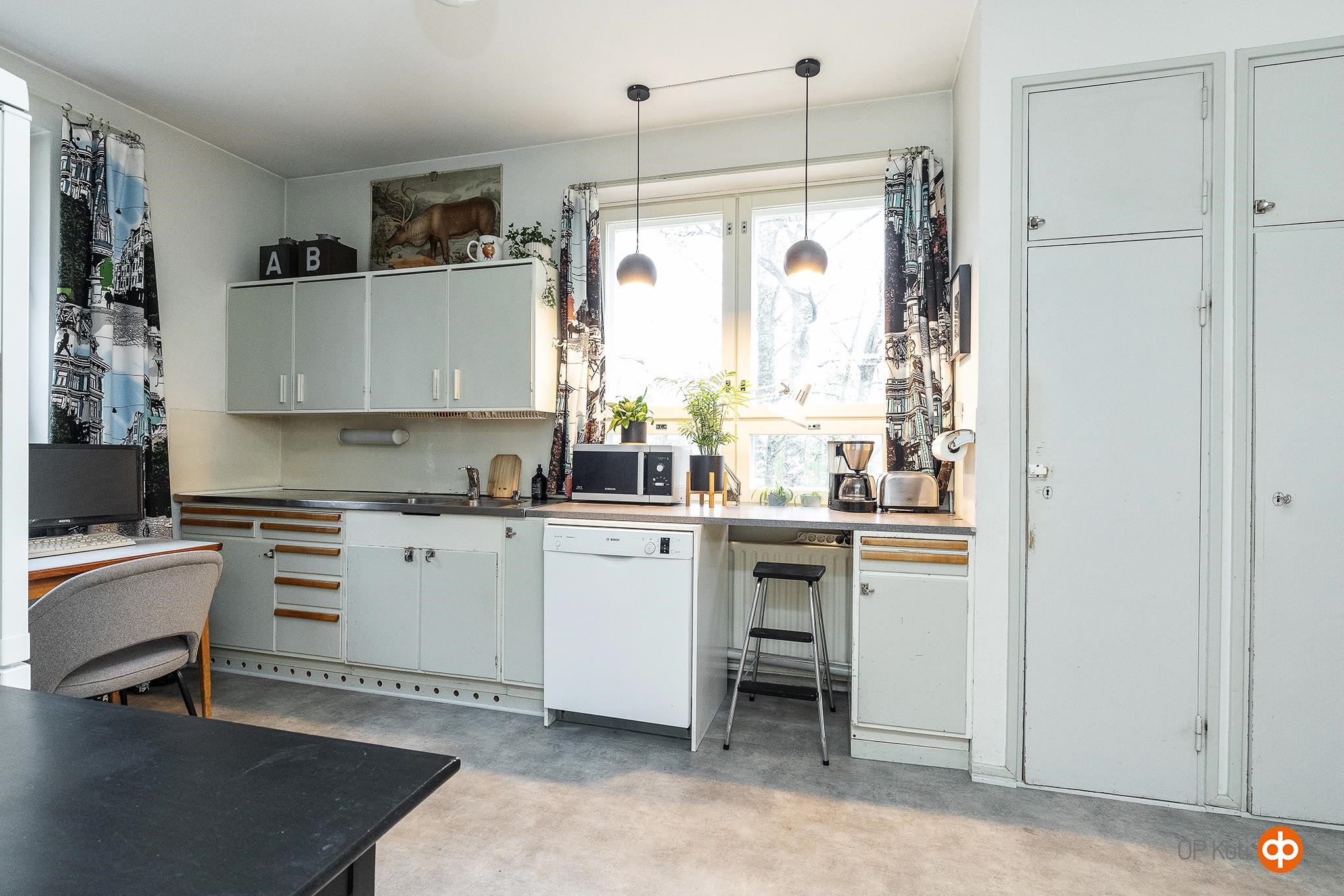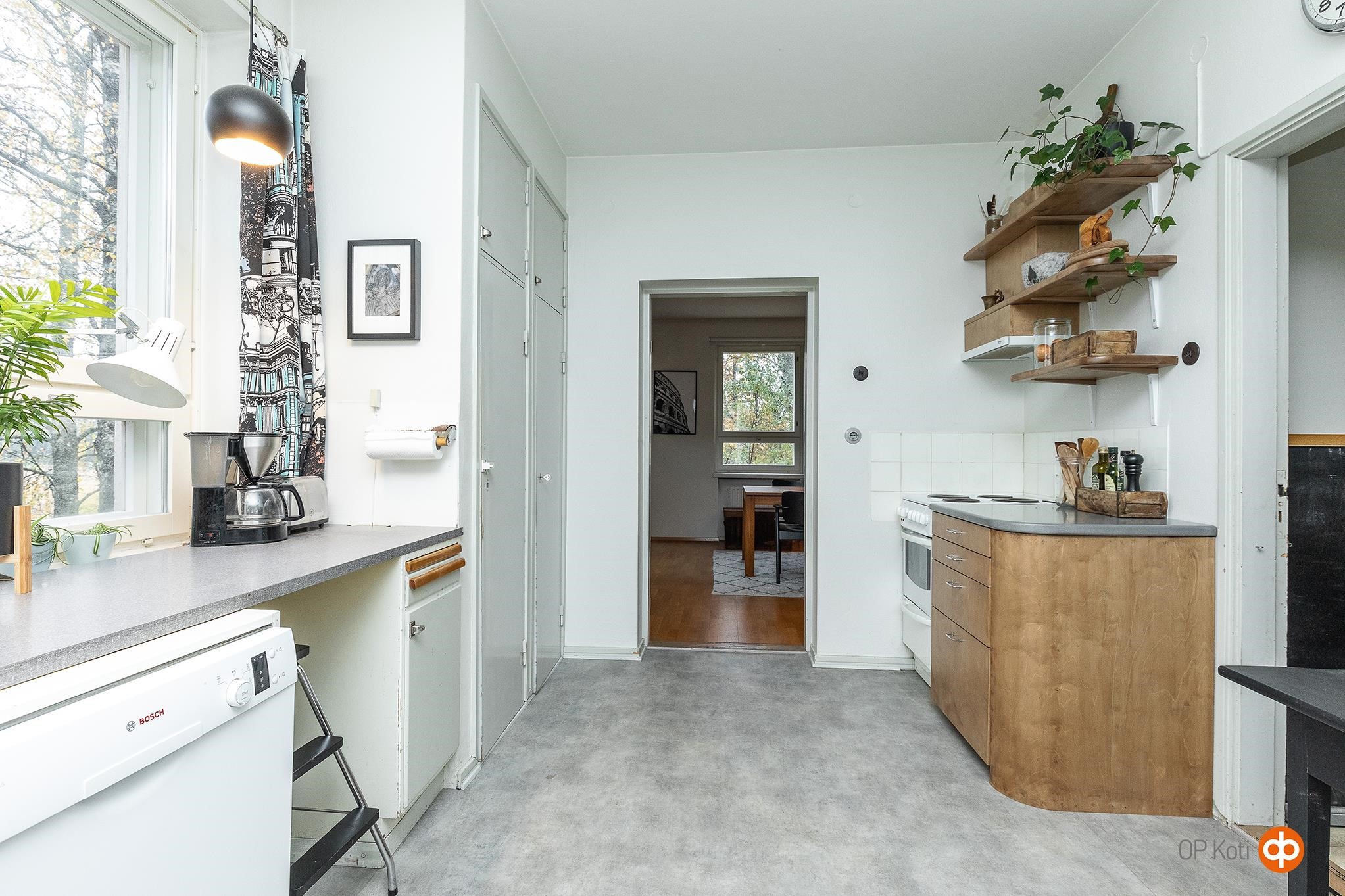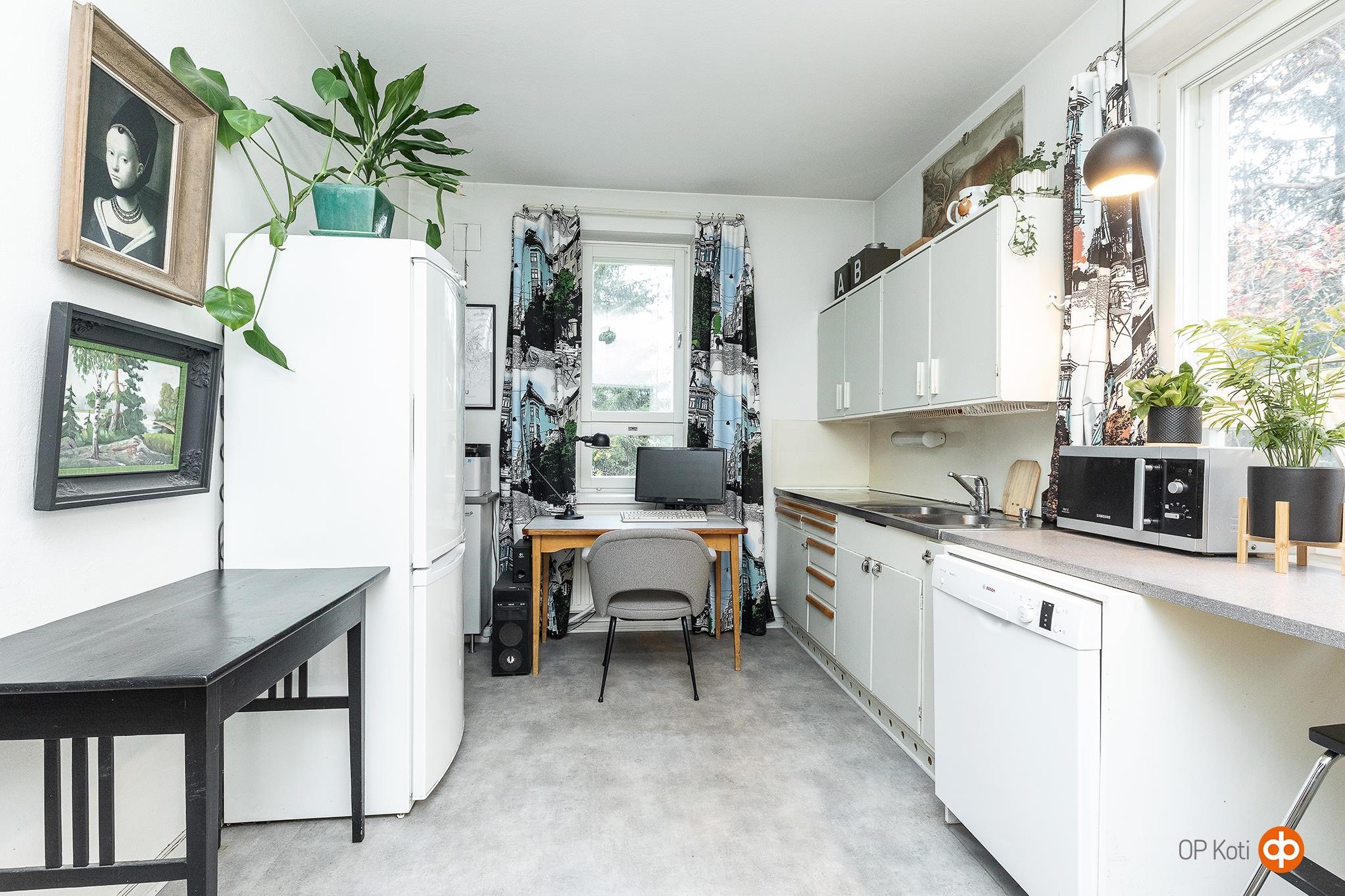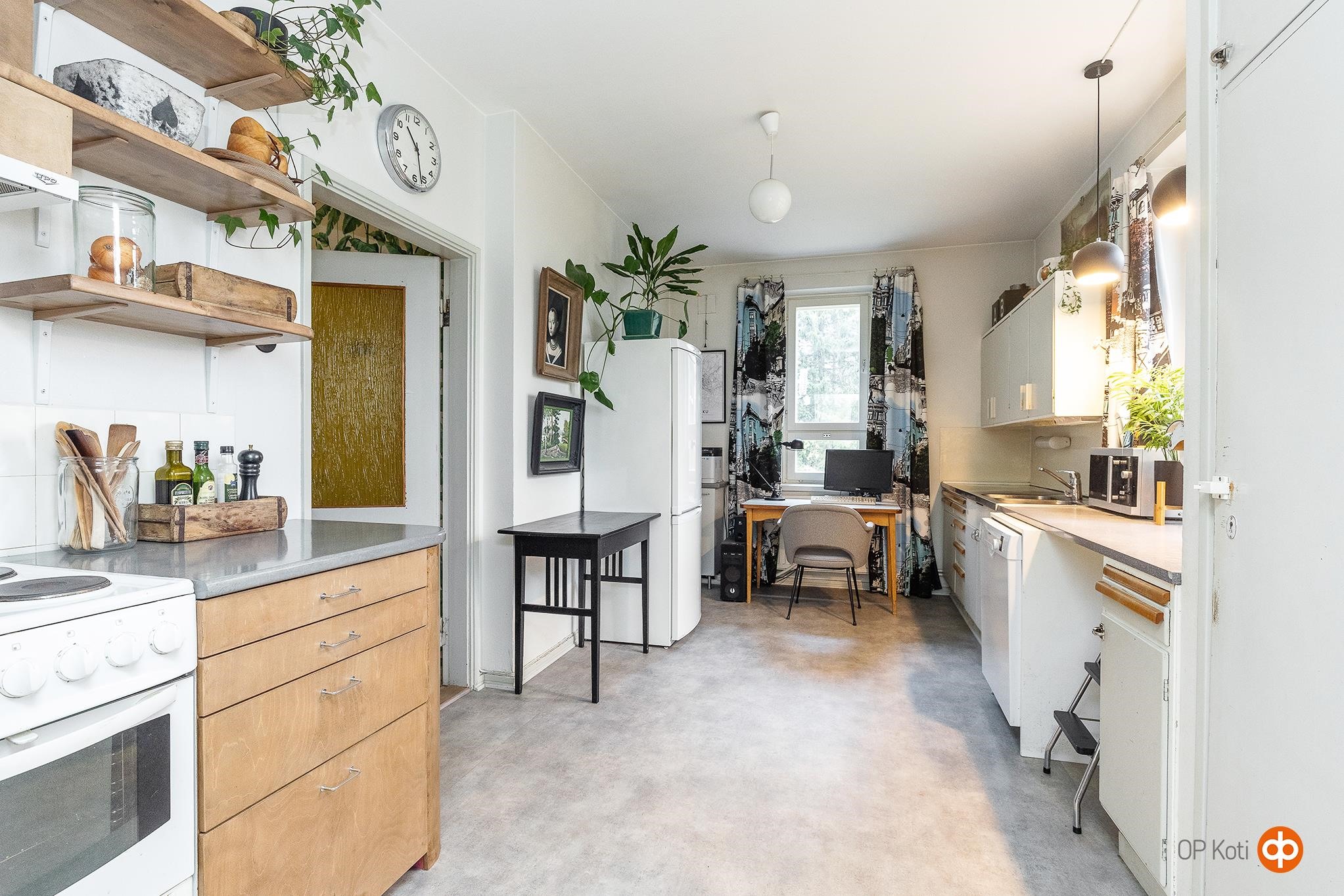 - Jääkaappipakastin, sähköliesi, liesituuletin uusittu 2022, astianpesukone uusittu 2021, kaapistot, irralliset kaapistot, kiinteät valaisimet, pöytätasojen materiaali Laminaatti ja puu.