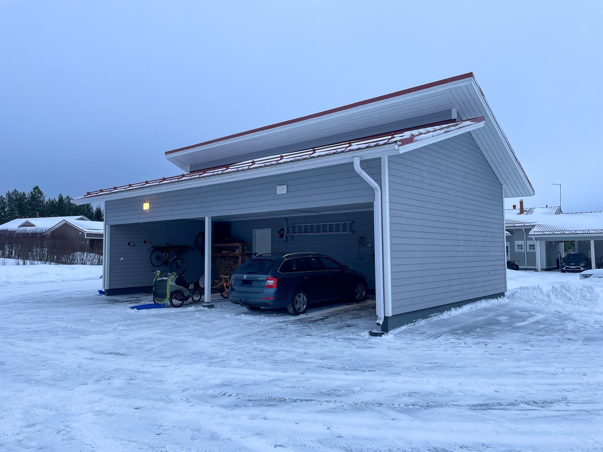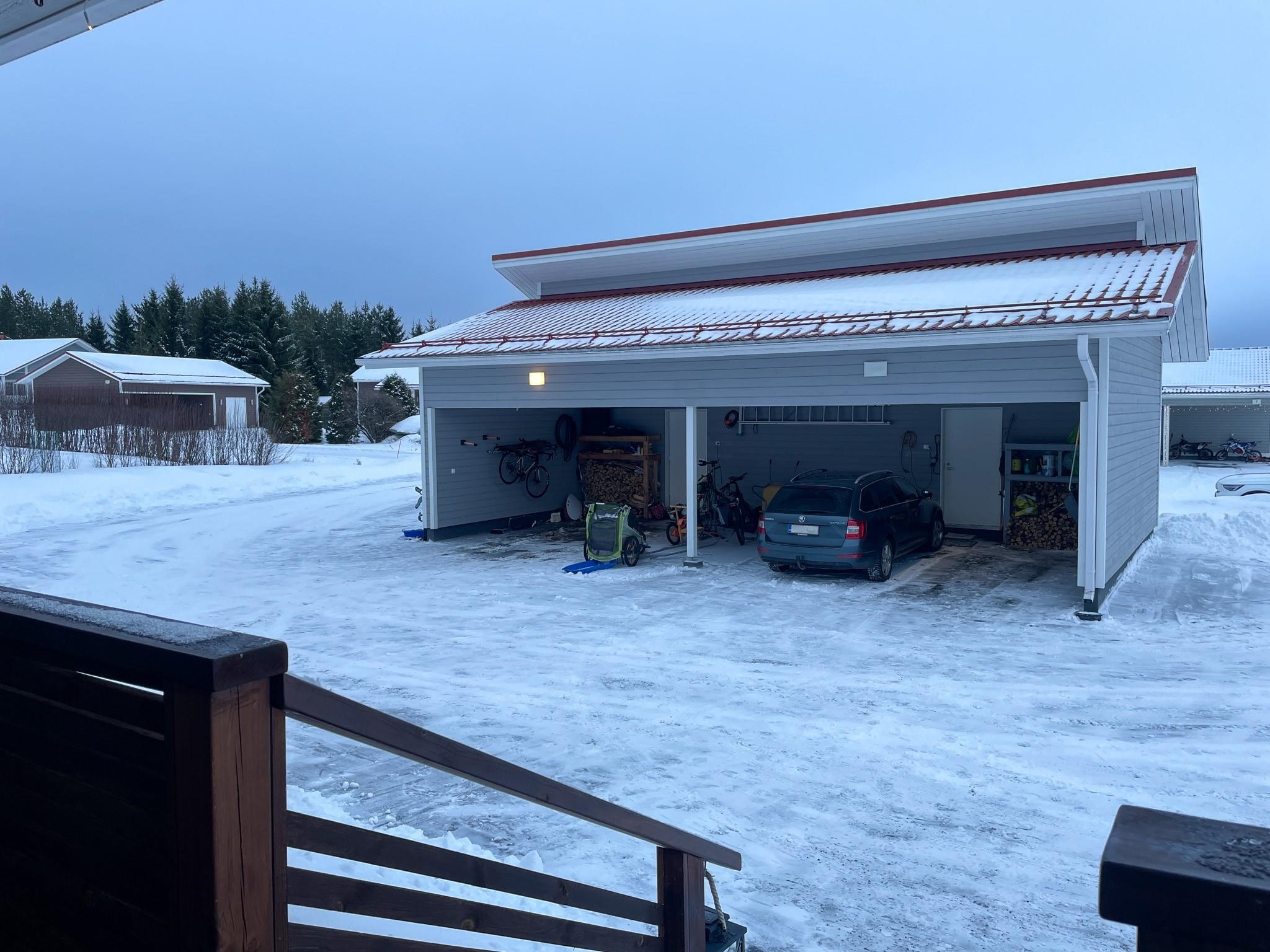 Kahden auton katoksen yhteydessä on myös reilun kokoinen lämmin varasto.
