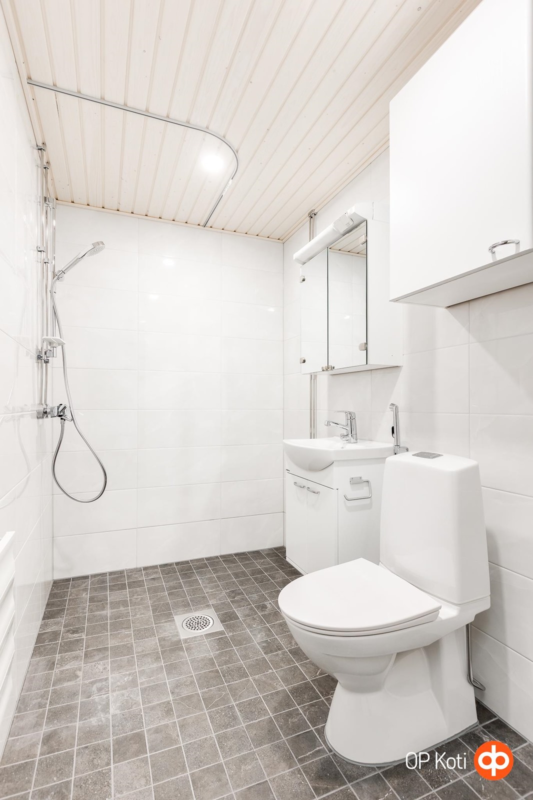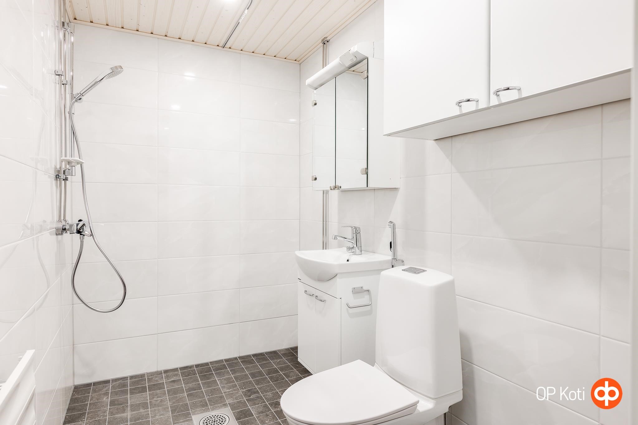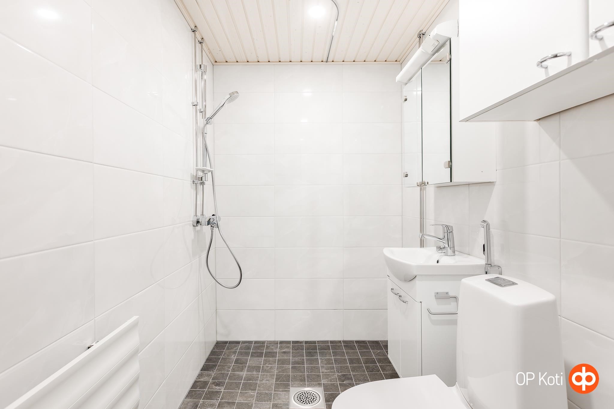 - Kylpyhuone, suihku, peilikaappi, allaskaappi, pesukoneliitäntä, kiinteät valaisimet.