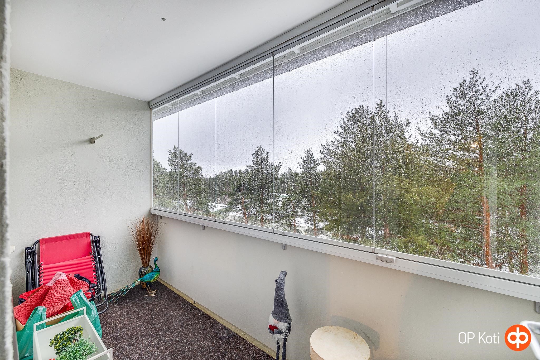 Nyt tarjolla Kaukovainion rauhallisella asuinalueella ylimmän kerroksen tilava kaksio, jonka lasitetulta parvekkeelta avautuu näkymät metsäluontoon. Keittiö ja olohuone muodostavat avaran yhtenäisen tilan, vaatehuoneessa on hyvin säilytystilaa ja kylpyhuoneessa on paikkansa pyykkihuollolle. Kaukovainio on rauhallinen ja viihtyisä asuinalue, jossa lähikauppa löytyy kävelyetäisyydeltä ja keskustaan on vain neljän kilometrin matka, joka taittuu kätevästi paikallisbussilla. Tervetuloa tutustumaan!