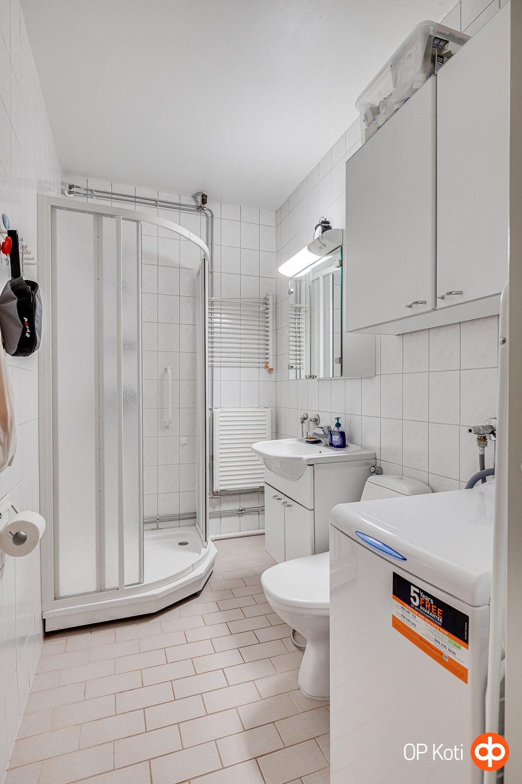 - Kylpyhuone, suihkukaappi, peilikaappi, allaskaappi, pesukoneliitäntä, kiinteät valaisimet.