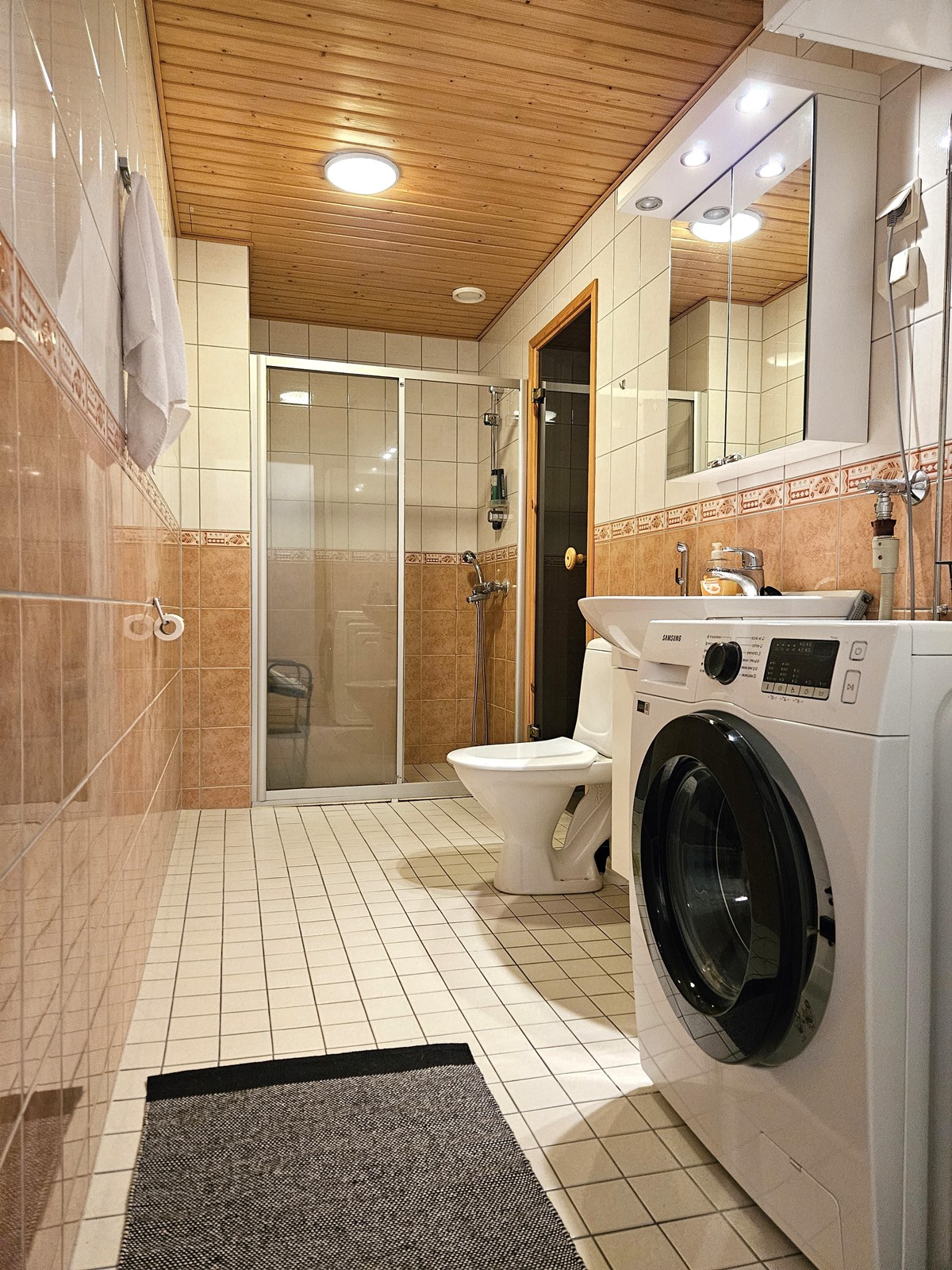 - Sauna, sähkökiuas, kylpyhuone, suihku, suihkuseinä, peilikaappi, allaskaappi, pesukoneliitäntä, lattialämmitys.