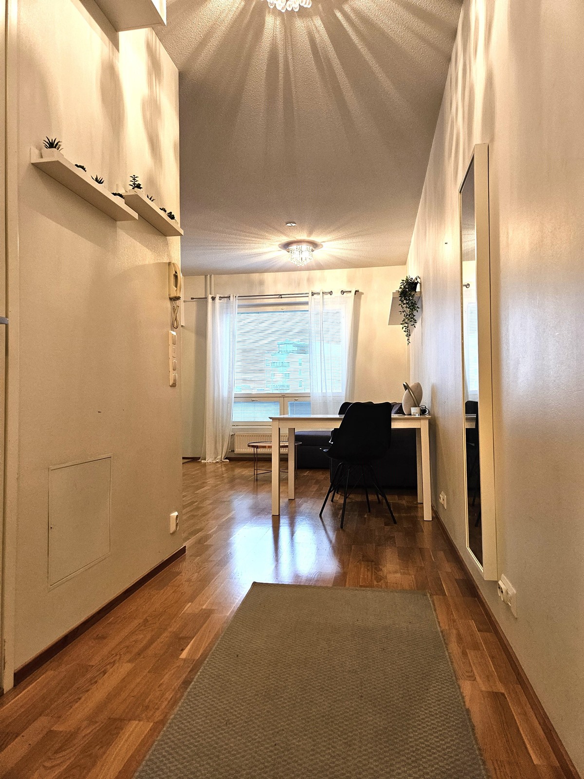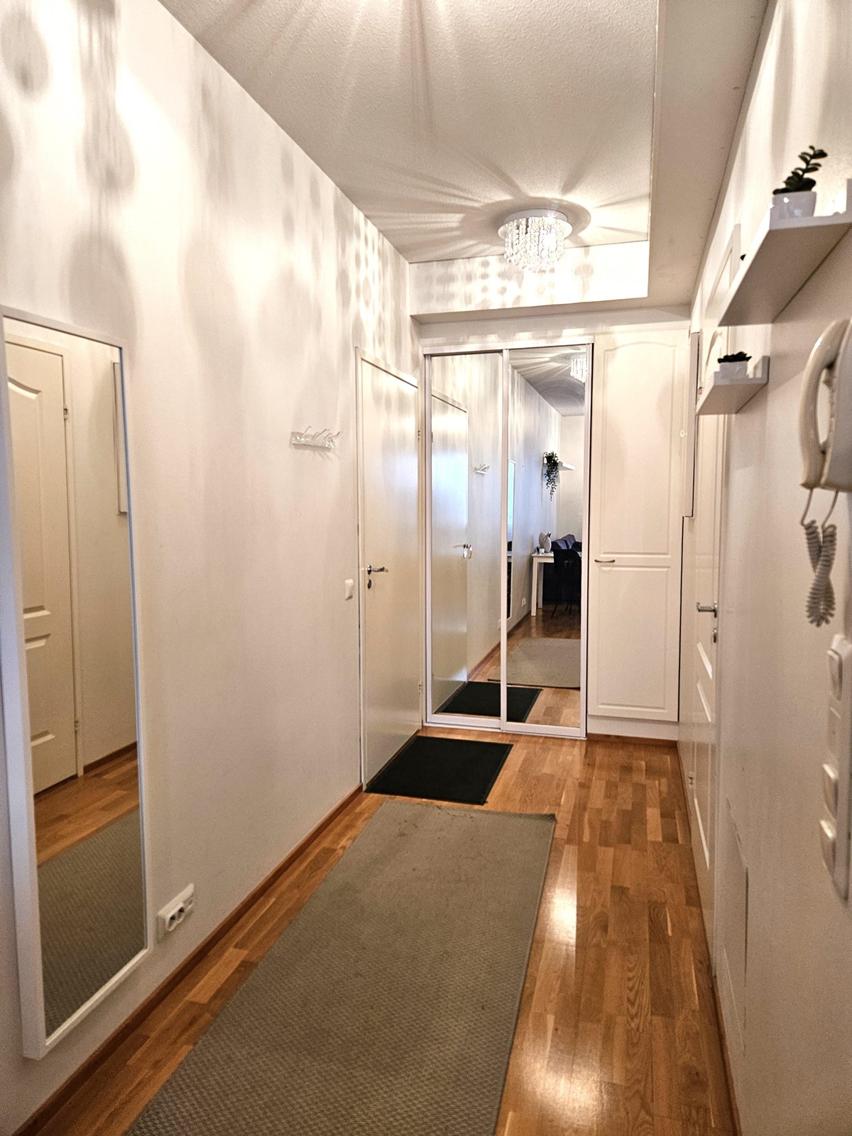 Keittiö: parketti, seinät maalattu. Olohuone: parketti, seinät tapetti. Makuuhuone 1: parketti, seinät maalattu. Kylpyhuone: laatoitettu. Eteinen: parketti, seinät tapetti.