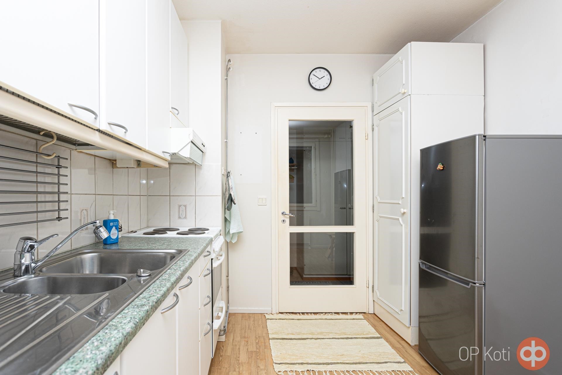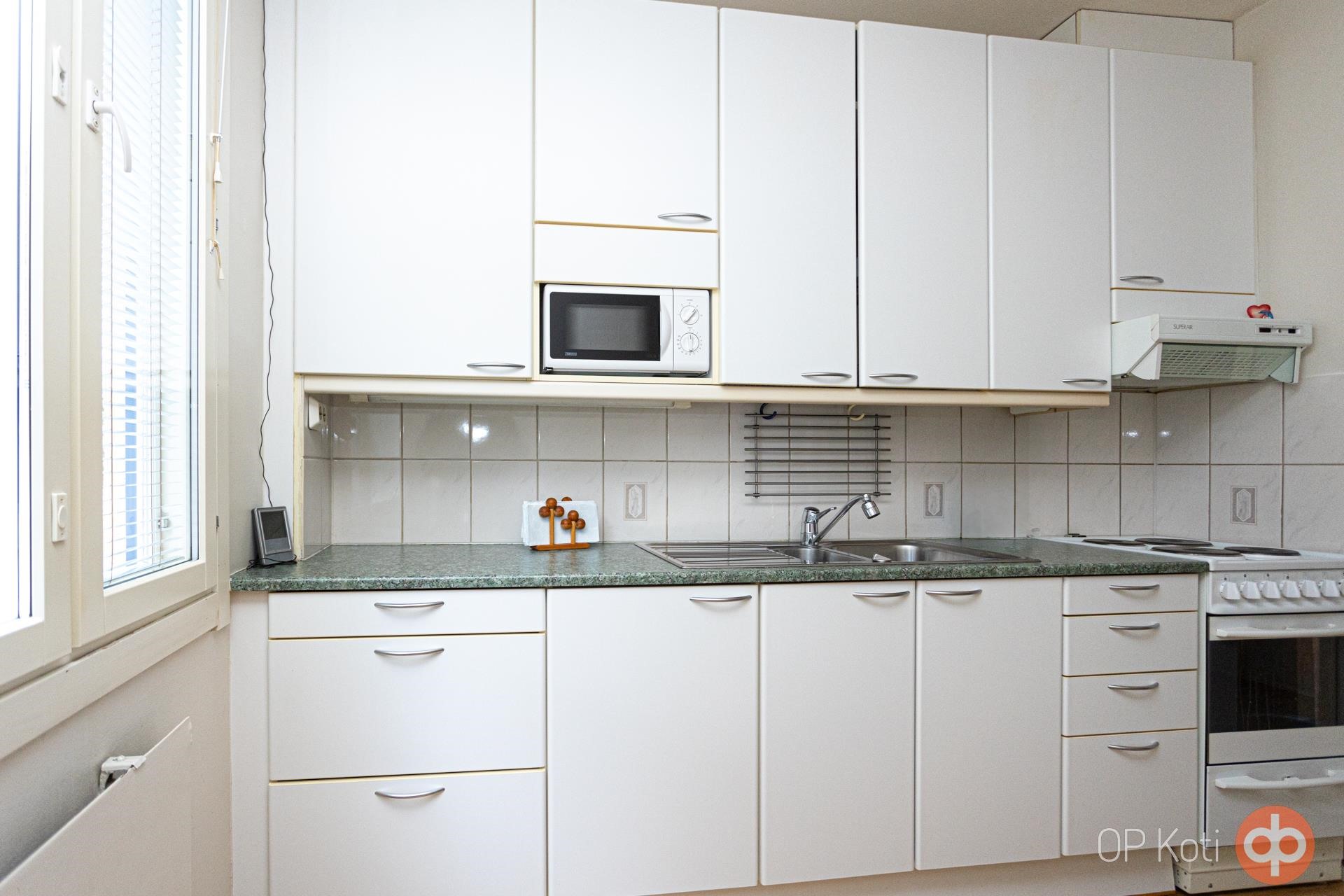 Keittiön kaapistot on uusittu 2000-luvun alussa, ja keittiössä on mukavasti kaappi- ja laskutilaa. Oma tilansa vaatesäilytykselle makuuhuoneen ja eteisen kaapistoissa. Lattioissa on laminaatti ja kylpyhuone on laatoitettu. Pyykinpesukone uudelle omistajalle valmiina.