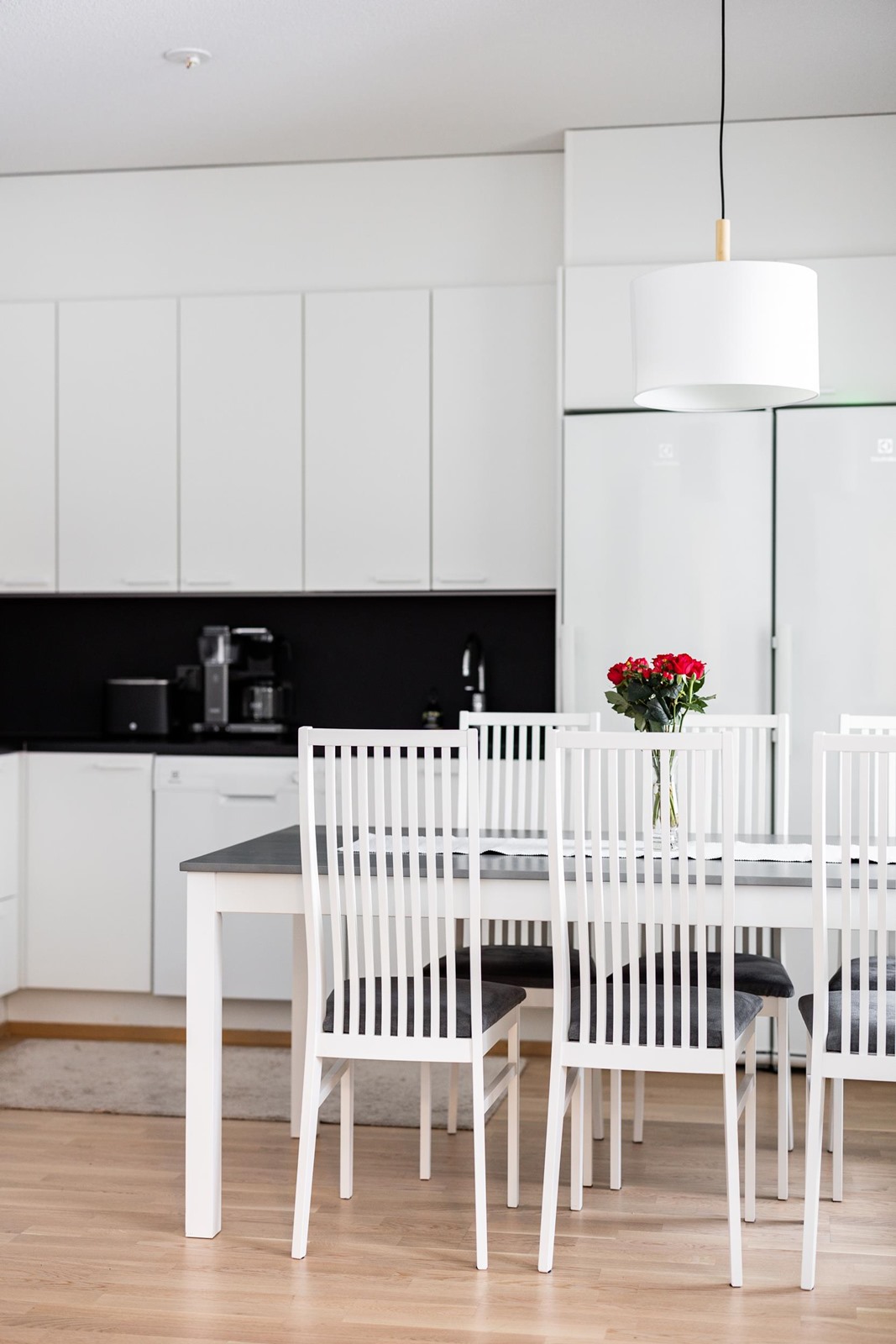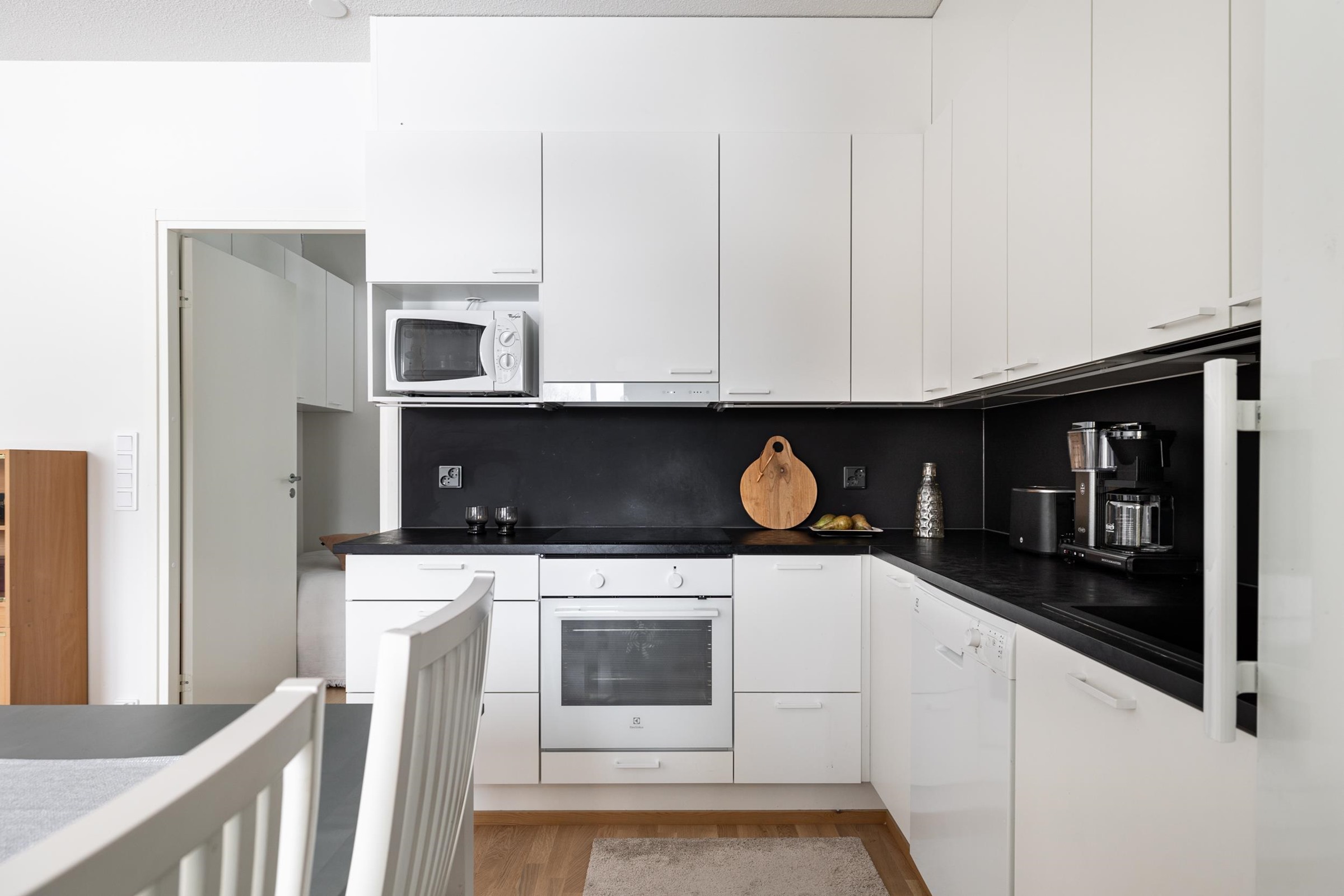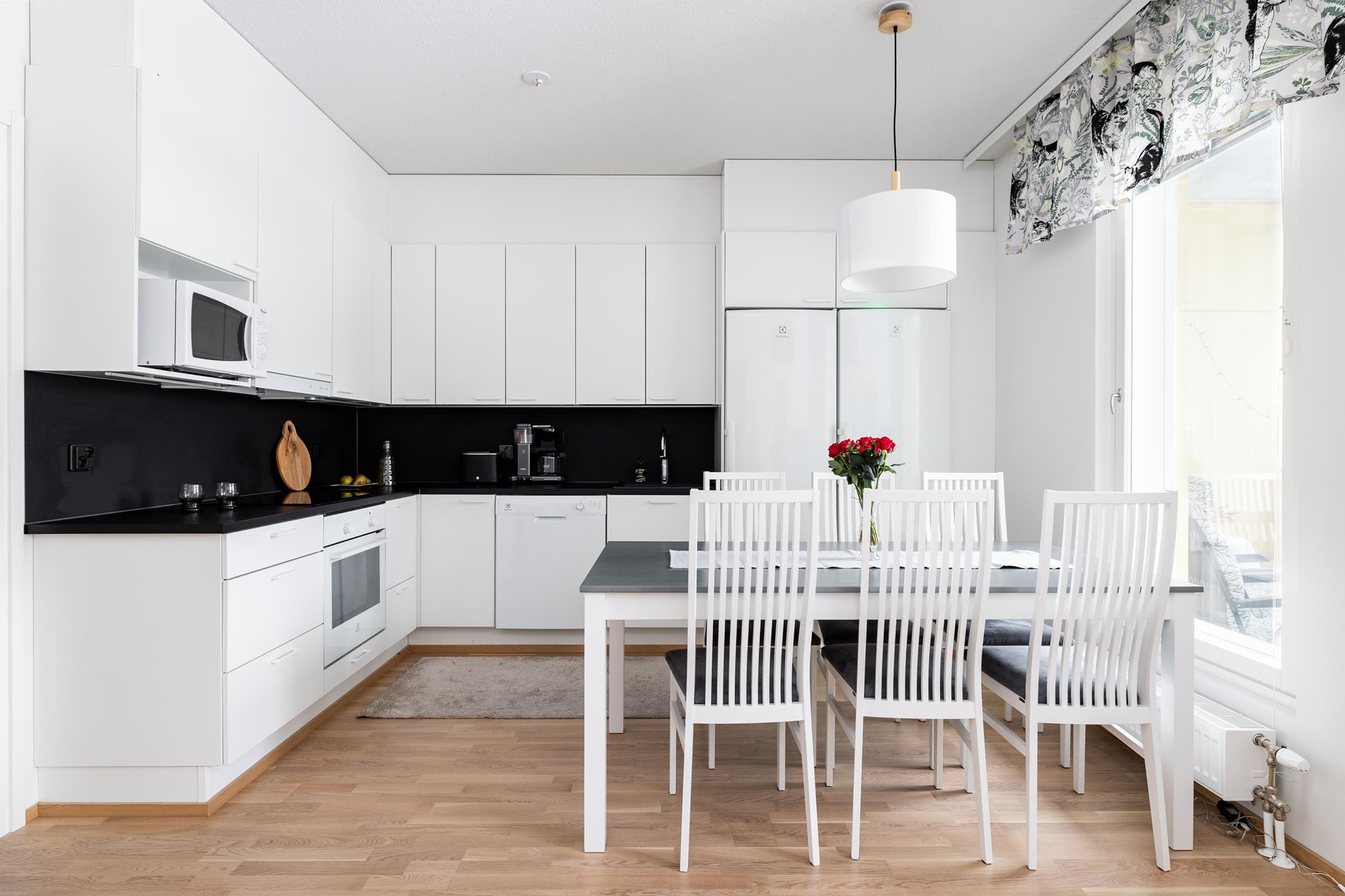 - Jääkaappi, pakastekaappi, erillisuuni, induktioliesi, liesituuletin, astianpesukone, kaapistot, kiinteät valaisimet.