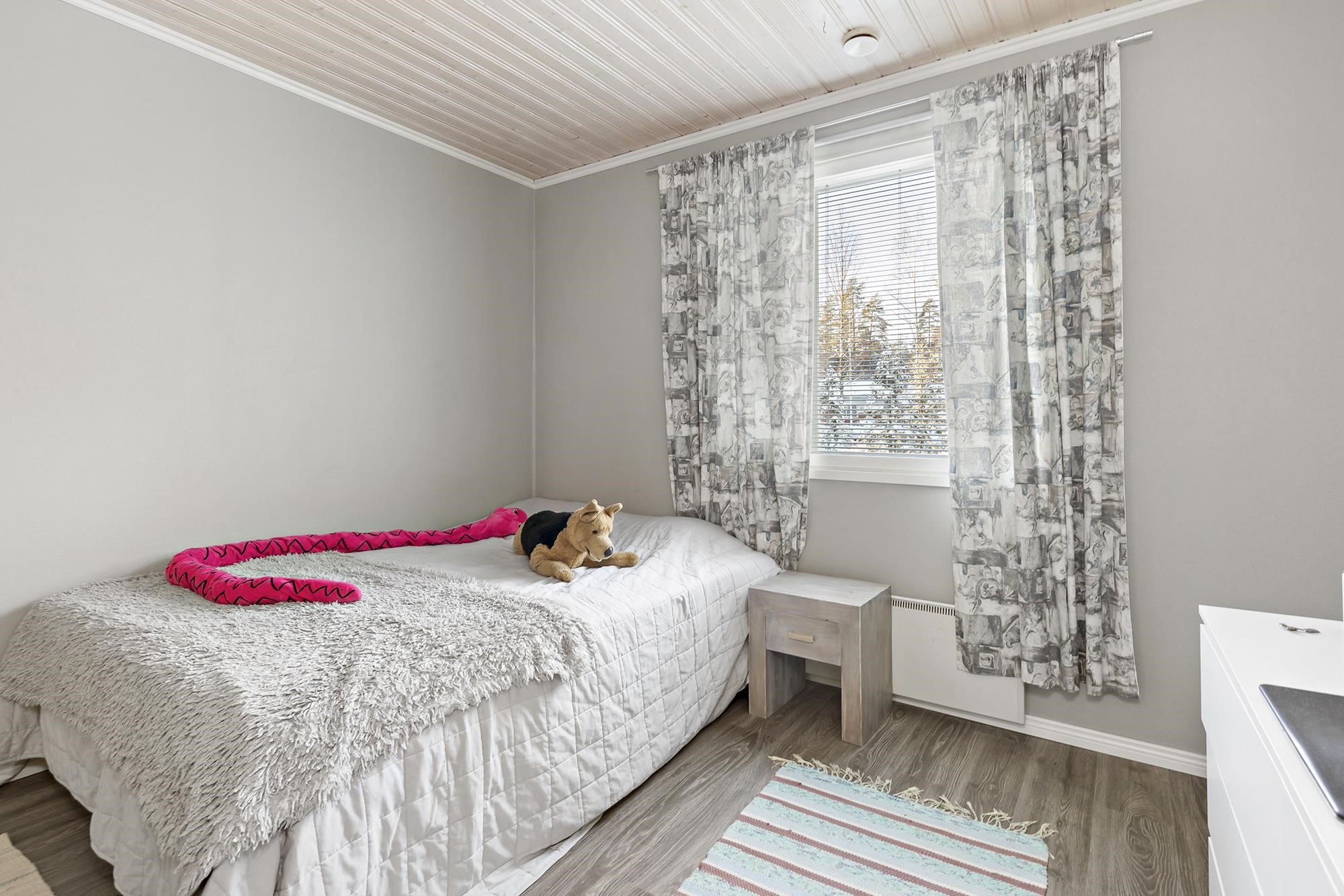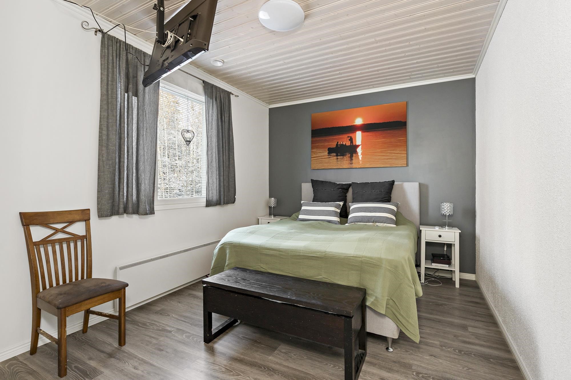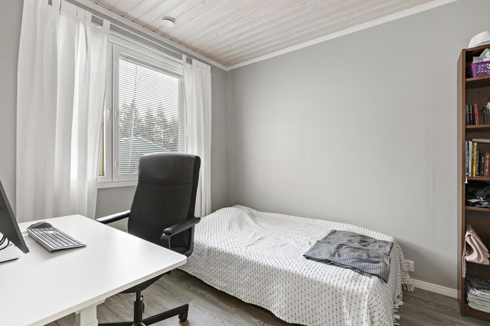 Keittiö: laminaattilattia, maalatut seinät. Olohuone: laminaattilattia, maalatut seinät. Makuuhuone 1: laminaattilattia, maalatut seinät. Makuuhuone 2: laminaattilattia, maalatut seinät. Makuuhuone 3: laminaattilattia, maalatut seinät. Kodinhoitohuone: laattalattia, lasikuitutapetti. Sauna: laattalattia, puupaneeli. Kylpyhuone: laatoitettu. Wc: laatoitettu.