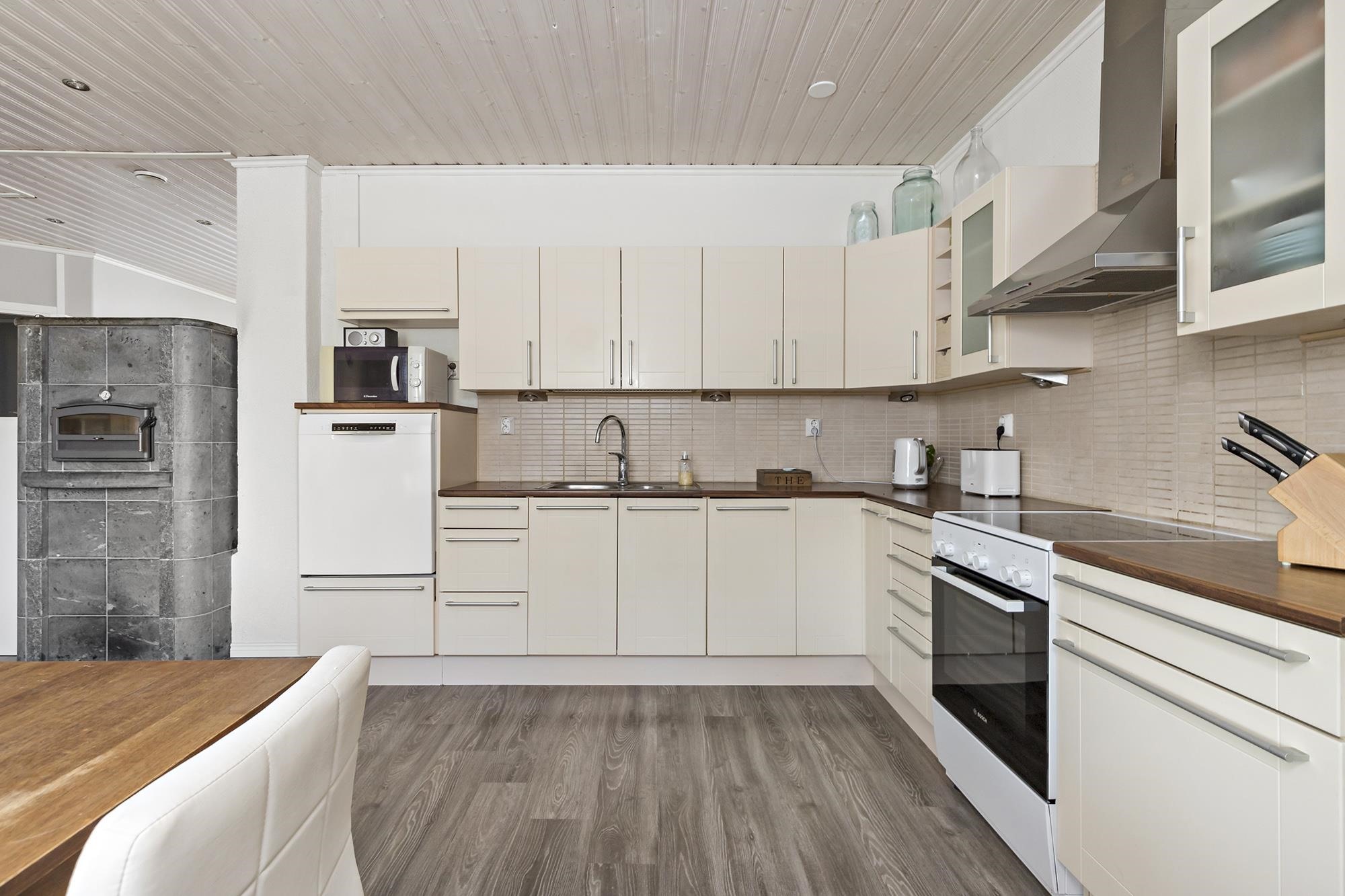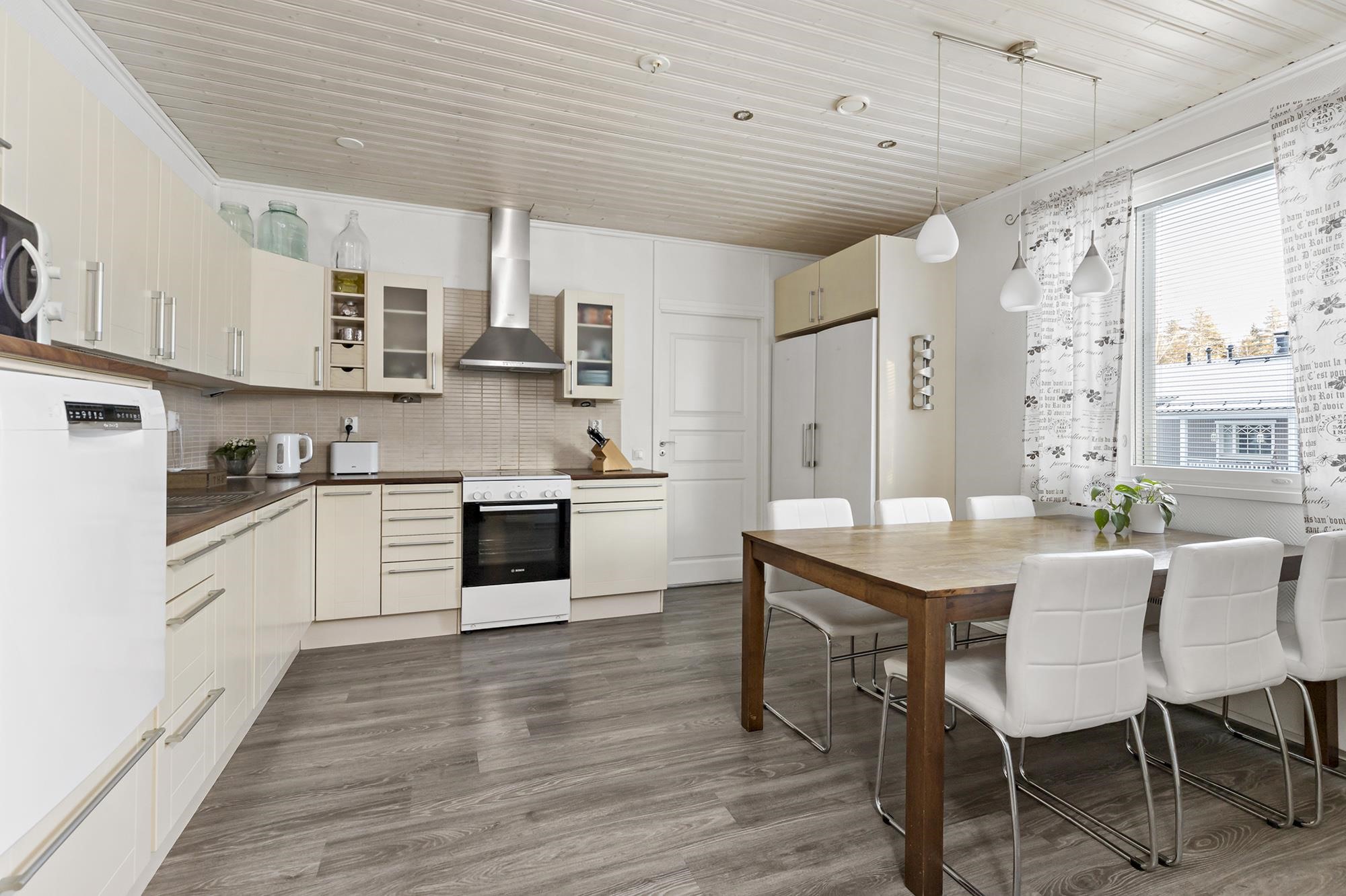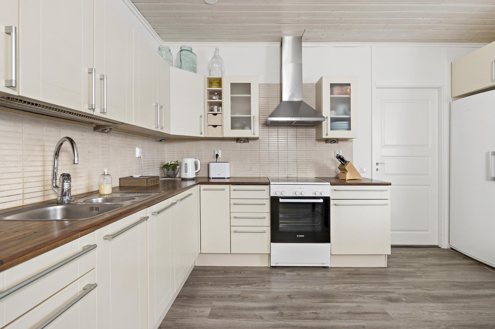 - Jääkaappi, pakastekaappi, keraaminen liesi, liesituuletin, leivinuuni, kaapistot, kiinteät valaisimet, pöytätasojen materiaali laminaatti. Kaikki kodinkoneet ovat alle 2 vuotta vanhoja.