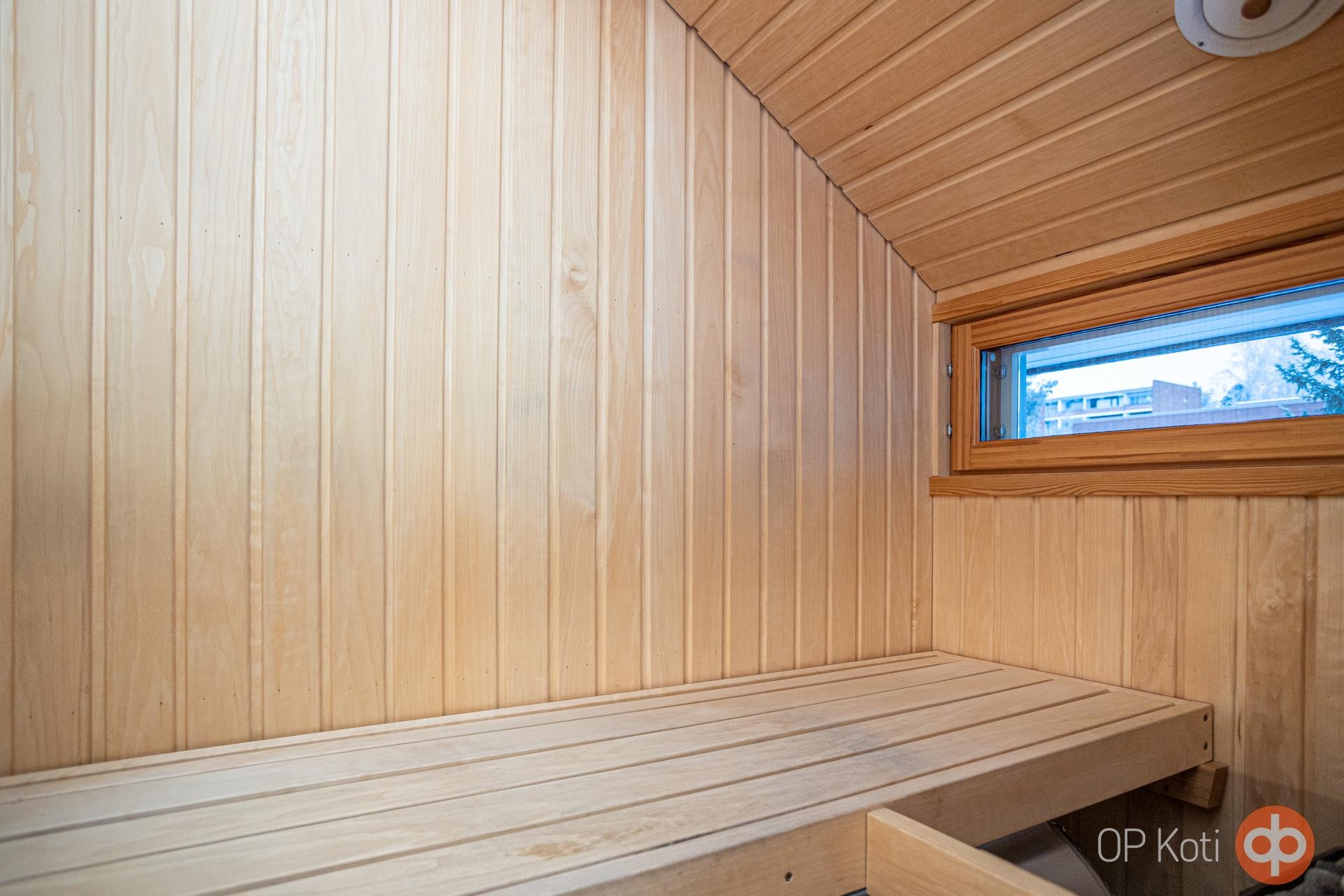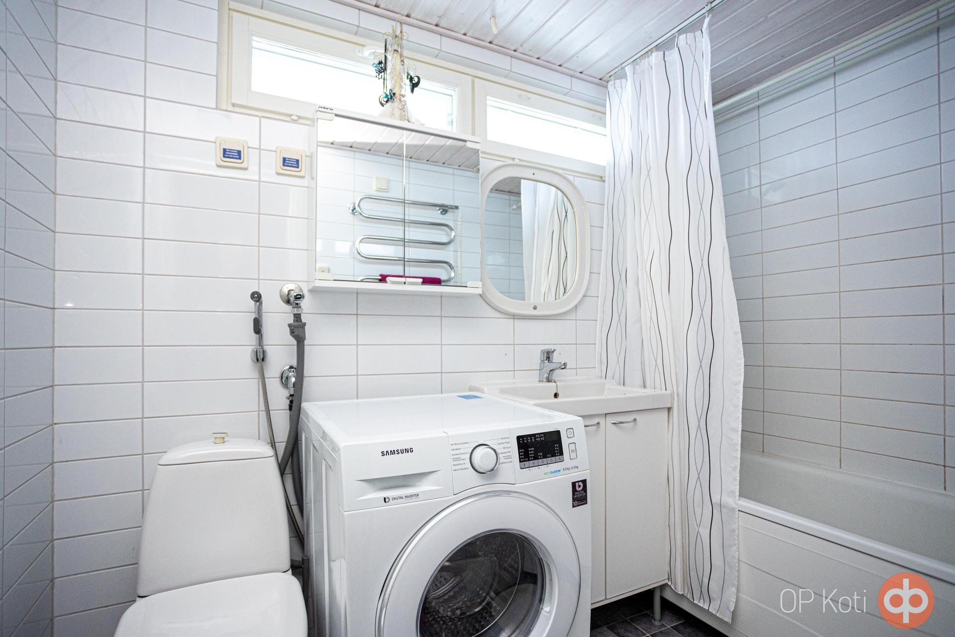 - Sauna, sähkökiuas (uusittu Harvia sähkökiuas 2023), kylpyhuone (alakerta ja yläkerta), suihku (alakerta ja yläkerta), suihkuseinä, amme (alakerran kylpyhuone), peilit, peilikaappi, kaapit, allaskaappi, pesukoneliitäntä, lattialämmitys (alakerran kylpyhuone, ei yläkerta), kiinteät valaisimet.