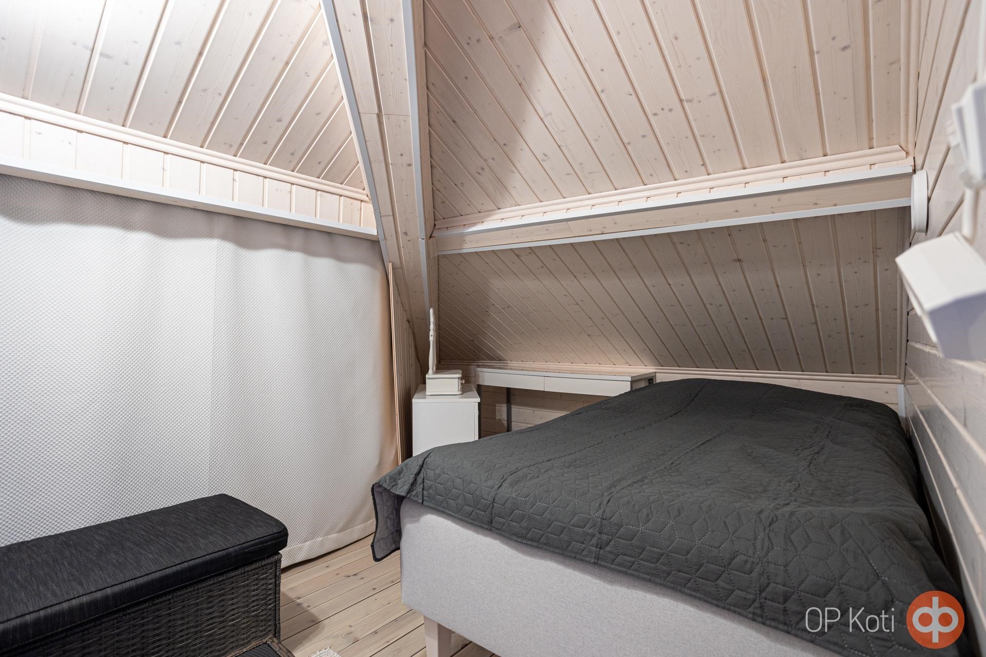 Yläkerrassa on lasitettu parveke sekä avoparveke. Kesäisin avoparvekkeella on huippu paikka ihastella kaunista Poroveden maisemaa! Yläkerran makuuhuoneessa on kattoikkuna, joka antaa valoa ja lämpöä huoneeseen, tarvittaessa voi käyttää markiisia edessä. Yläkerran kylpyhuoneessa kodin toinen wc-istuin.