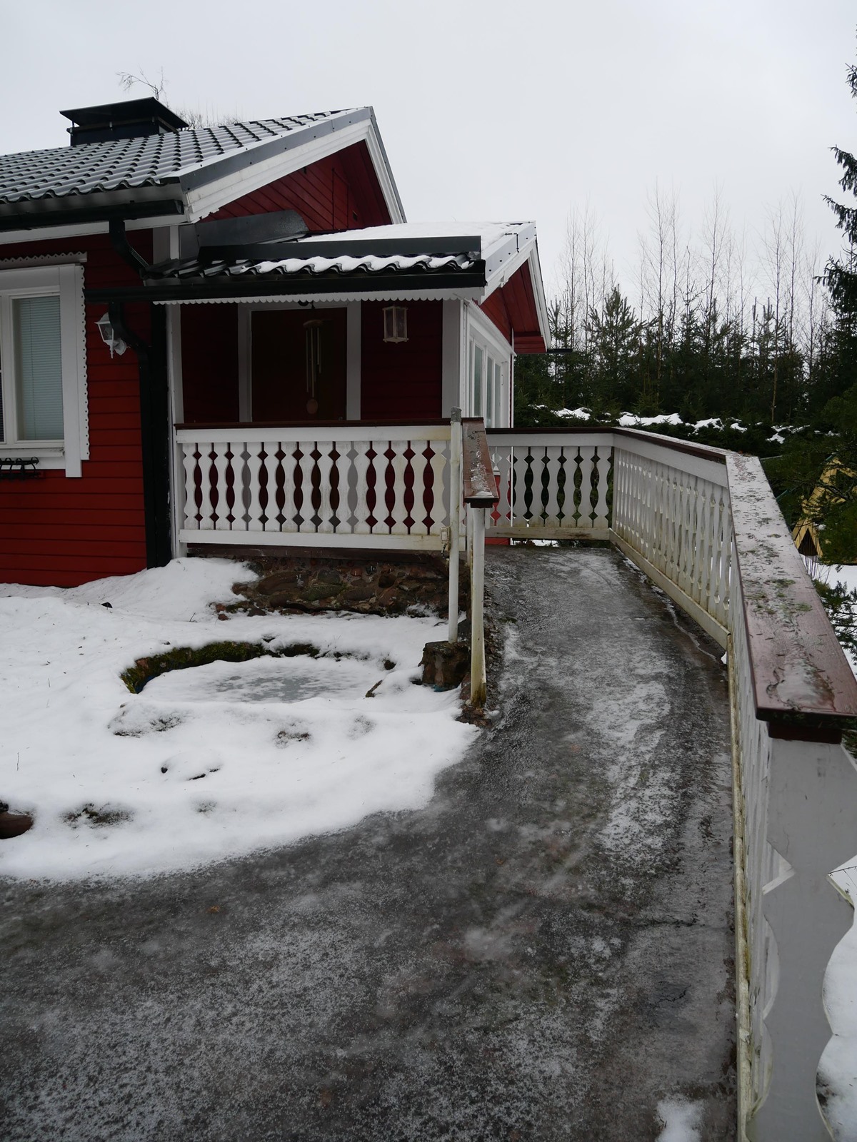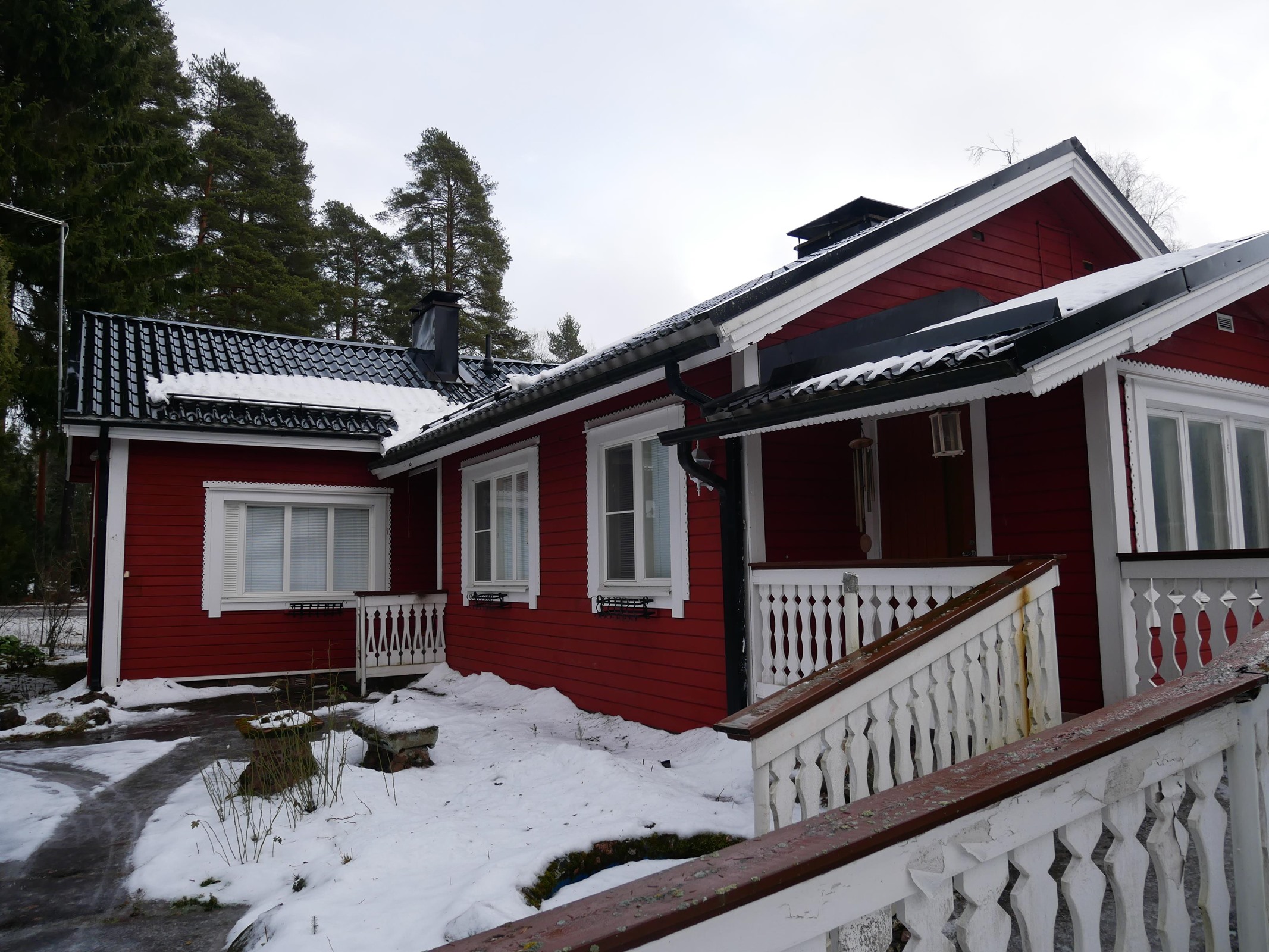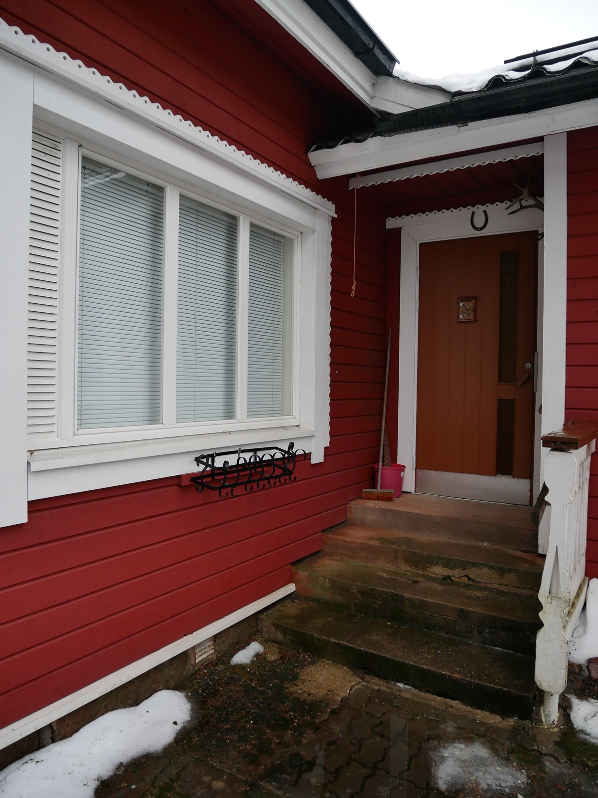 - Puu. Vanha osa talosta hirttä, laajennus lautarakenteinen.