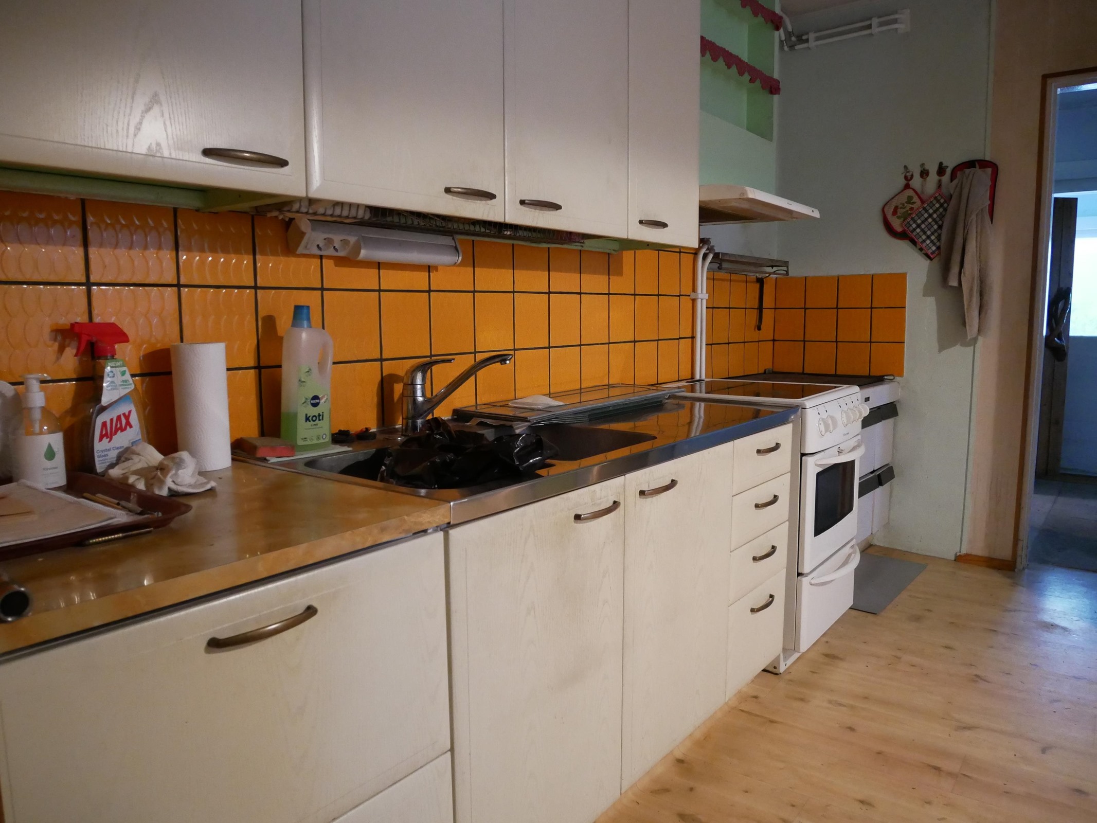 - Jääkaappi, lattialiesi, sähköliesi, liesituuletin, kaapistot, pöytätasojen materiaali Levy. Puuliesi . Keittiön vesiputket uusittu 2018.