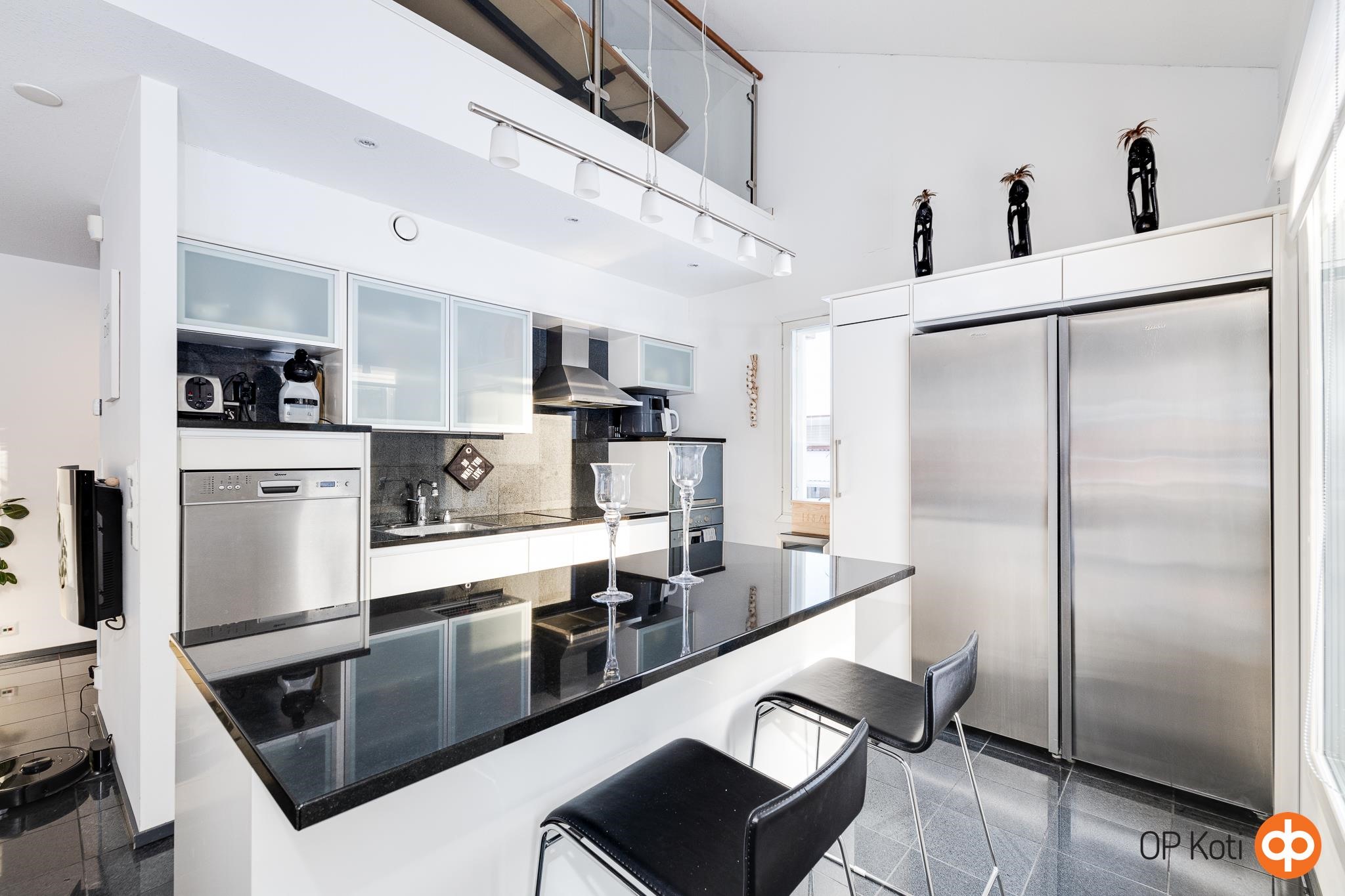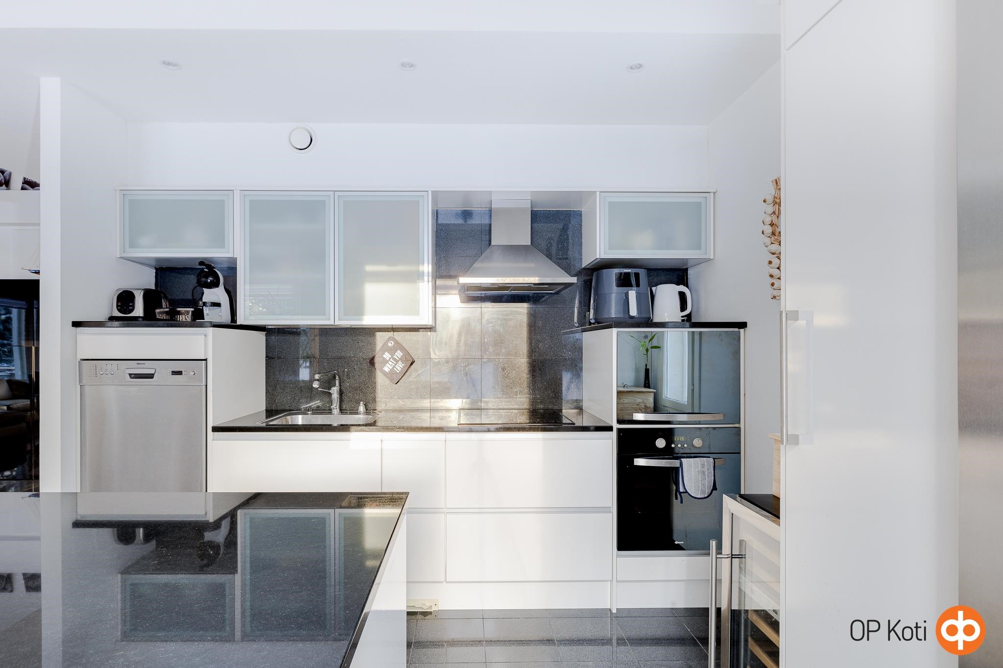 - Jääkaappipakastin, pakastekaappi, erillisuuni, liesitaso, keraaminen liesi, liesituuletin, astianpesukone, kiinteät valaisimet.