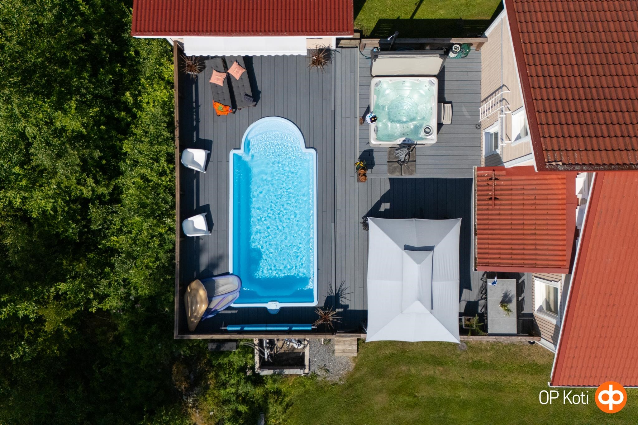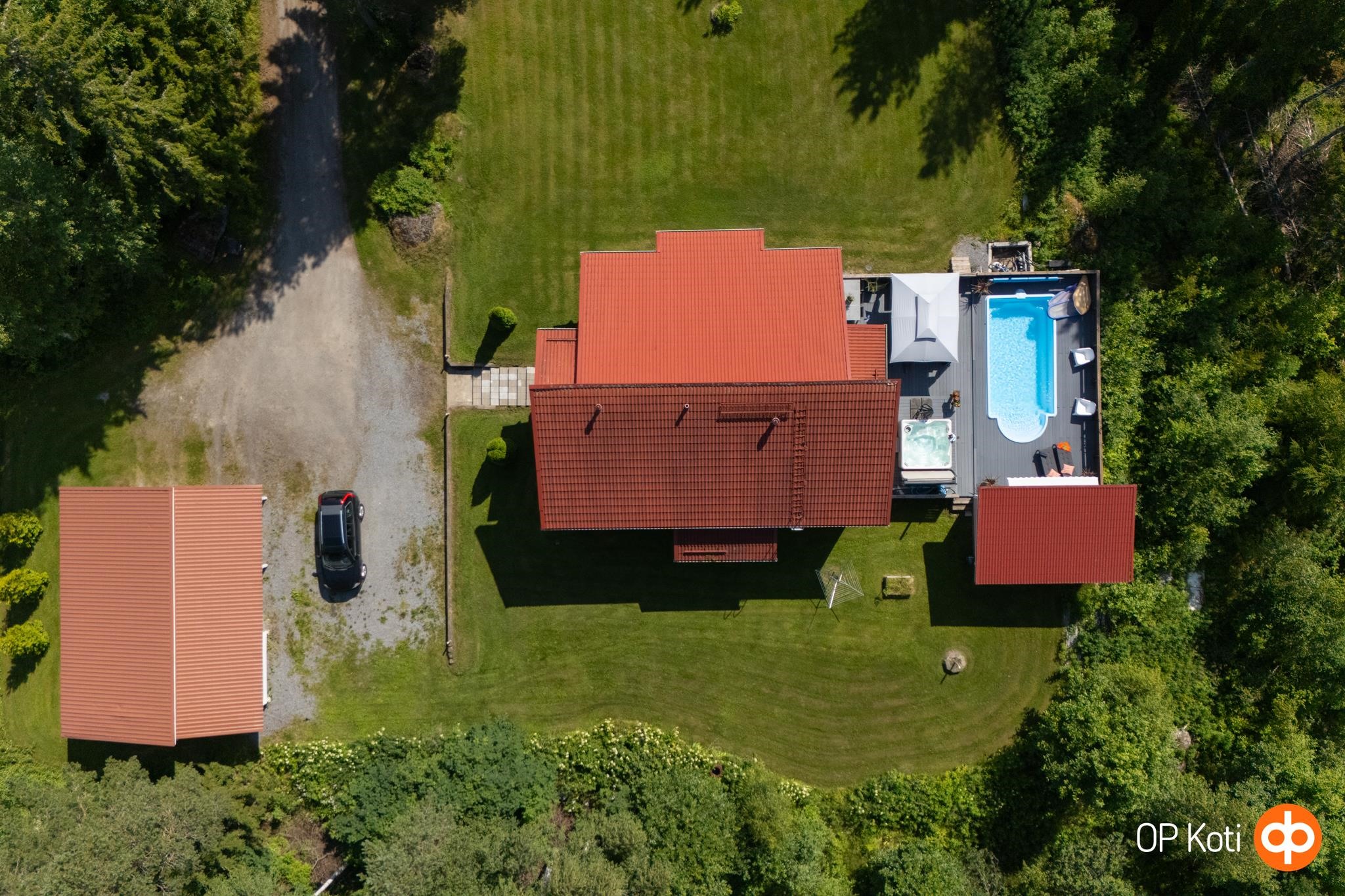 Talon avarasta ja valoisasta olohuoneesta avautuvat upeat näkymät pihalle, jossa sijaitsee oma uima-allas ja poreamme. Keittiö on varustettu moderneilla kodinkoneilla ja runsaalla työskentelytilalla, mikä tekee ruoanlaitosta nautinnon. Talo tarjoaa viisi huonetta, jotka mahdollistavat monipuoliset sisustusratkaisut ja tilaratkaisut perheen tarpeiden mukaan. Saunaosasto ja kylpyhuoneet ovat kauniisti viimeisteltyjä ja tarjoavat erinomaiset puitteet rentoutumiselle.