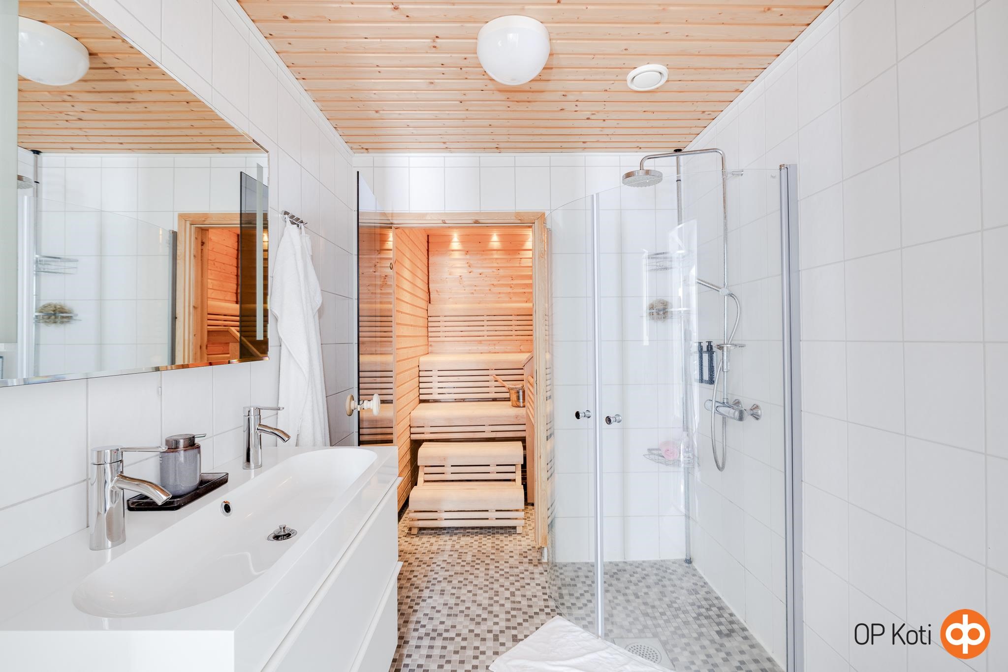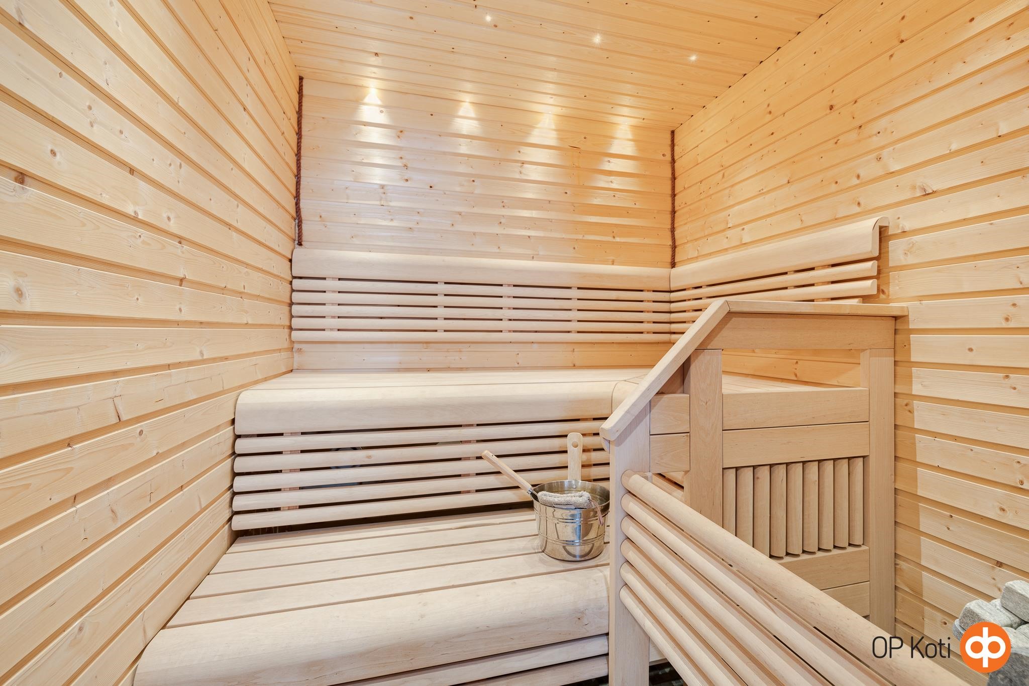 - Sauna, sähkökiuas, erillinen wc, suihku, peilit, pesukoneliitäntä, lattialämmitys, kiinteät valaisimet.