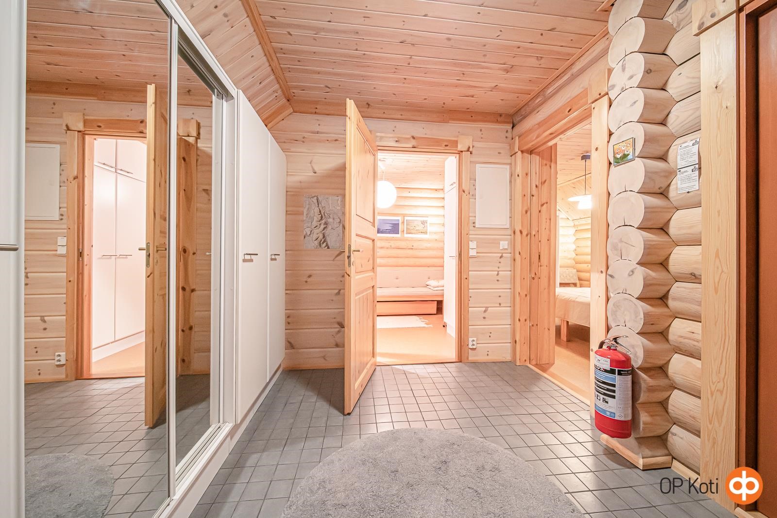 Keittiö: Punahonka/ hirsi, punatiili/ paneeli. Olohuone: Punahonka/ hirsi, punatiili/ päre. Makuuhuone 1: Korkki/ hirsi/ puupaneeli. Makuuhuone 2: Korkki/ hirsi/ puupaneeli. Sauna: Laatta, hirsi/ puupaneeli. Kylpyhuone: Laatta/ laatta, ulkoseinä hirsi / puupaneeli. Eteinen: Laatta/ hirsi / puupaneeli.