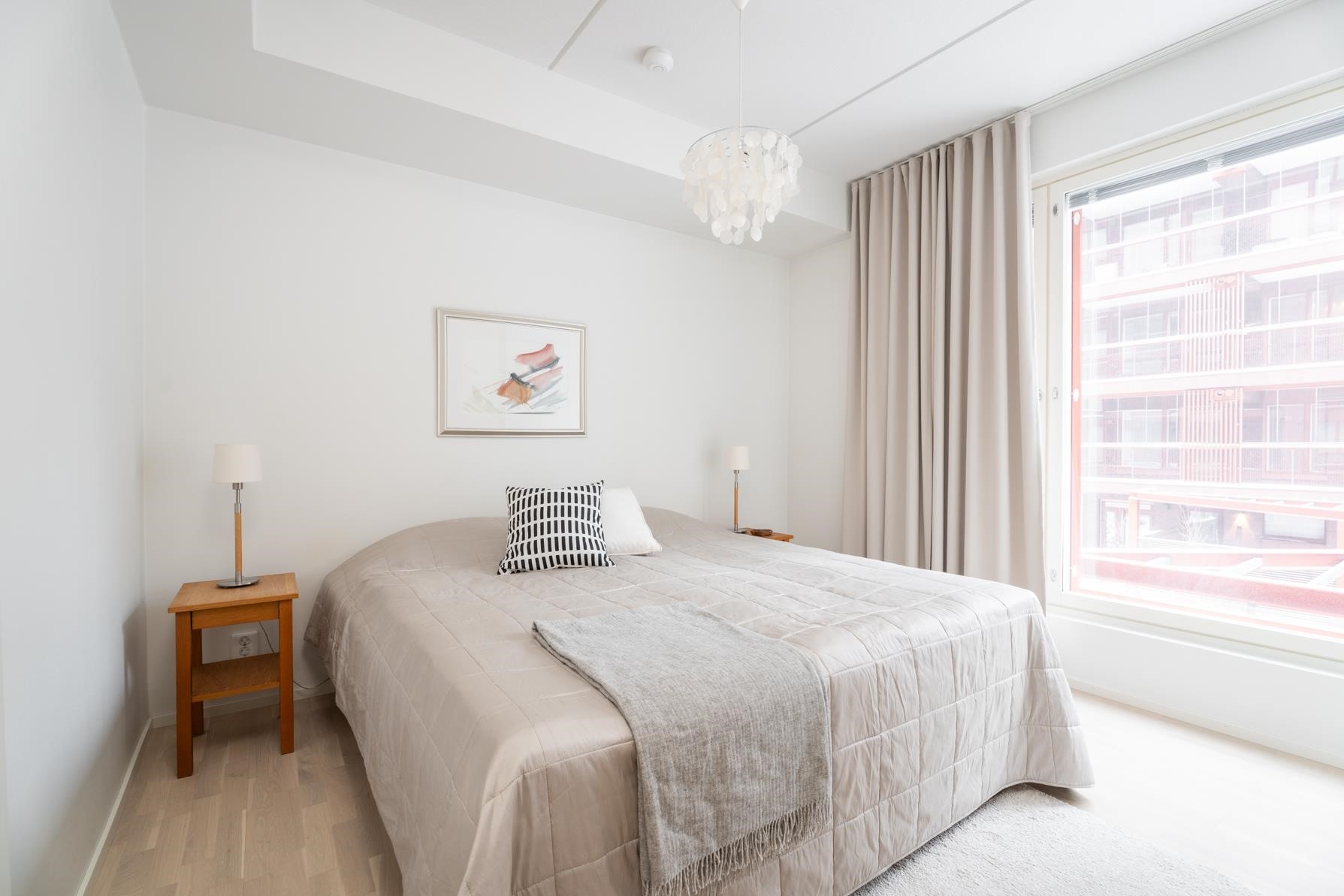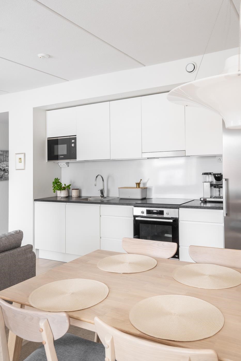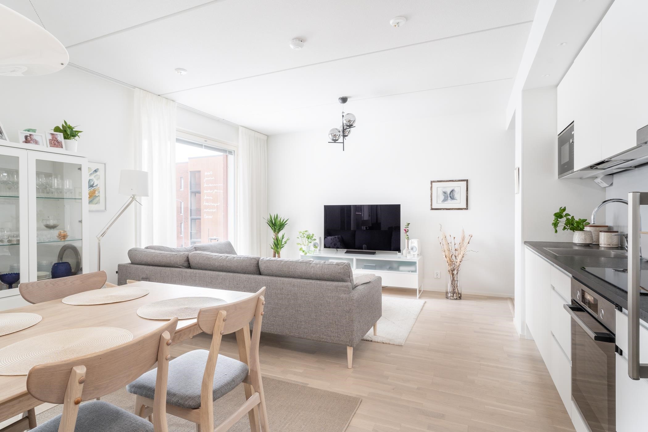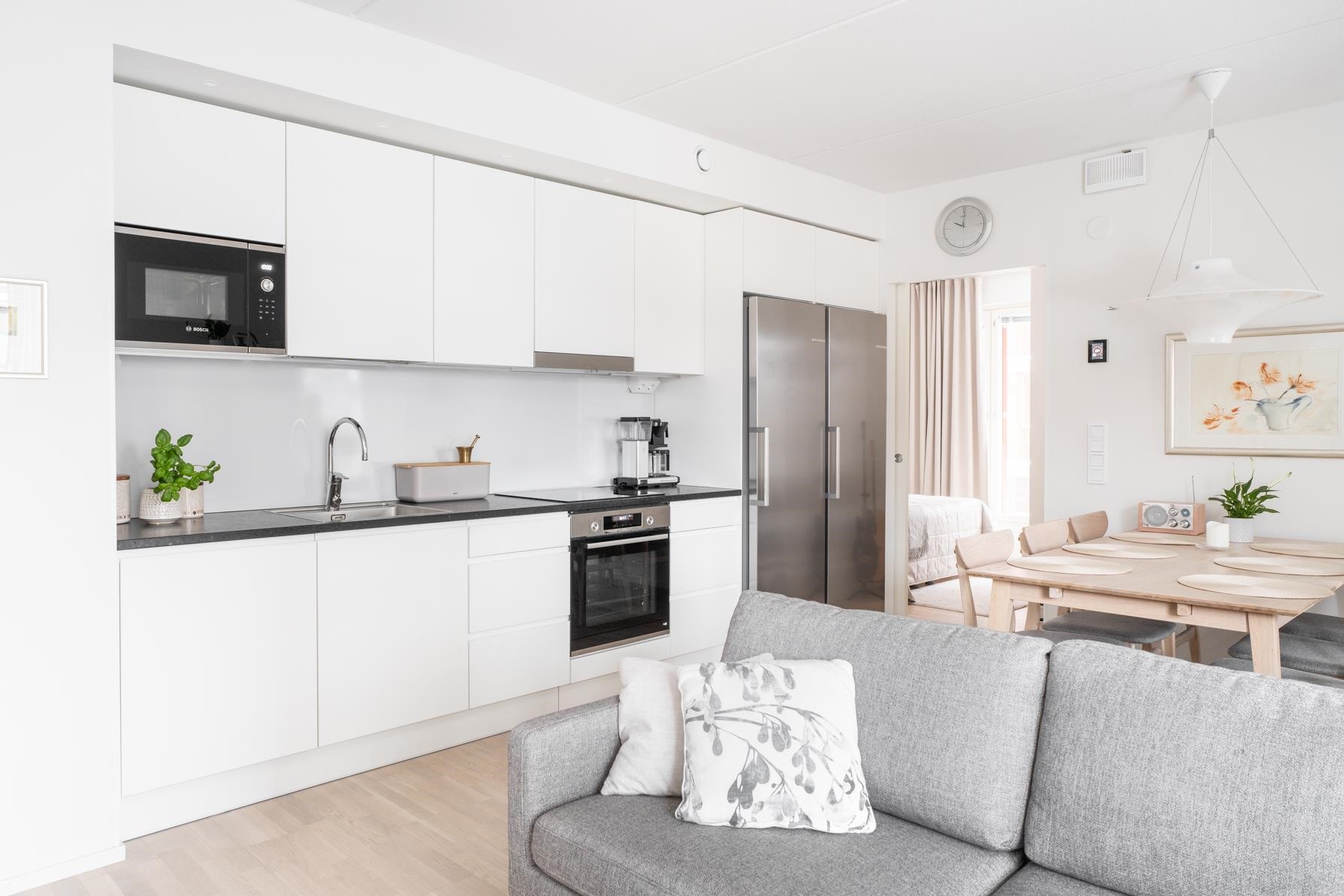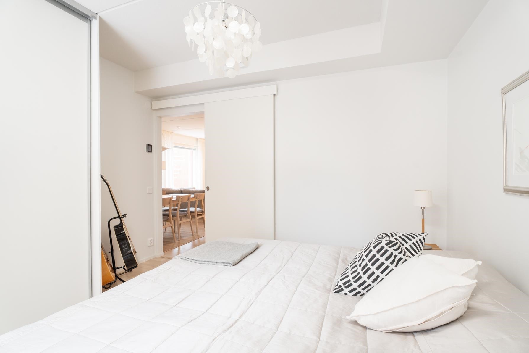 Vesikiertoinen lattialämmitys ja kaukoviileä takaavat miellyttävän asumislämpötilan kaikissa vuodenajoissa. Tilava olohuone ja keittiö muodostavat yhtenäisen, valoisan kokonaisuuden, jossa on runsaasti tilaa yhdessäoloon. Elfa-kaapistot korvaavat vaatehuoneen ja tarjoavat erinomaiset säilytysratkaisut. Pienempi makuuhuone toimii erinomaisesti työtilana tai vierashuoneena, ja vuodesohvan käyttö onnistuu tilan puolesta hyvin.