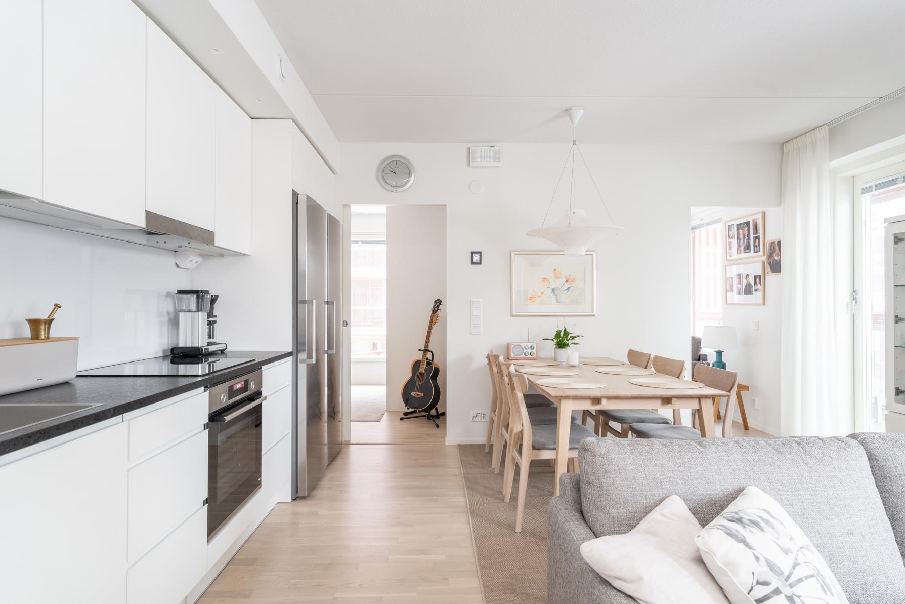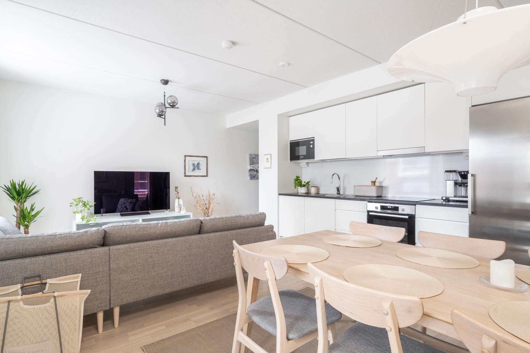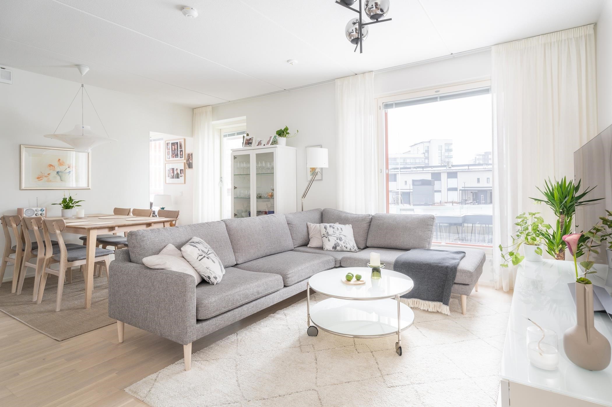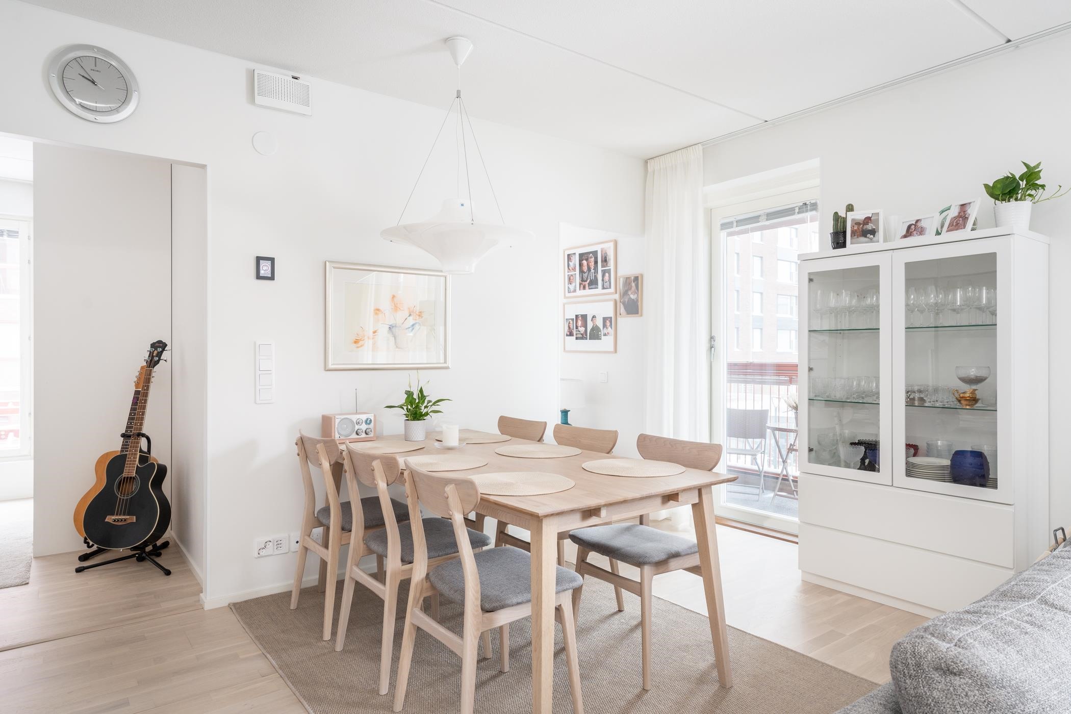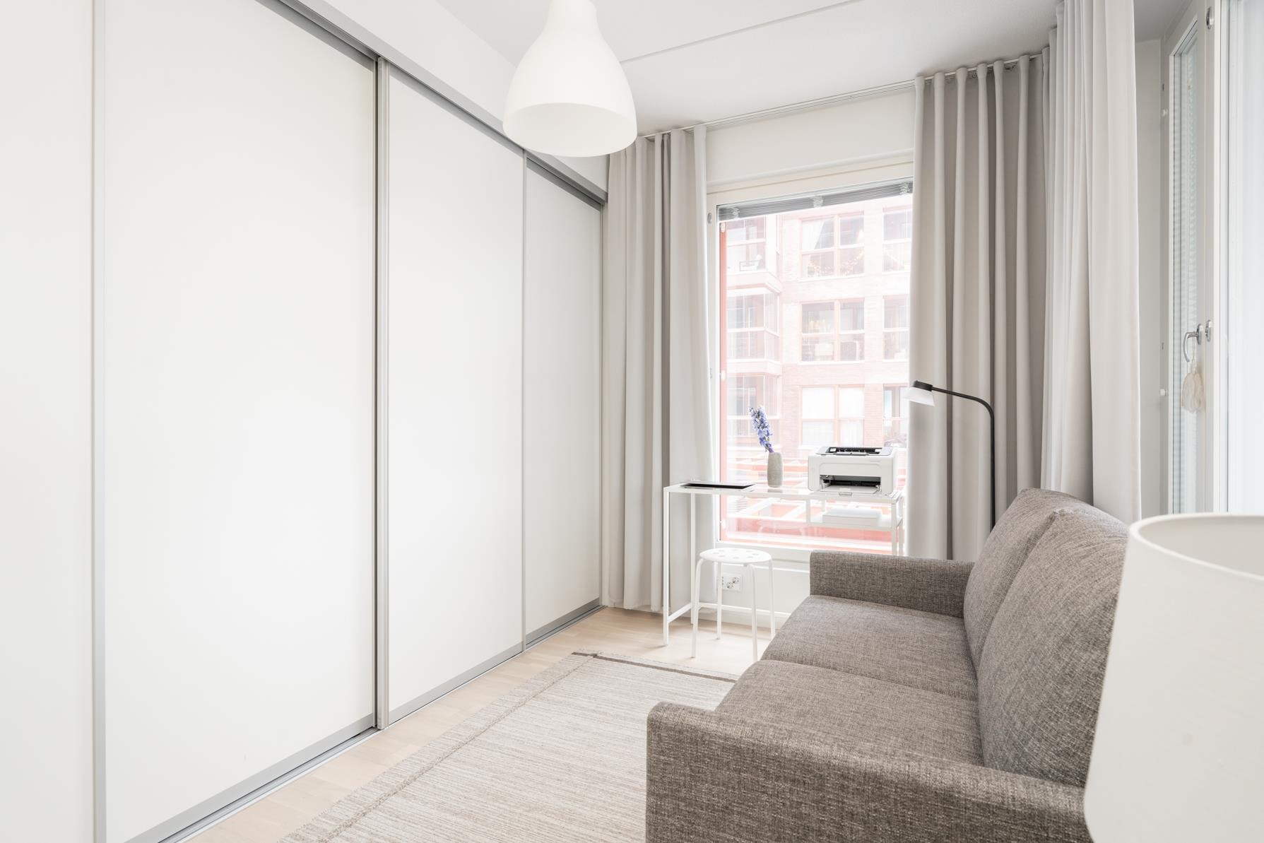 Vesikiertoinen lattialämmitys ja kaukoviileä takaavat miellyttävän asumislämpötilan kaikissa vuodenajoissa. Tilava olohuone ja keittiö muodostavat yhtenäisen, valoisan kokonaisuuden, jossa on runsaasti tilaa yhdessäoloon. Elfa-kaapistot korvaavat vaatehuoneen ja tarjoavat erinomaiset säilytysratkaisut. Pienempi makuuhuone toimii erinomaisesti työtilana tai vierashuoneena, ja vuodesohvan käyttö onnistuu tilan puolesta hyvin.