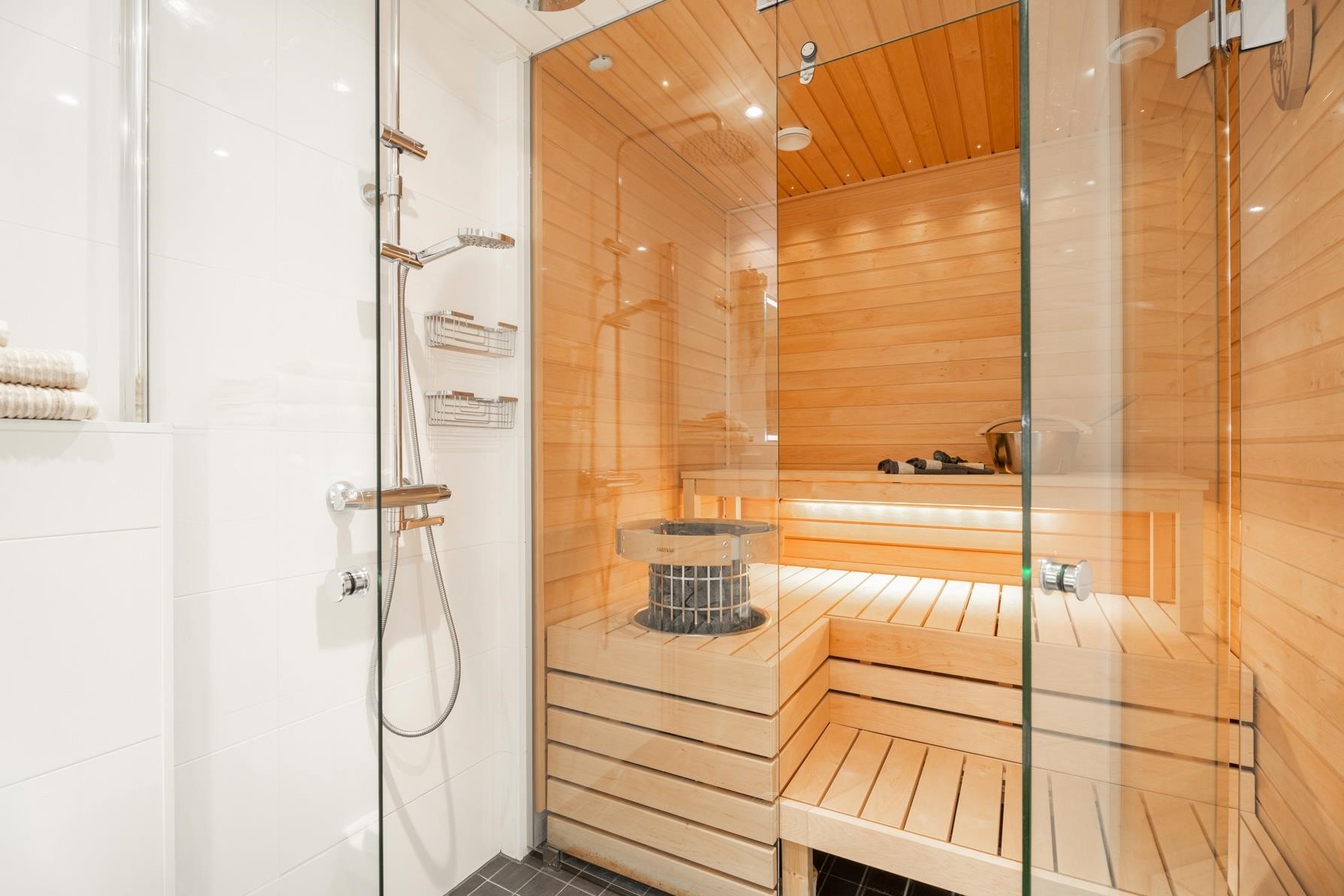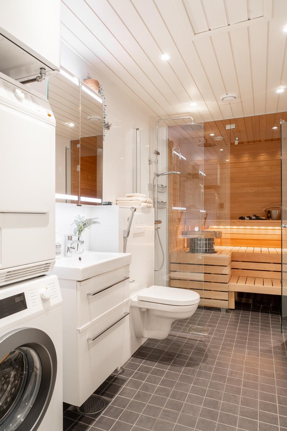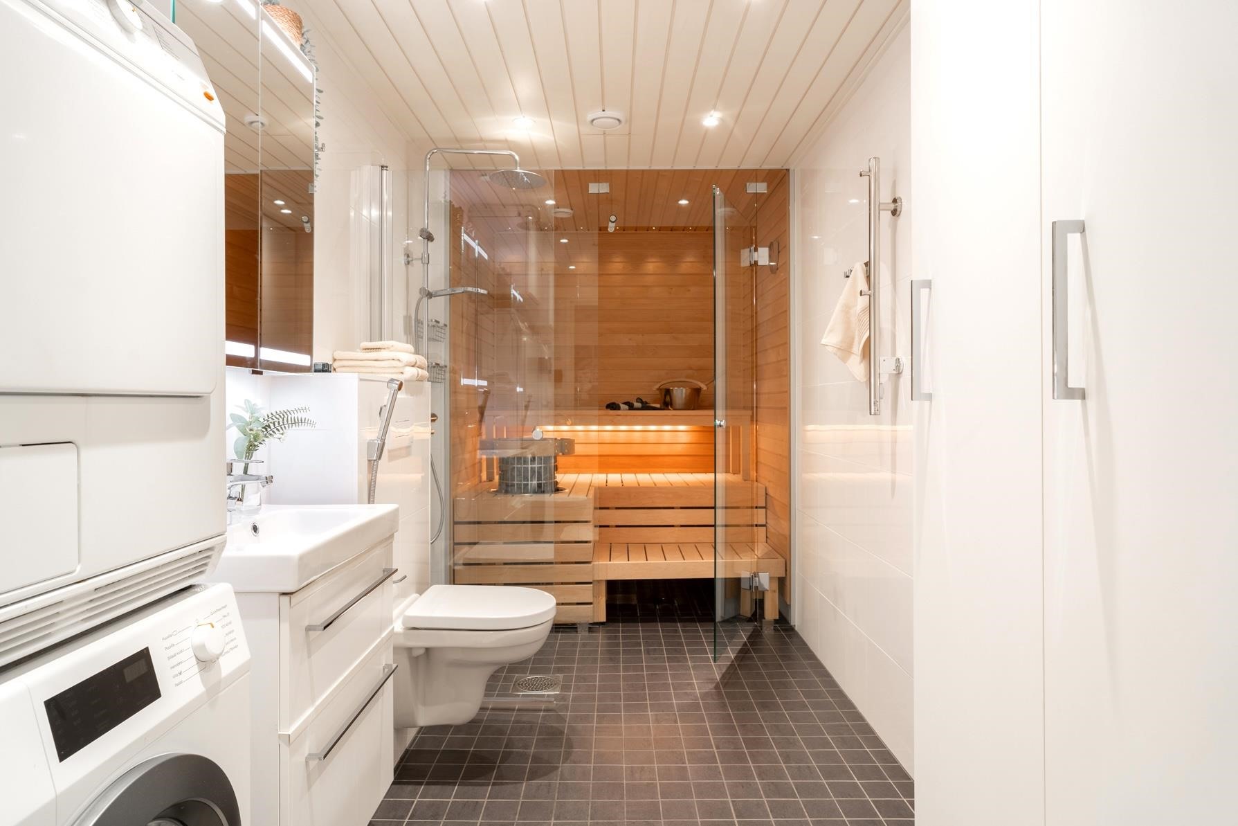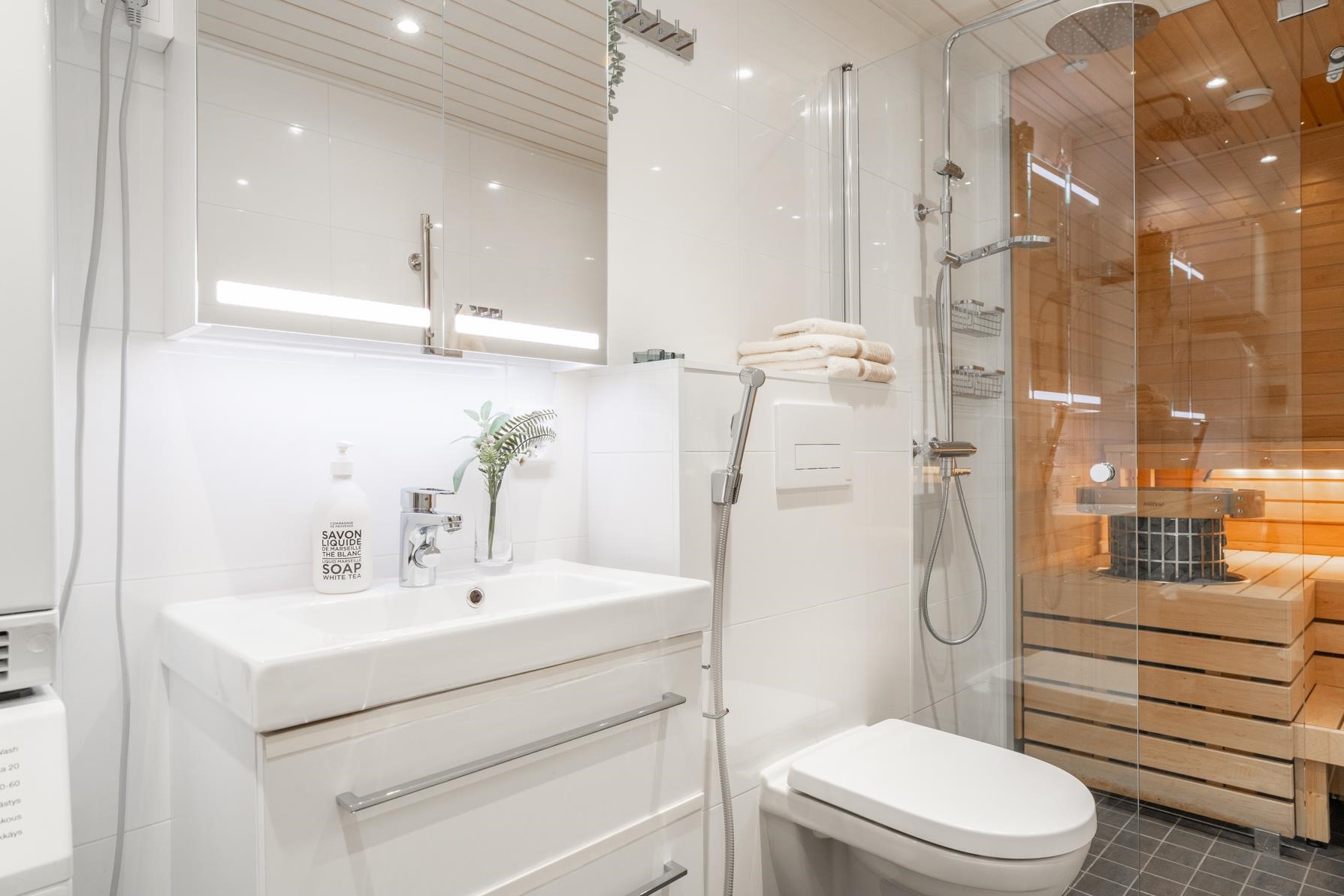 - Saunassa on sähkökiuas. Kylpyhuoneessa on suihku (sadesuihku), suihkuseinä, peilikaappi, kaapit, allaskaappi, pesukoneliitäntä, lattialämmitys, kiinteät valaisimet.