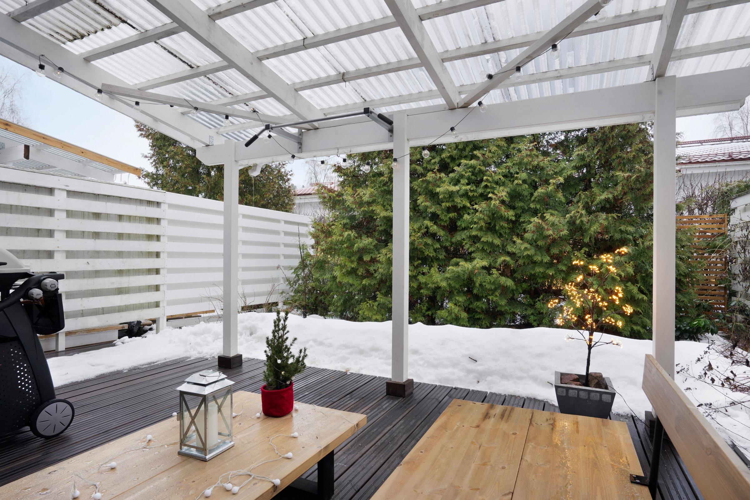 Suojaisa takapiha, iso katettu terassialue.