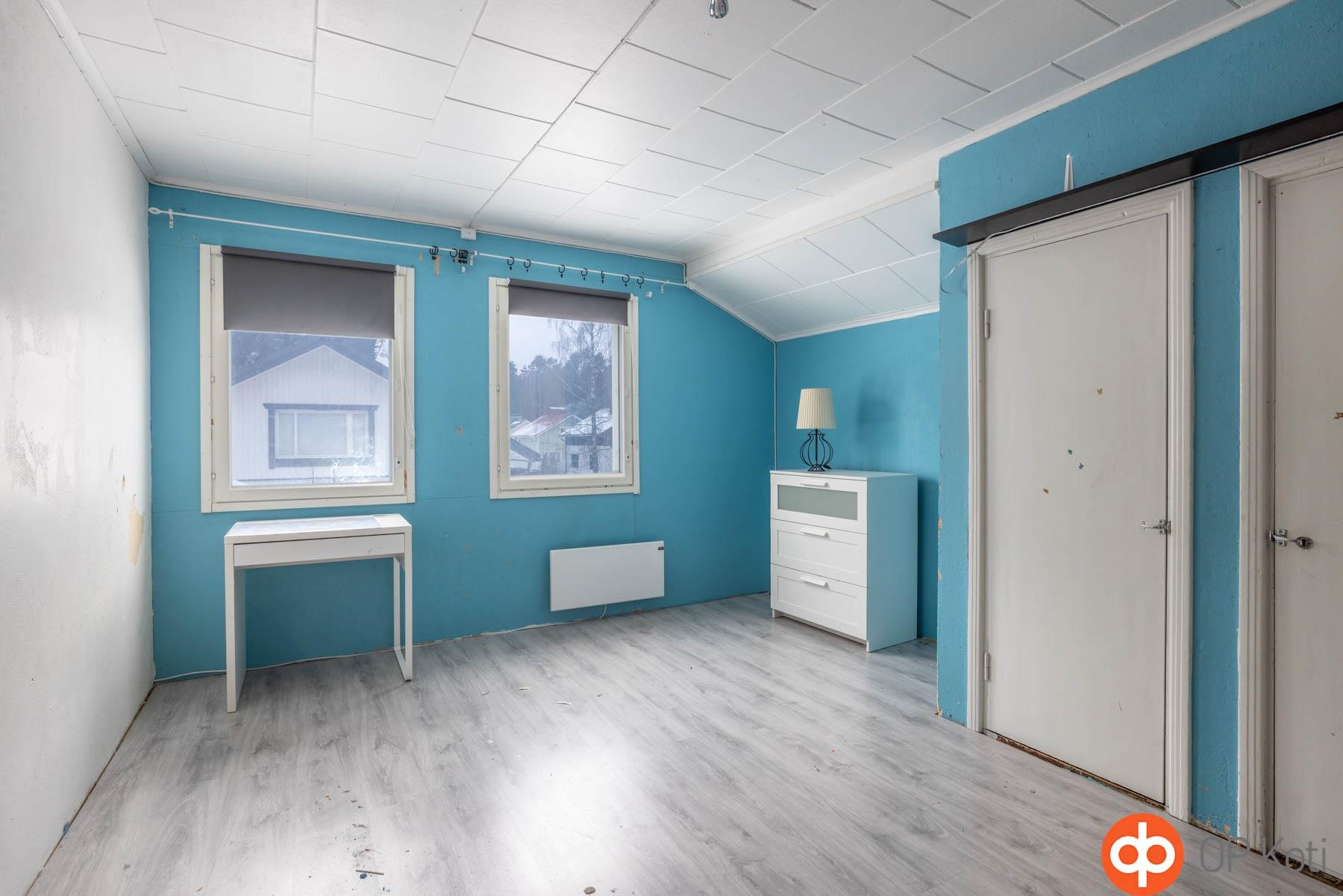 Keittiö: muovimatto, seinillä levyä, betonia, maalia (myyjällä keittiön asentamaton välitilalevy valmiina). Olohuone: laminaatti lattia, seinillä tapettia, betonia ja maalia. Makuuhuone 1: yläkerrassa, laminaattia lattia, seinillä maalia. Sauna: lattia laattaa, seinillä paneelia ja betonia (tilassa suihku ja suihkuseinä). Eteinen: asuttu puoli puulattia, asumaton puoli muovilattia. Wc: kohteessa neljä wc-tilaa, kaksi asutulla ja kaksi asumattomalla puolella, jossa toinen wc-tila keskeneräinen. Kolme huonetta asumaton puoli: kahdessa huoneessa lattia laminaattia, yhdessä muovilattia. Tekninen tila/khh: kellarikerroksessa. Paljon varastotiloja: ..