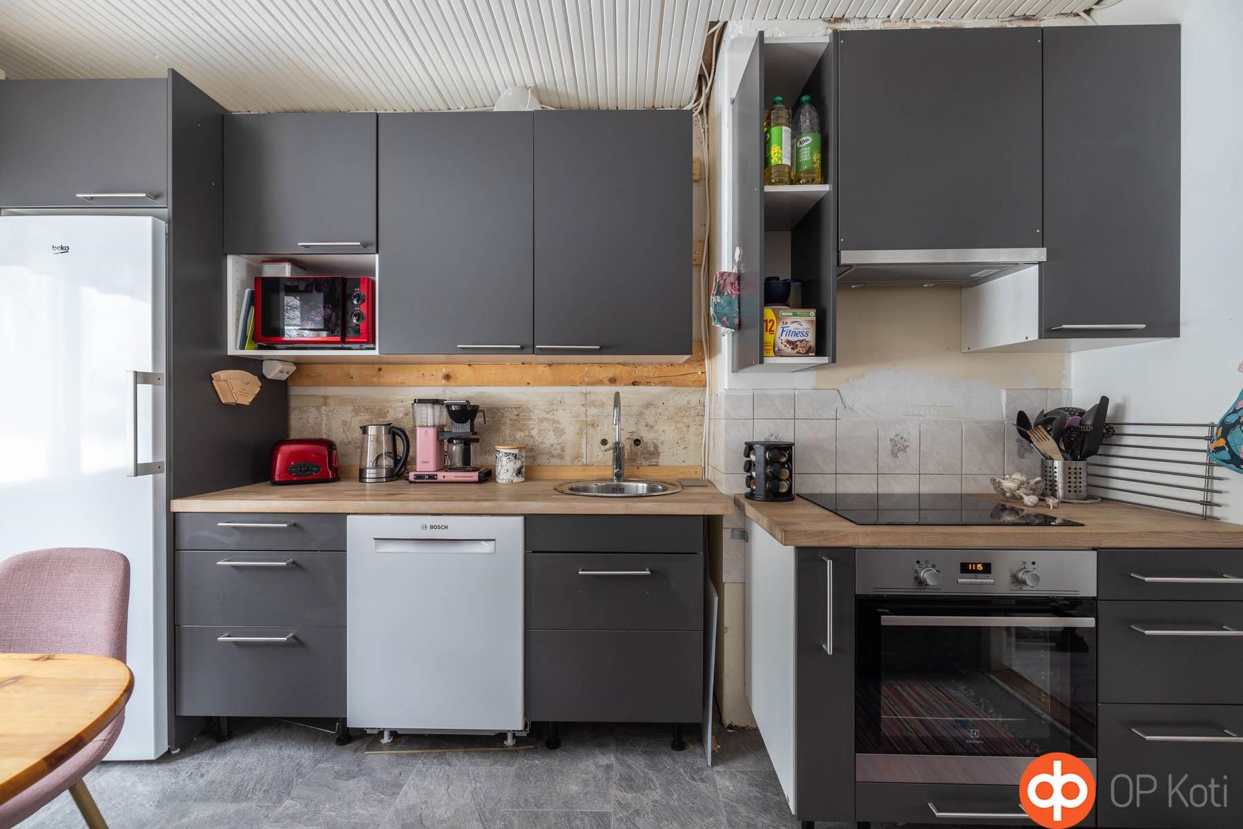 - Jääkaappi v.2015, keraaminen liesi + kiertoilmauuni v. 2019, liesituuletin v.2019, astianpesukone v. 2019, pöytätasojen materiaali puu. Mikroaaltouuni ei kuulu kauppaan.