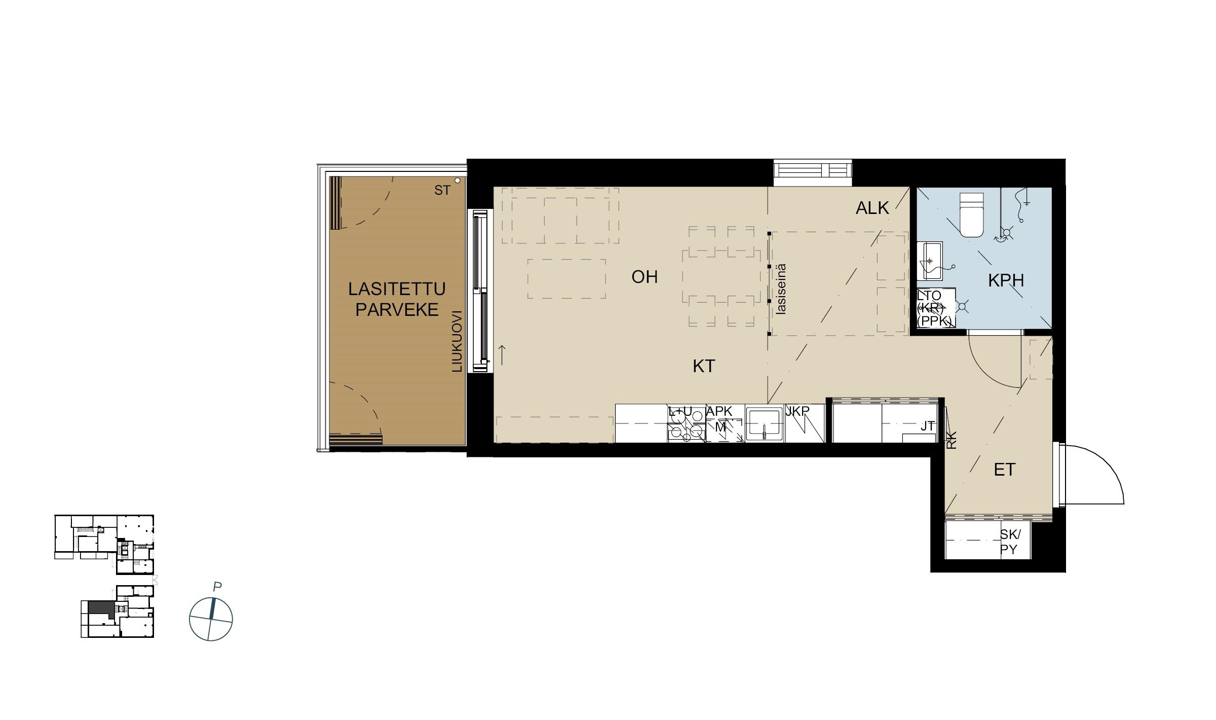 - Keittiökalusteiden ovet ovat maalattua tai lakattua mdf-levyä tai viilupintaisia kalusteovia. Keittiön työpöytätasot ovat kiveä tai kvartsisekoitetta. Keittiön pesuallas on terästä tai komposiittimateriaalia. Ylä- ja alakaappien välissä on välitilalasi. Keittiöissä on induktiotaso, erillisuuni ja mikroaaltouuni. Astianpesukoneet ja kylmäkalusteet ovat kalusteovipeitteisiä. Asunnoissa on pohjapiirustusten mukaisesti joko jääkaappipakastin tai erilliset jääkaappi ja kaappipakastin.