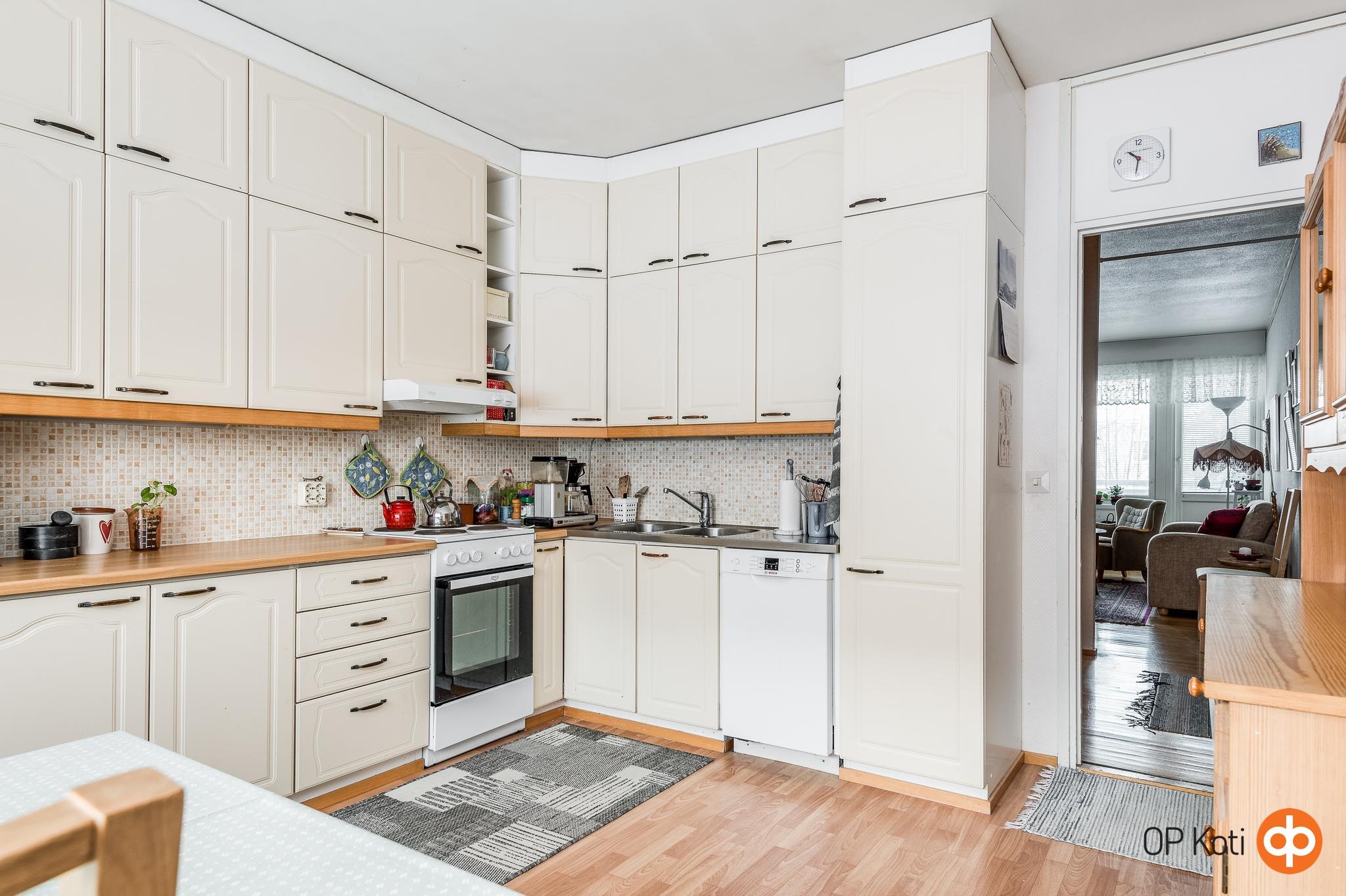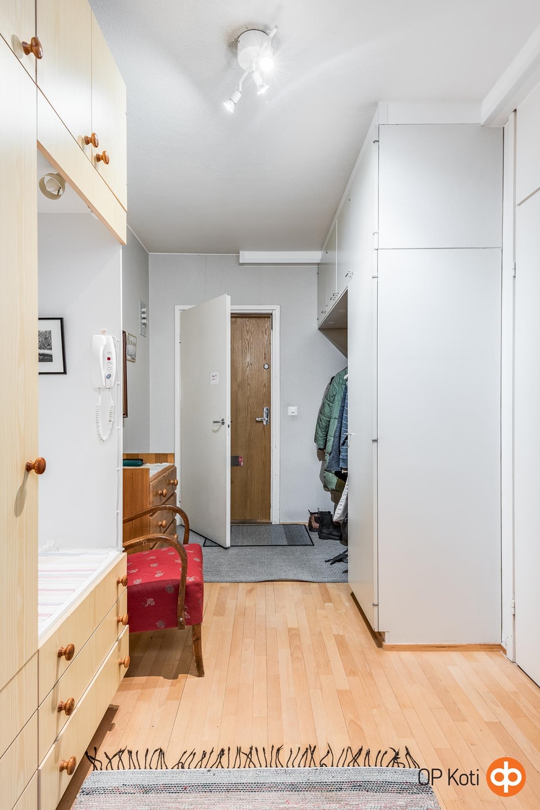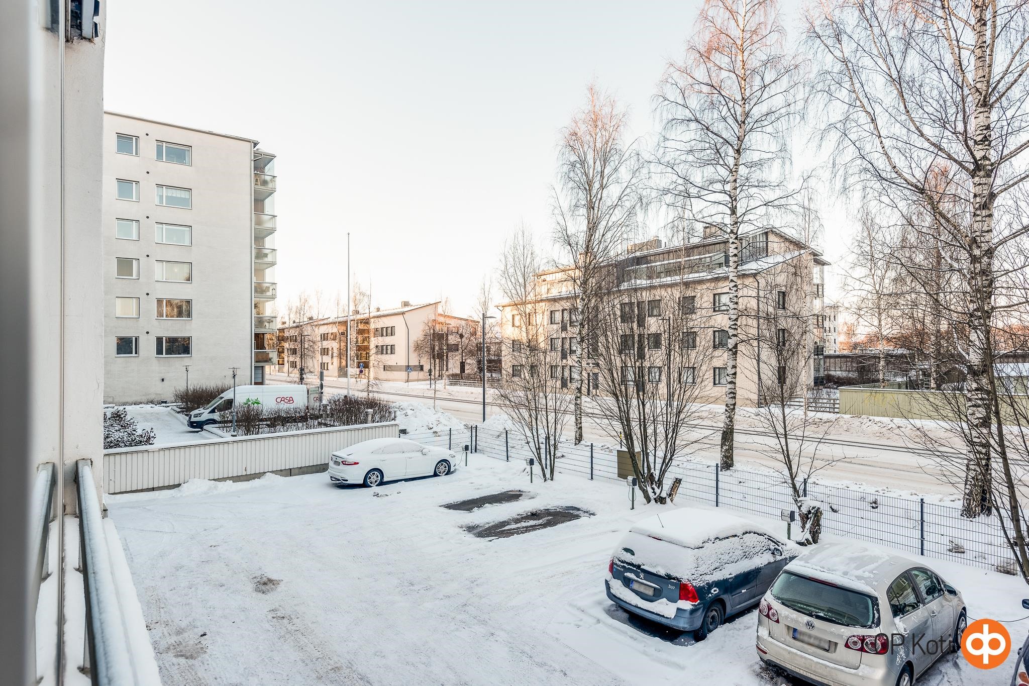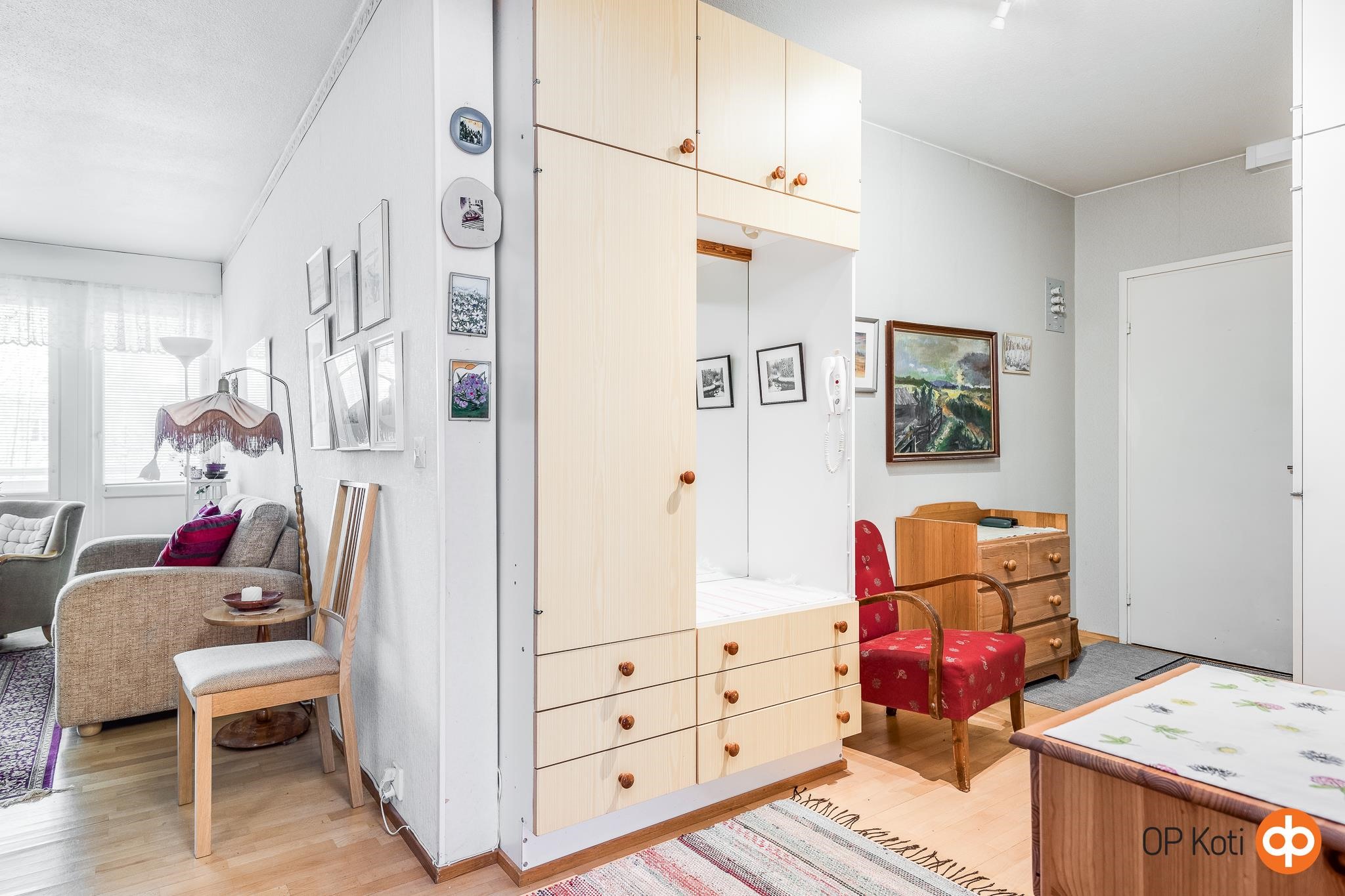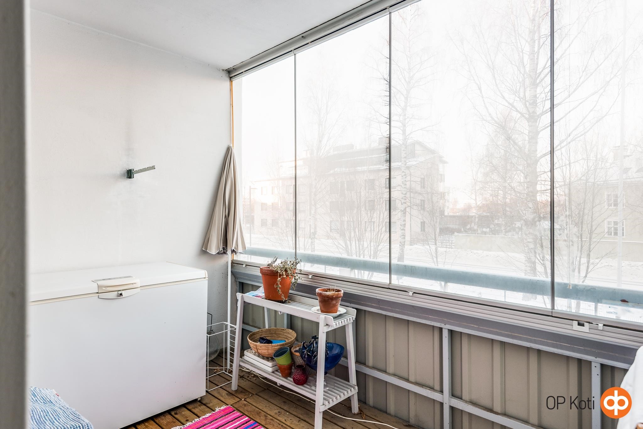 Läpitalon huoneistossa keittiö on selkeästi omana tilanaan. Makuuhuoneessa on runsaasti kaappitilaa, lähes koko seinän mitalta. Pesuhuoneessa on suihkukaappi, joten roiskeet pysyvät rajatulla alueella. Saat sovitettua tilaan myös oman pyykinpesukoneen. Kivana lisänä on kadun suuntaan avautuva lasitettu parveke.