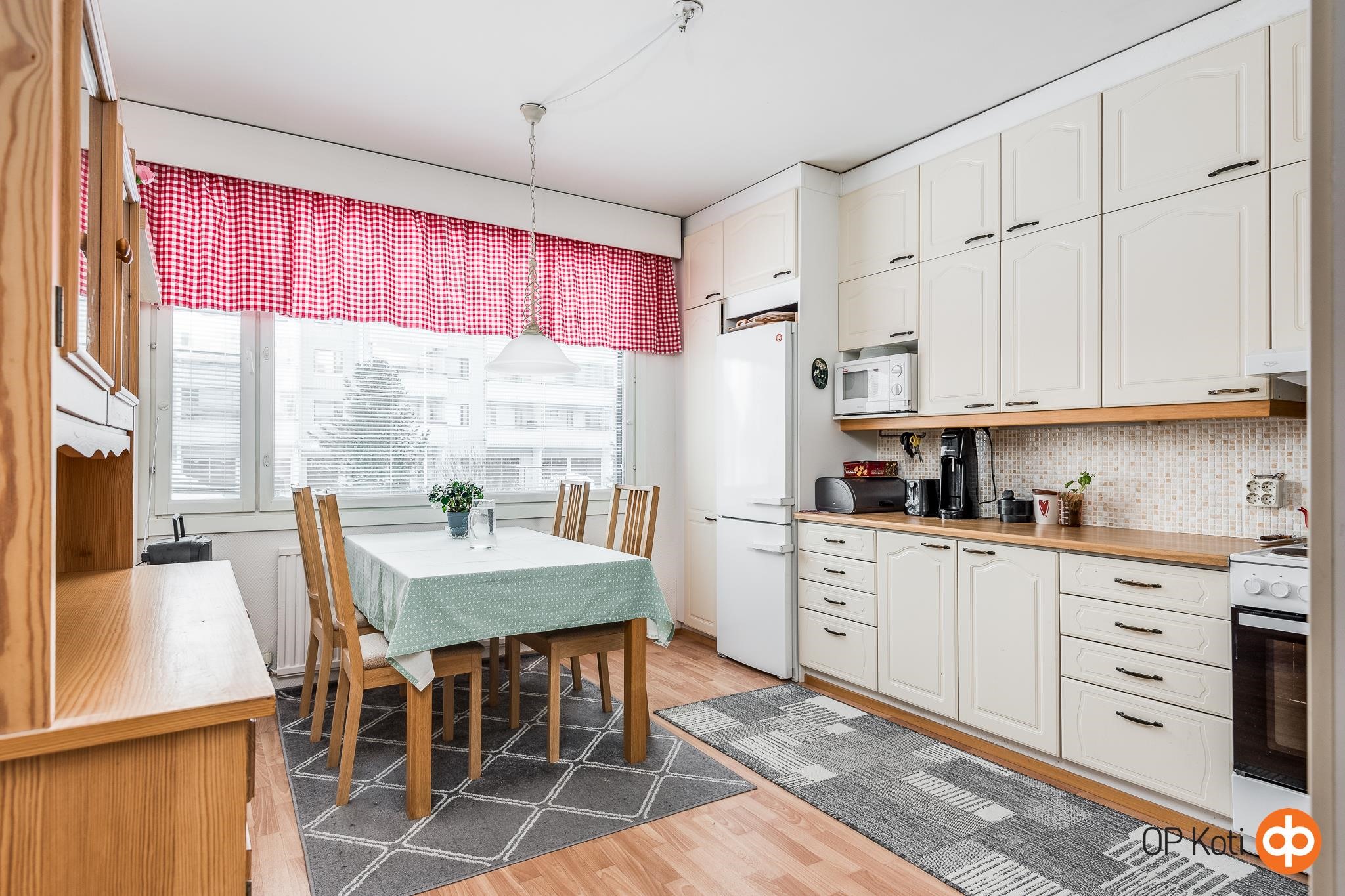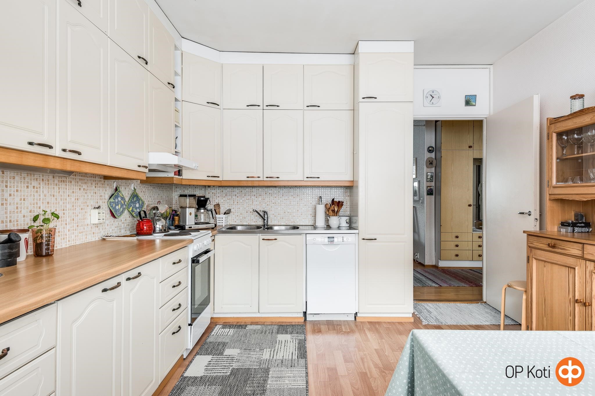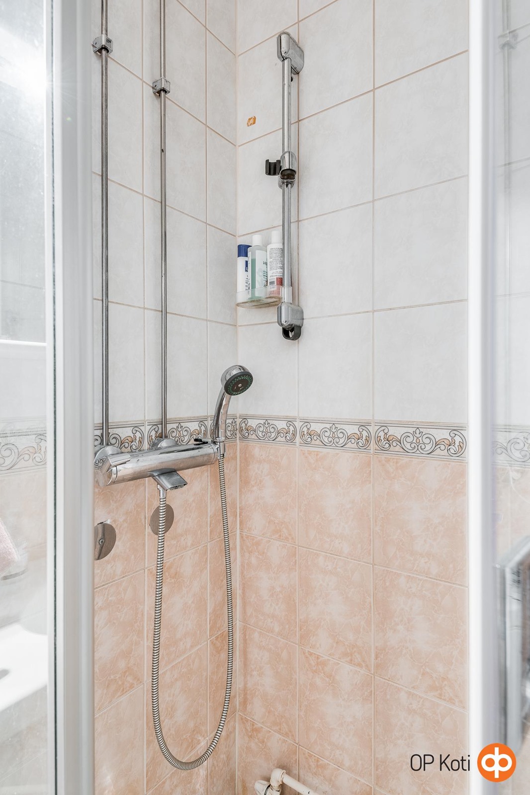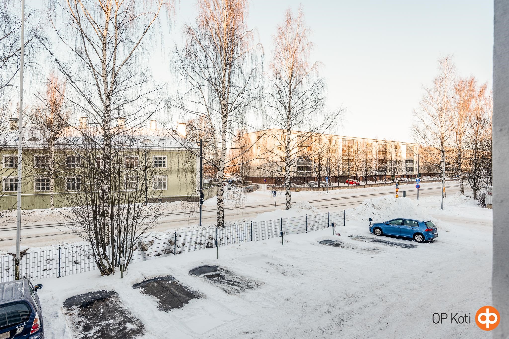 Läpitalon huoneistossa keittiö on selkeästi omana tilanaan. Makuuhuoneessa on runsaasti kaappitilaa, lähes koko seinän mitalta. Pesuhuoneessa on suihkukaappi, joten roiskeet pysyvät rajatulla alueella. Saat sovitettua tilaan myös oman pyykinpesukoneen. Kivana lisänä on kadun suuntaan avautuva lasitettu parveke.