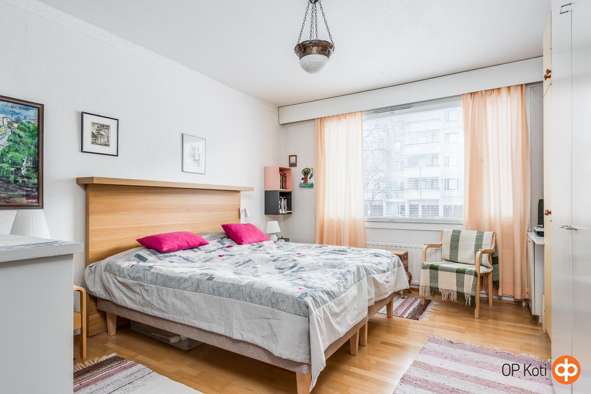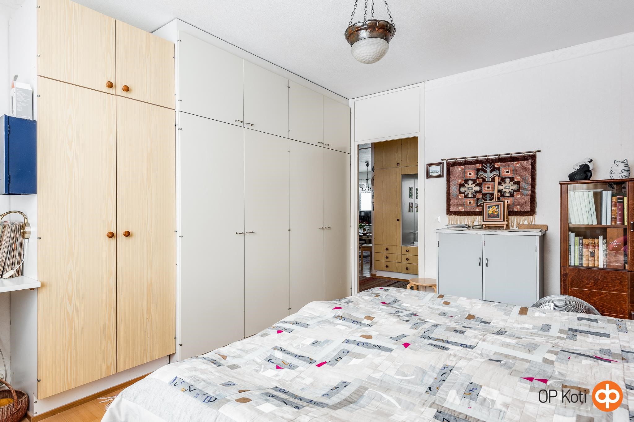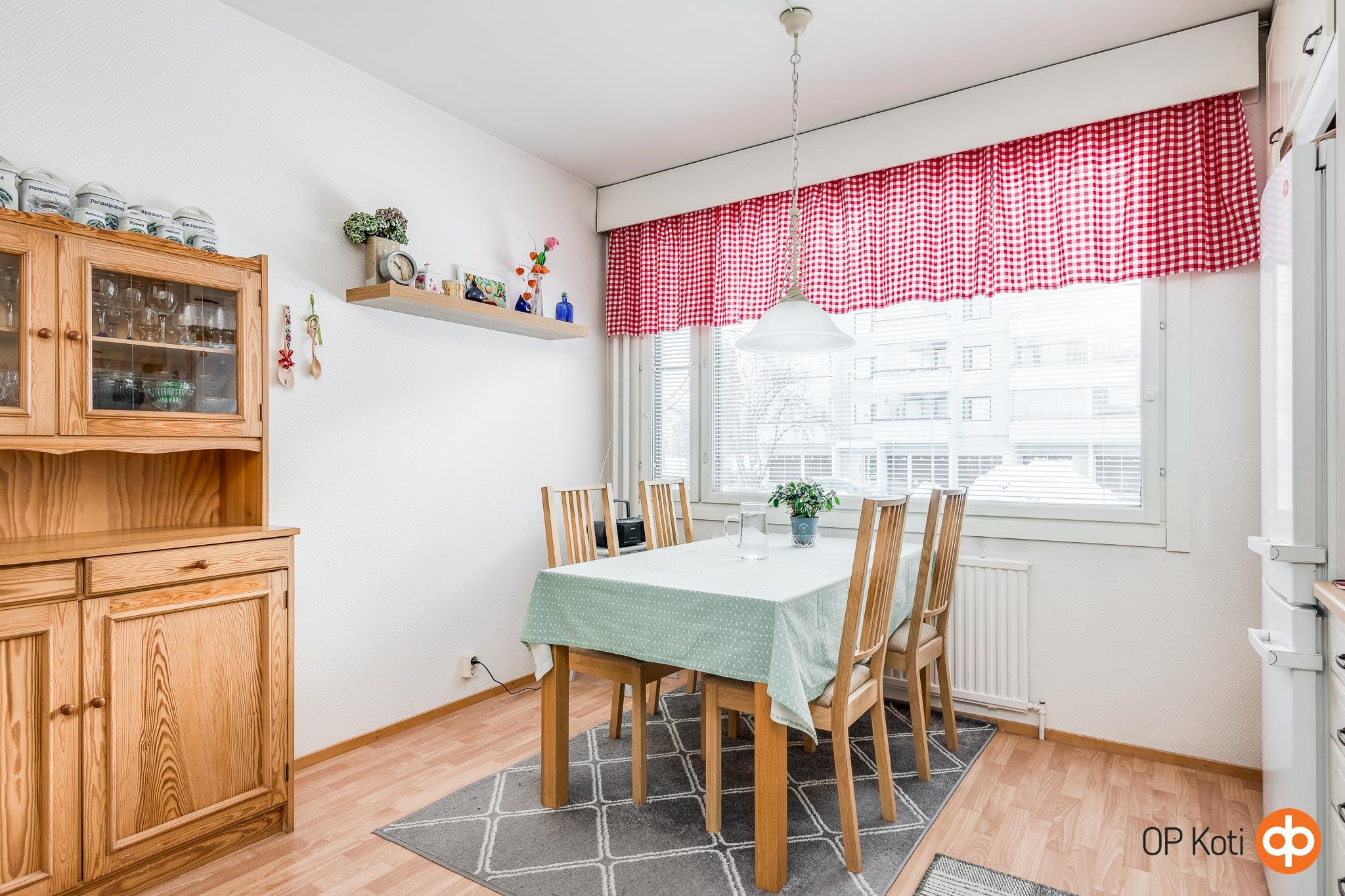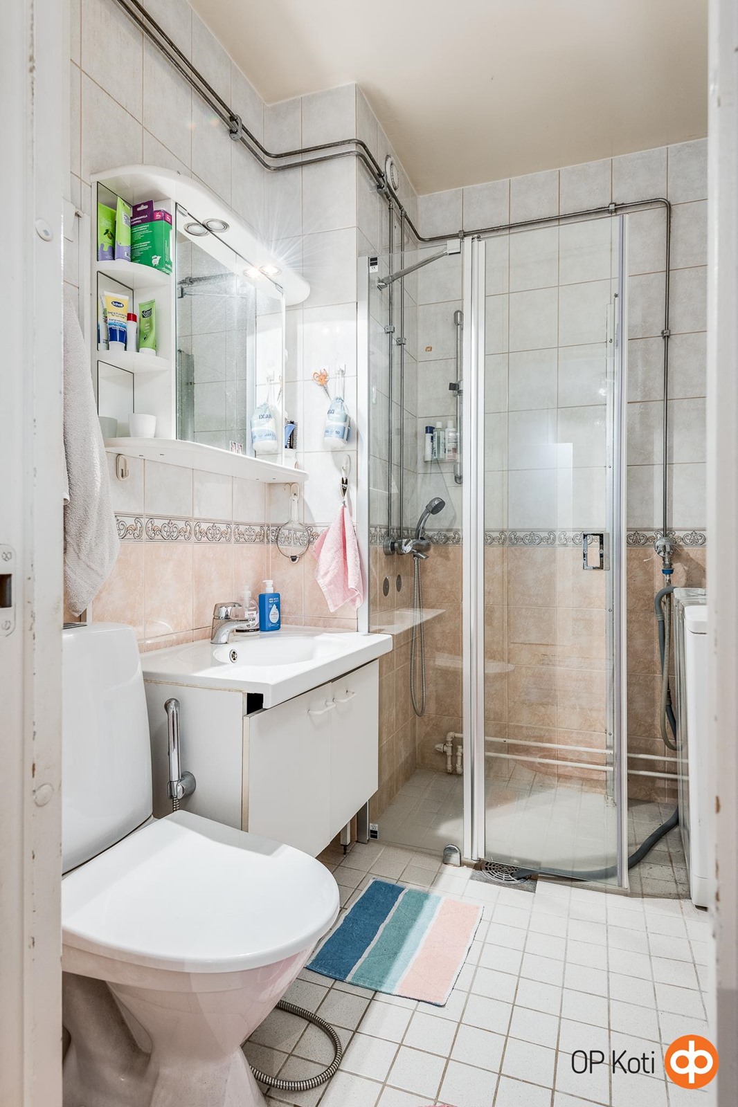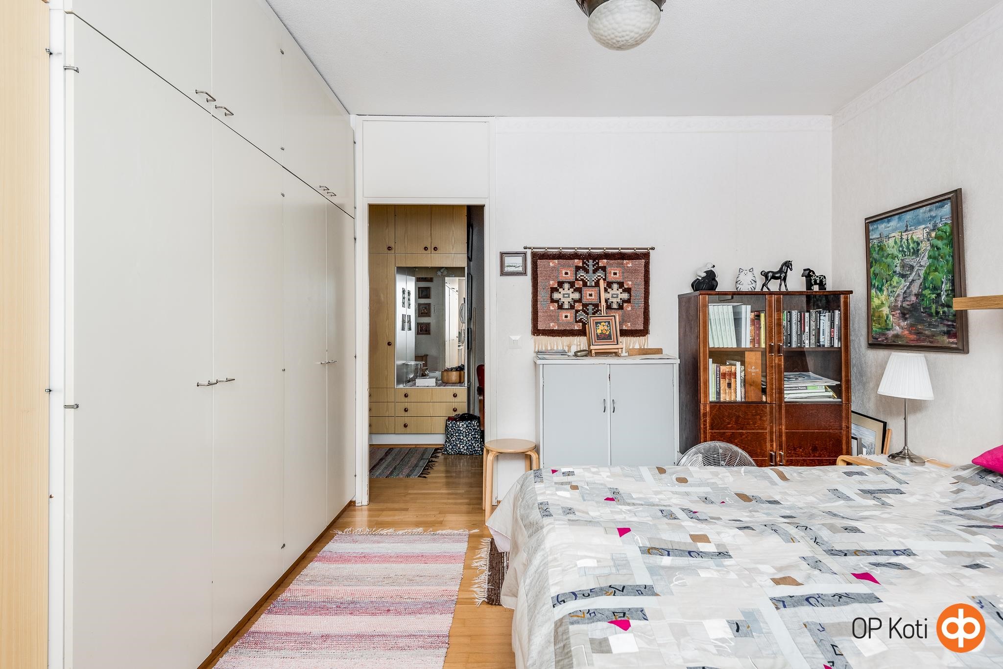 Läpitalon huoneistossa keittiö on selkeästi omana tilanaan. Makuuhuoneessa on runsaasti kaappitilaa, lähes koko seinän mitalta. Pesuhuoneessa on suihkukaappi, joten roiskeet pysyvät rajatulla alueella. Saat sovitettua tilaan myös oman pyykinpesukoneen. Kivana lisänä on kadun suuntaan avautuva lasitettu parveke.