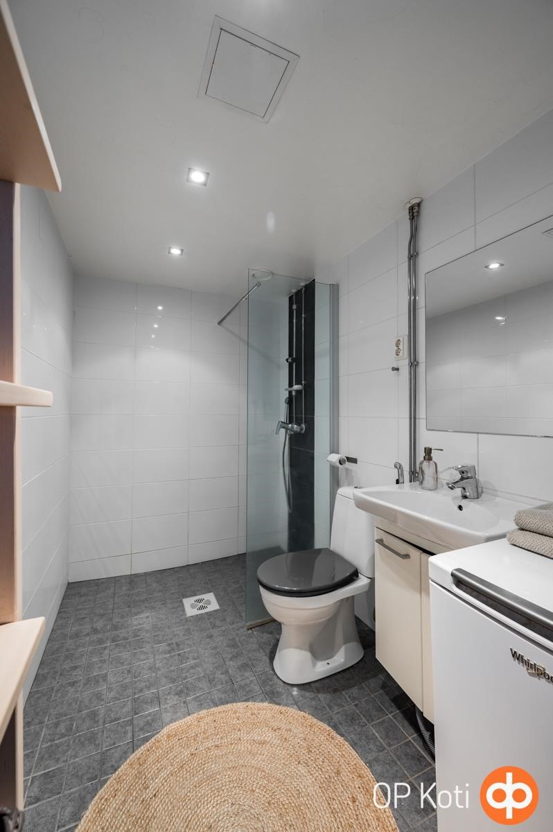 - Kylpyhuone, suihku, suihkuseinä, peilit, allaskaappi, pesukoneliitäntä, lattialämmitys, kiinteät valaisimet.