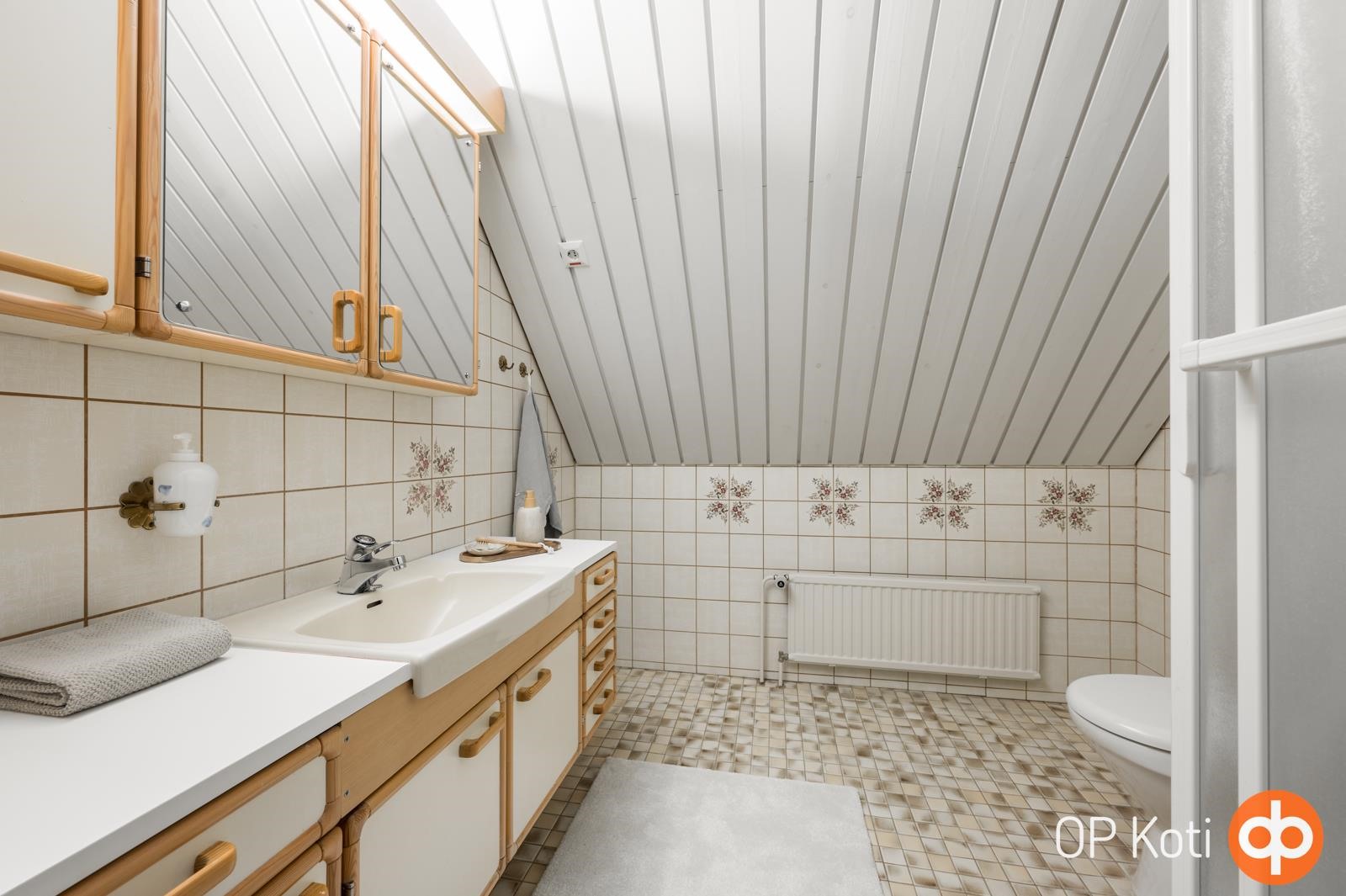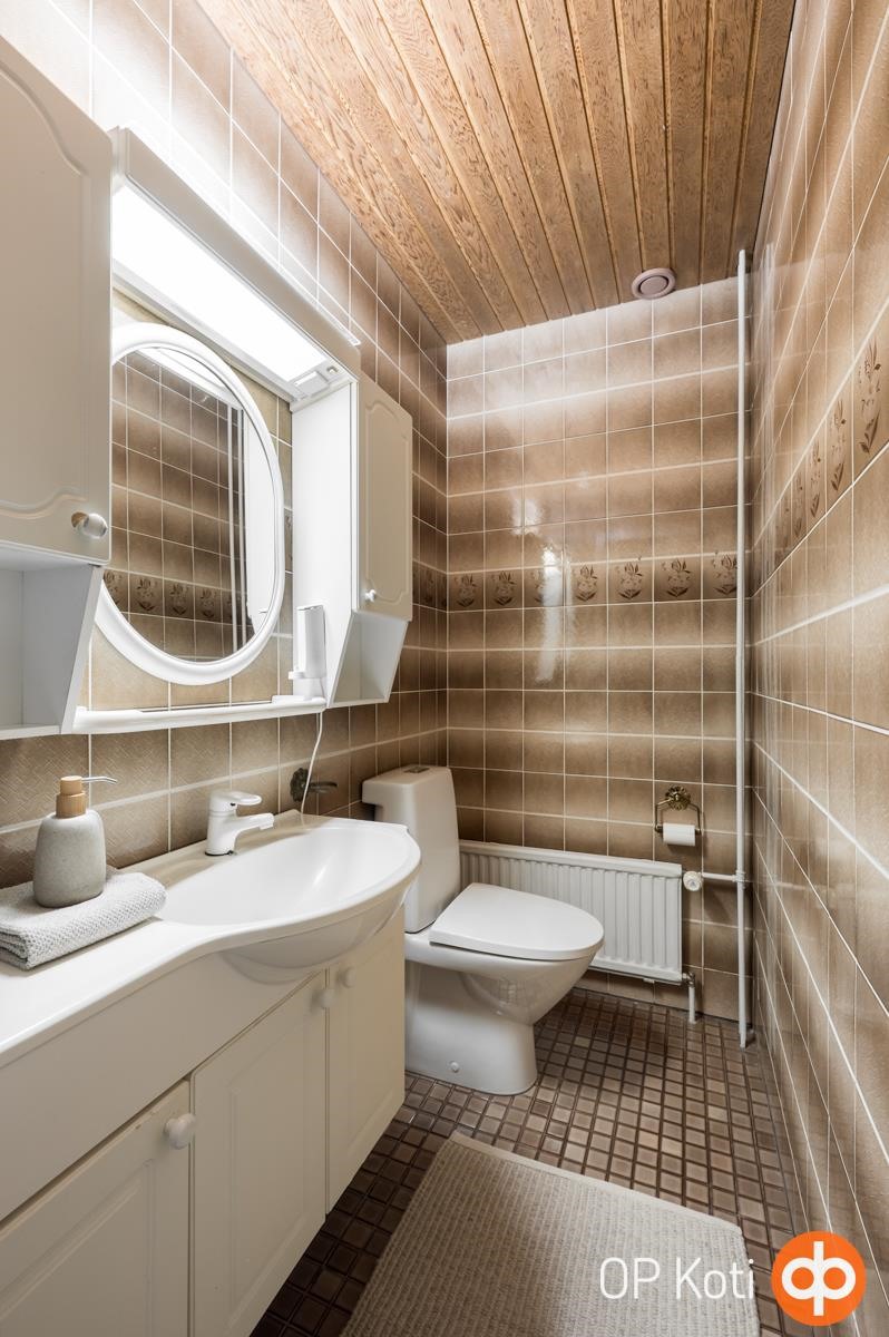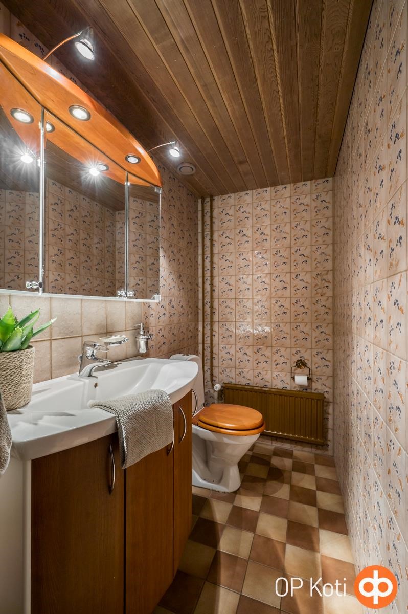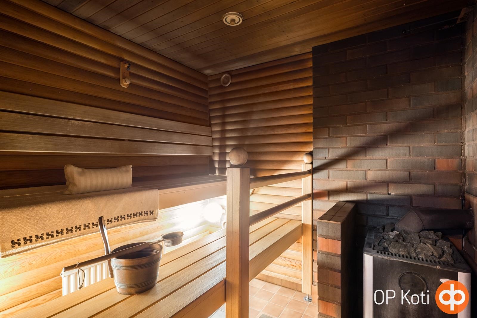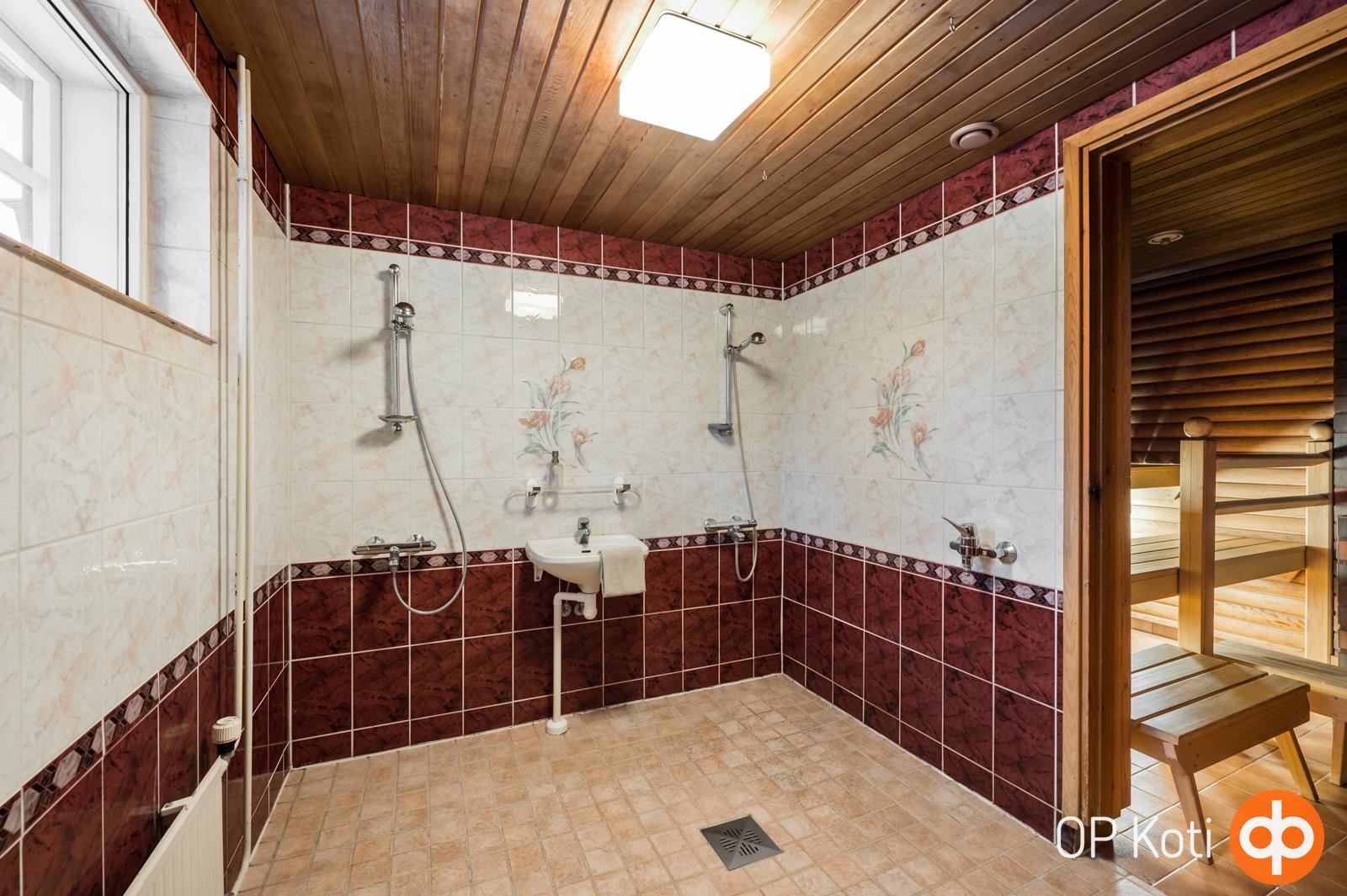 - Sauna, puukiuas, kylpyhuone, erillinen wc 3 kpl, suihku, pesukoneliitäntä, lattialämmitys pohjakerros, vesikiertoinen, kiinteät valaisimet.