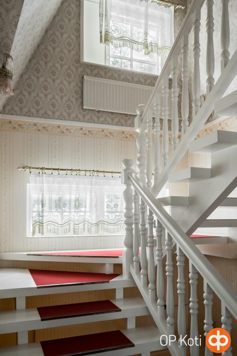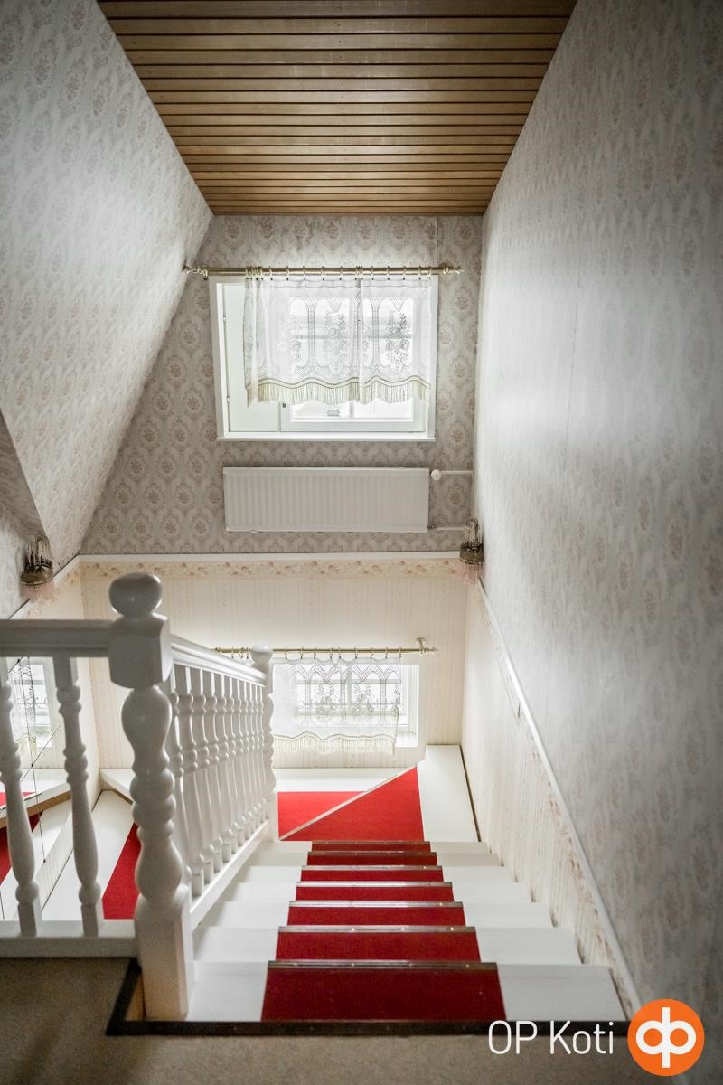 Lattiamateriaalit: yläkerta muovimatto, keskikerros parketti, pohjakerros laatta. Seinämateriaalit: tapetti/maali, pesutiloissa kaakeli.