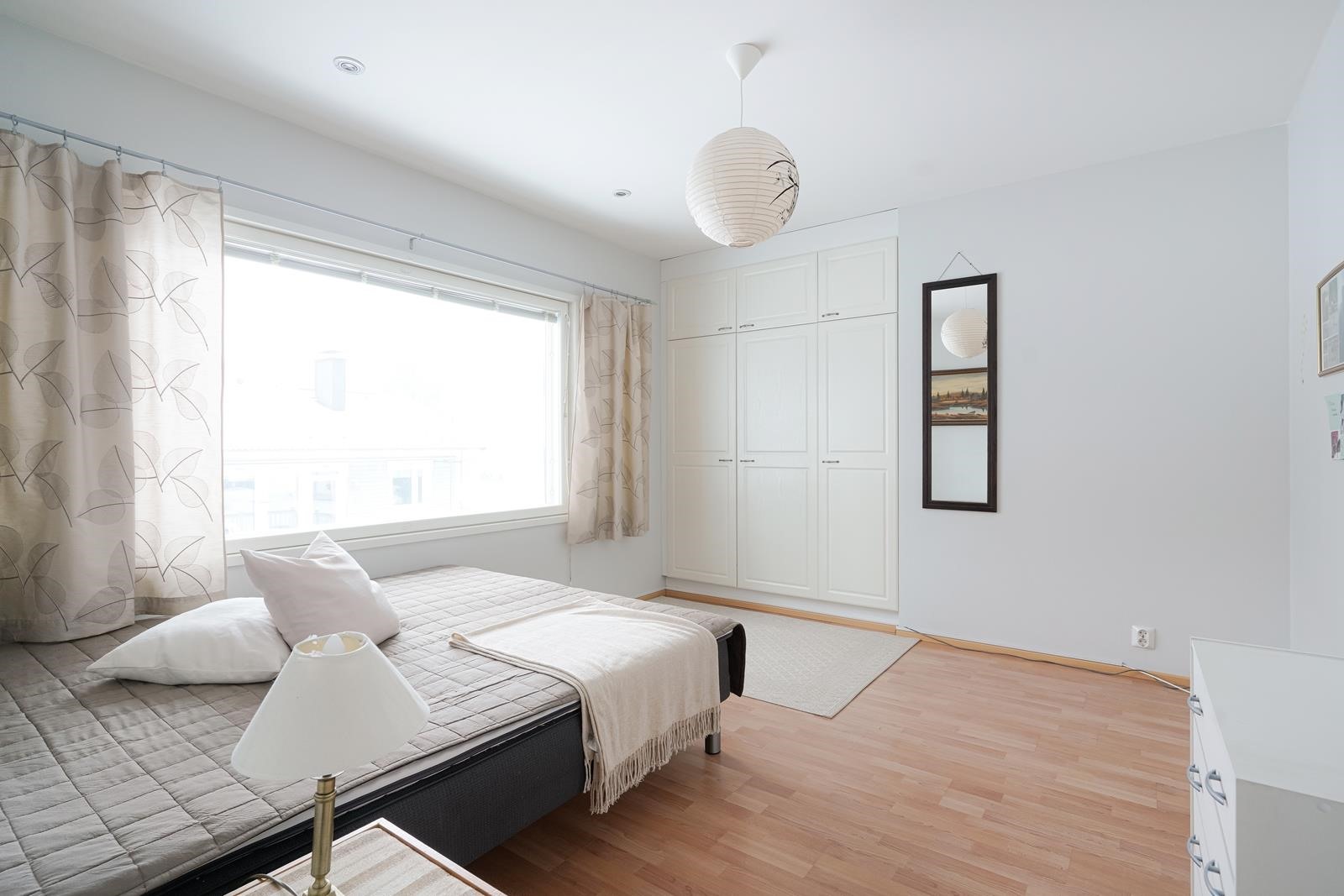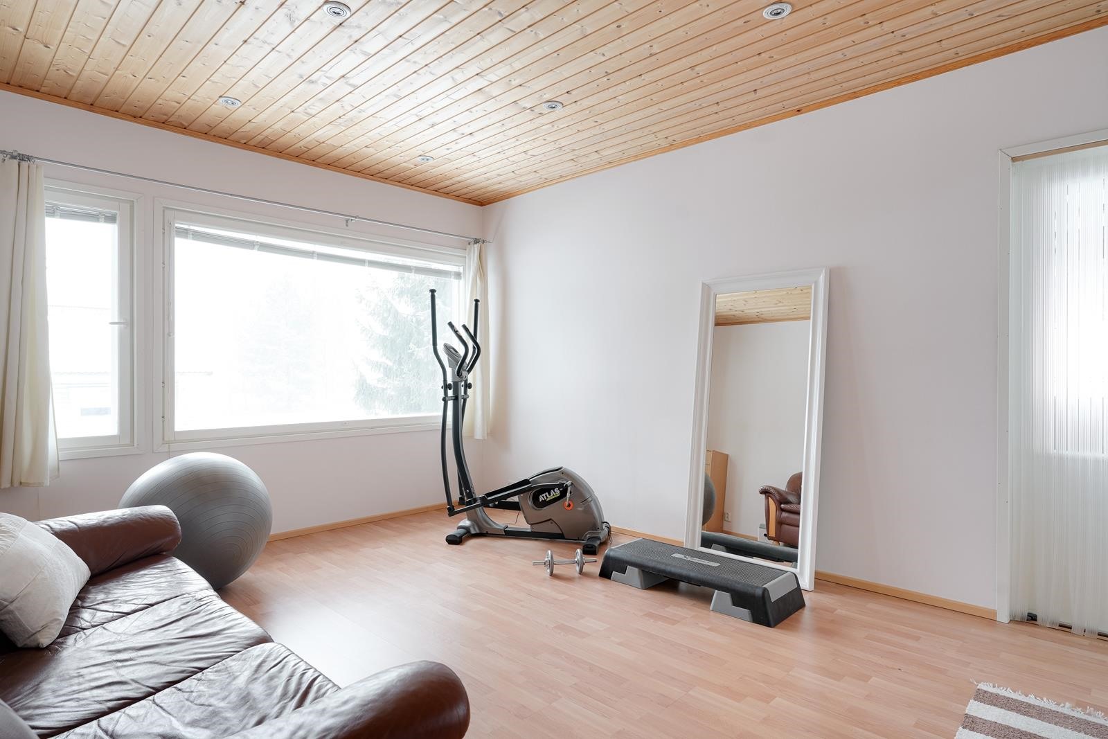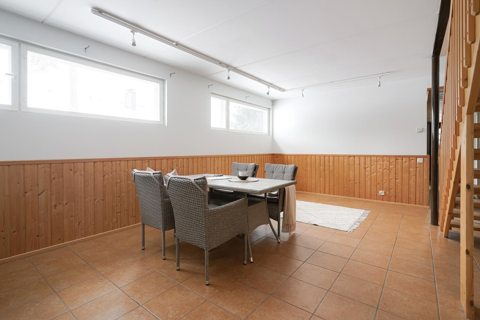 Makuuhuoneita on yhteensä kuusi, joista neljä yläkerrassa ja kaksi alakerrassa. Eikä alakerrassakaan ole pulaa oleskelutilasta, sillä portaikon aula mahdollistaa vaikka mitä ratkaisuja. Sen lisäksi alakerrasta löytyy todella tilava kodinhoitohuone ja paljon varastotilaa.