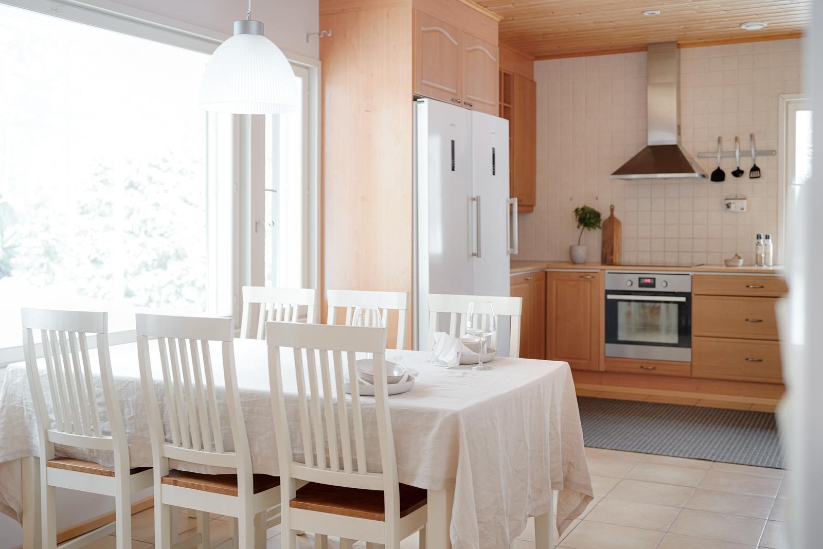 Keittiö on tilava niin säilytystilojen kuin laskutilan osalta. Tänne mahtuu isokin perhe kokkailemaan ja syömään yhdessä.